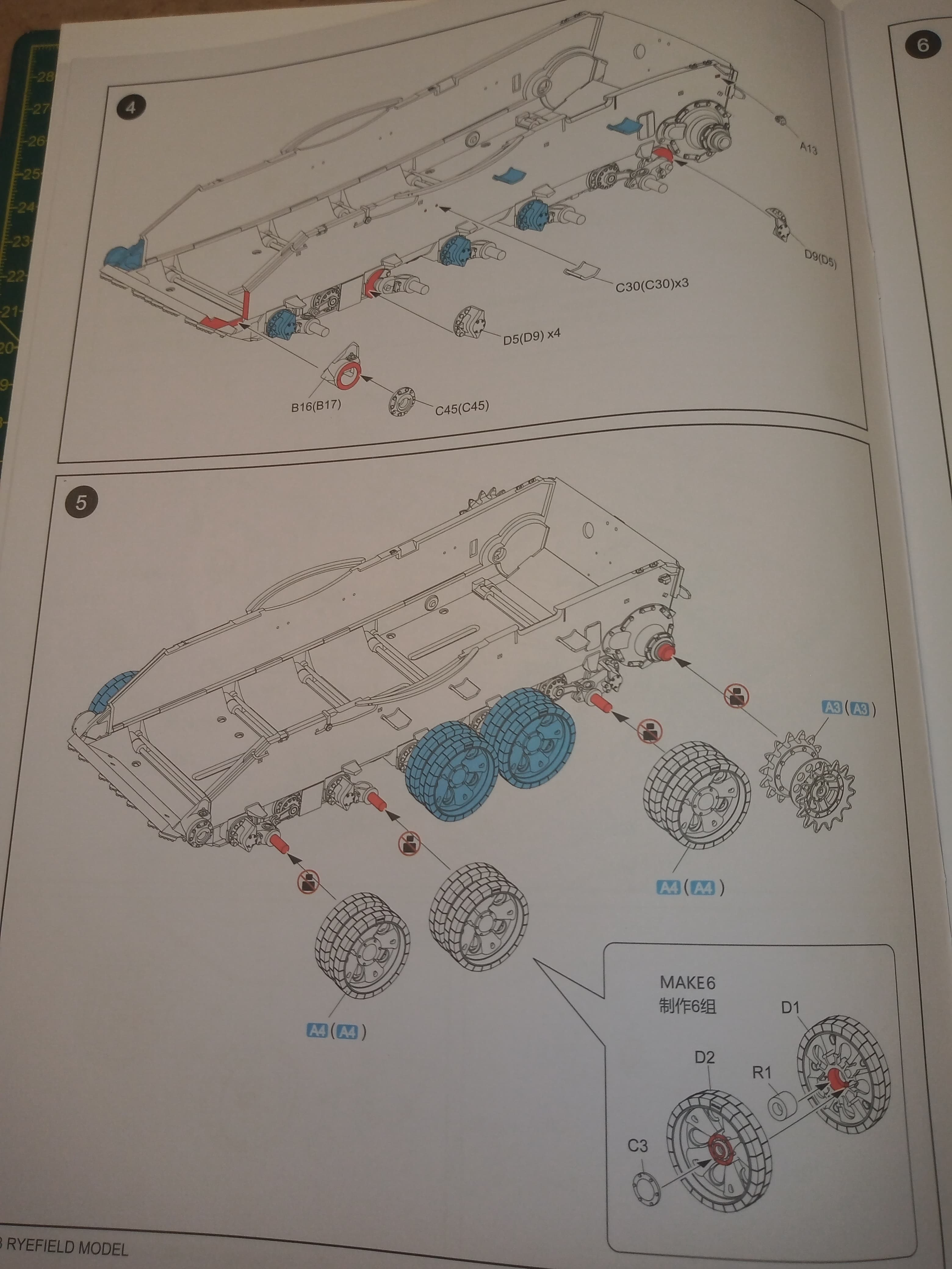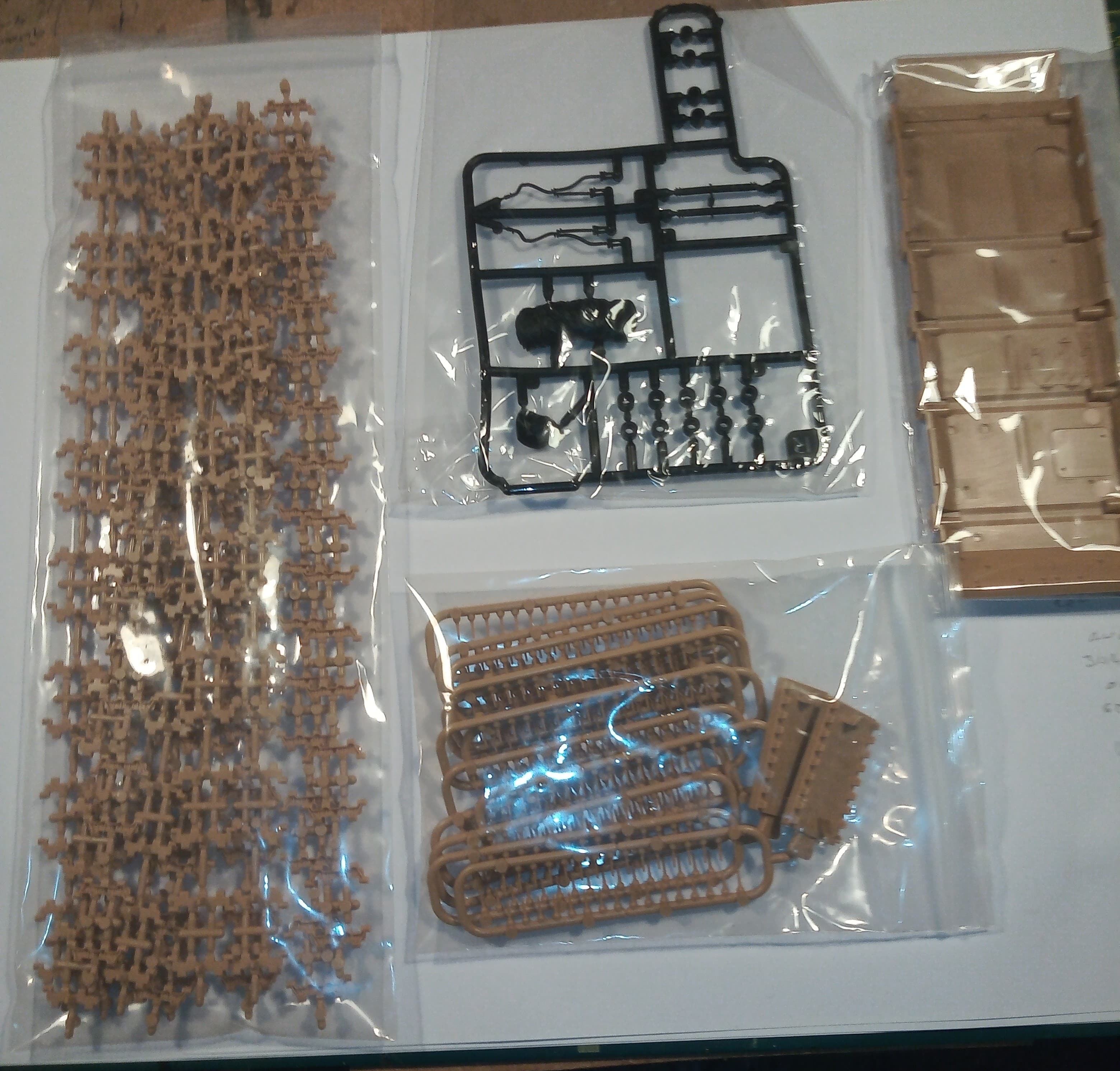 There are 13 main sprues in the nicely detailed box, 13 track link sprues and some link pin sprues. A 3D print for the mantlet cover, clear sprue, wire and string for the recovery ropes, and the normal nice colour coded instruction booklet going through 30 stages upto the paint options.