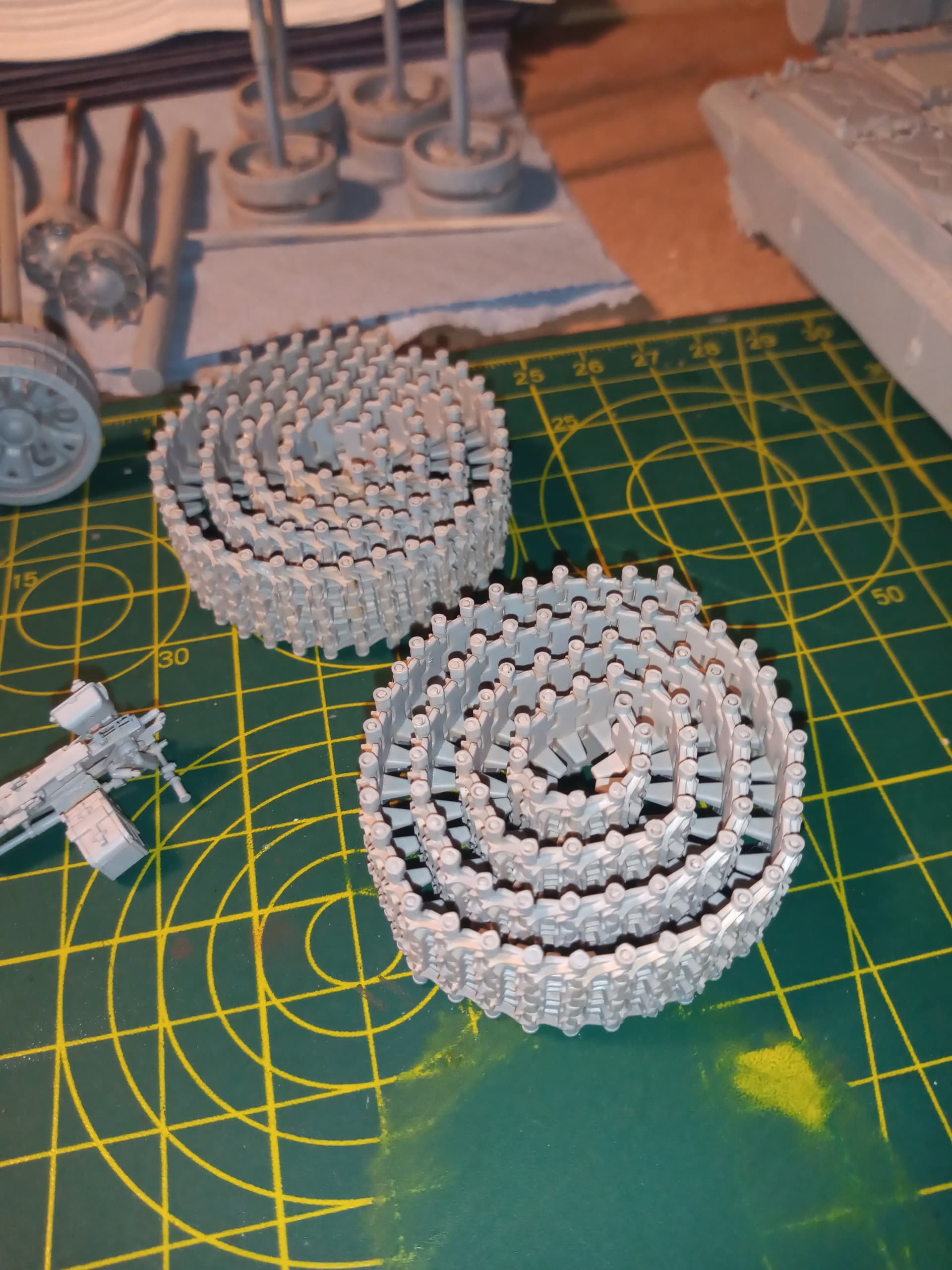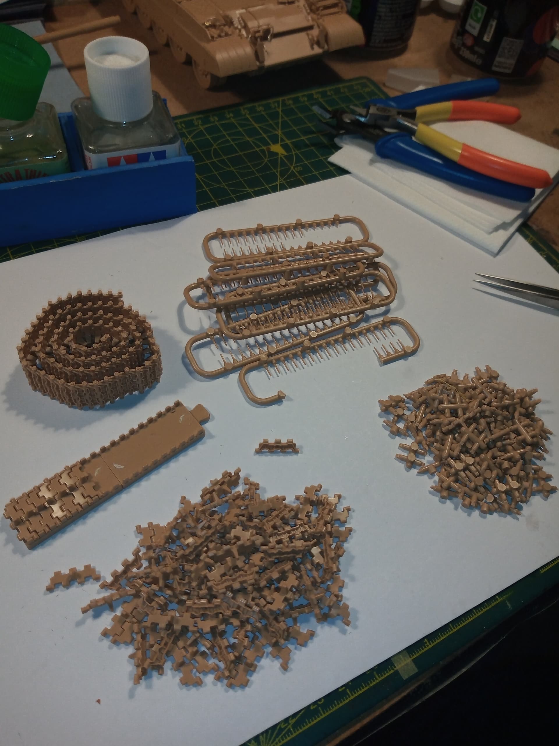 Managed to get one track run complete. It’s a straightforward process and the time consuming part is cutting the links from their sprue. I managed to get that done fairly cleanly so there was hardly any clean up needed.