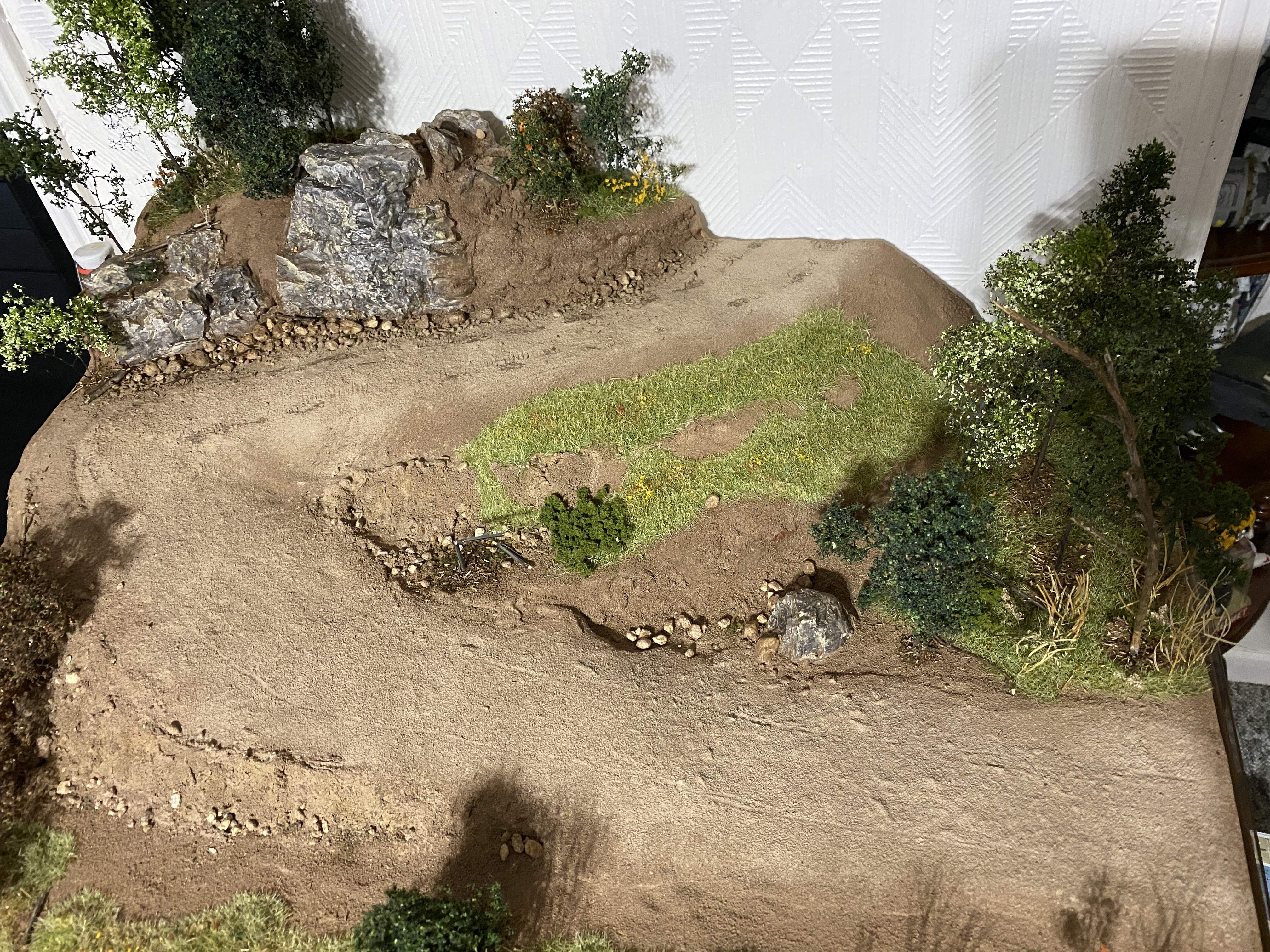 Its looking great so far and loving the detail. If I can make one very little suggestion from experience @Venomous85, if the track surface is mud or dirt/loose stone bits, on the sharp corner, (and this applies if the tanks are going up or down ) there will be alot more evidence of the tanks and heavy vehicles making the turn. They would be travelling up or down very slowly and that is a very sharp turn for a tank, so there will be a lot of stick pulling and the tracks will dig in and make a lot of mess in a turning arc as they navigate around the bend. If it is a loose surface then the inside and outside of the bend will be pretty churned up. Hope you dont mind me saying, but you have done such a cracking job so far…