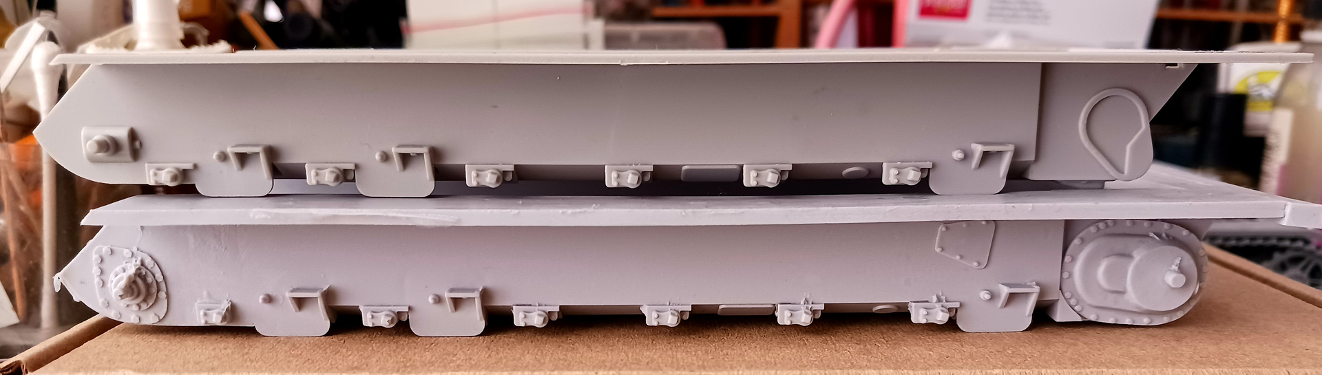 Length of both hulls is equal and locations of idler/drive wheels match on both hulls.I don’t think one will need additional tracks when using SP Designs hull