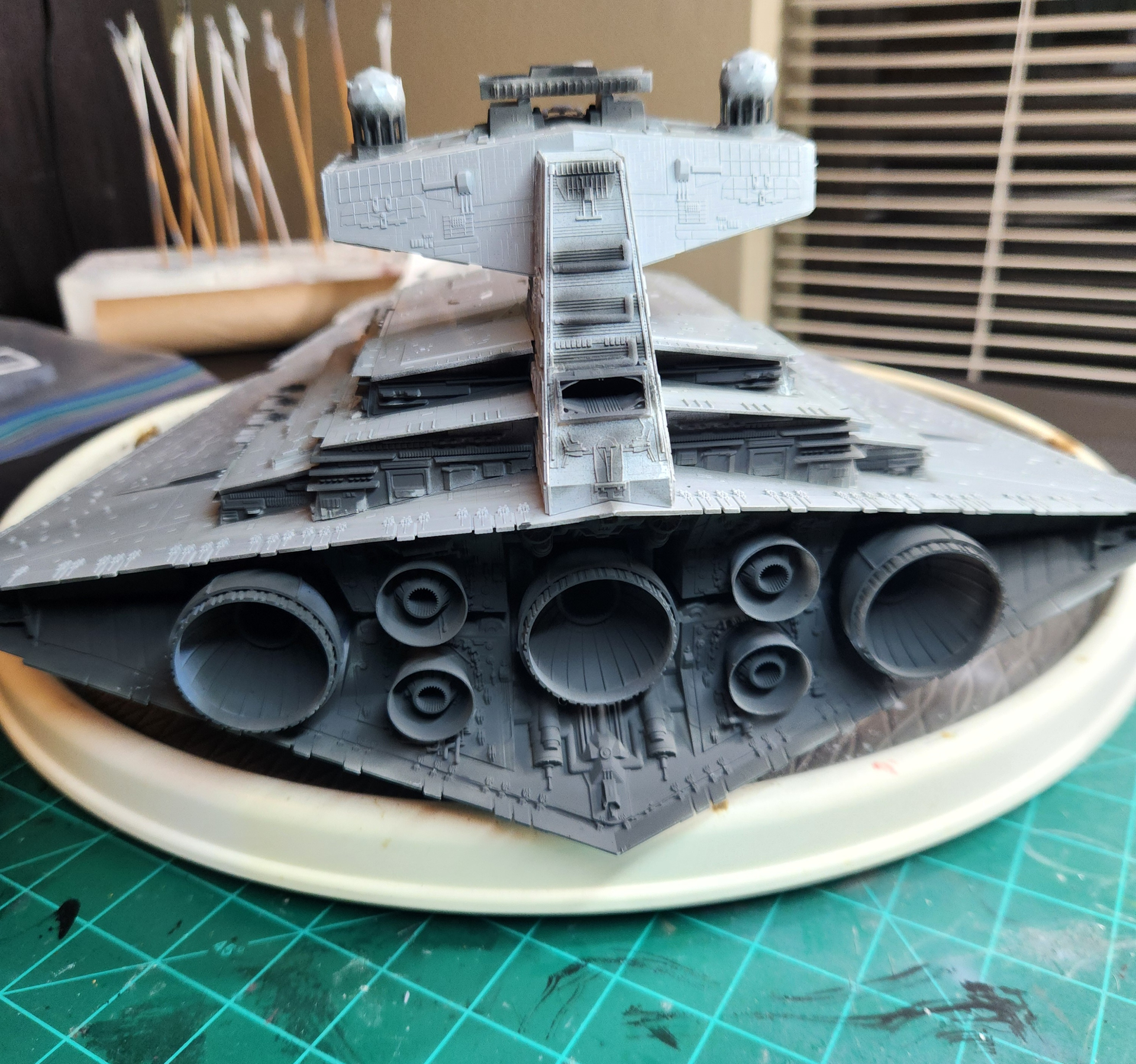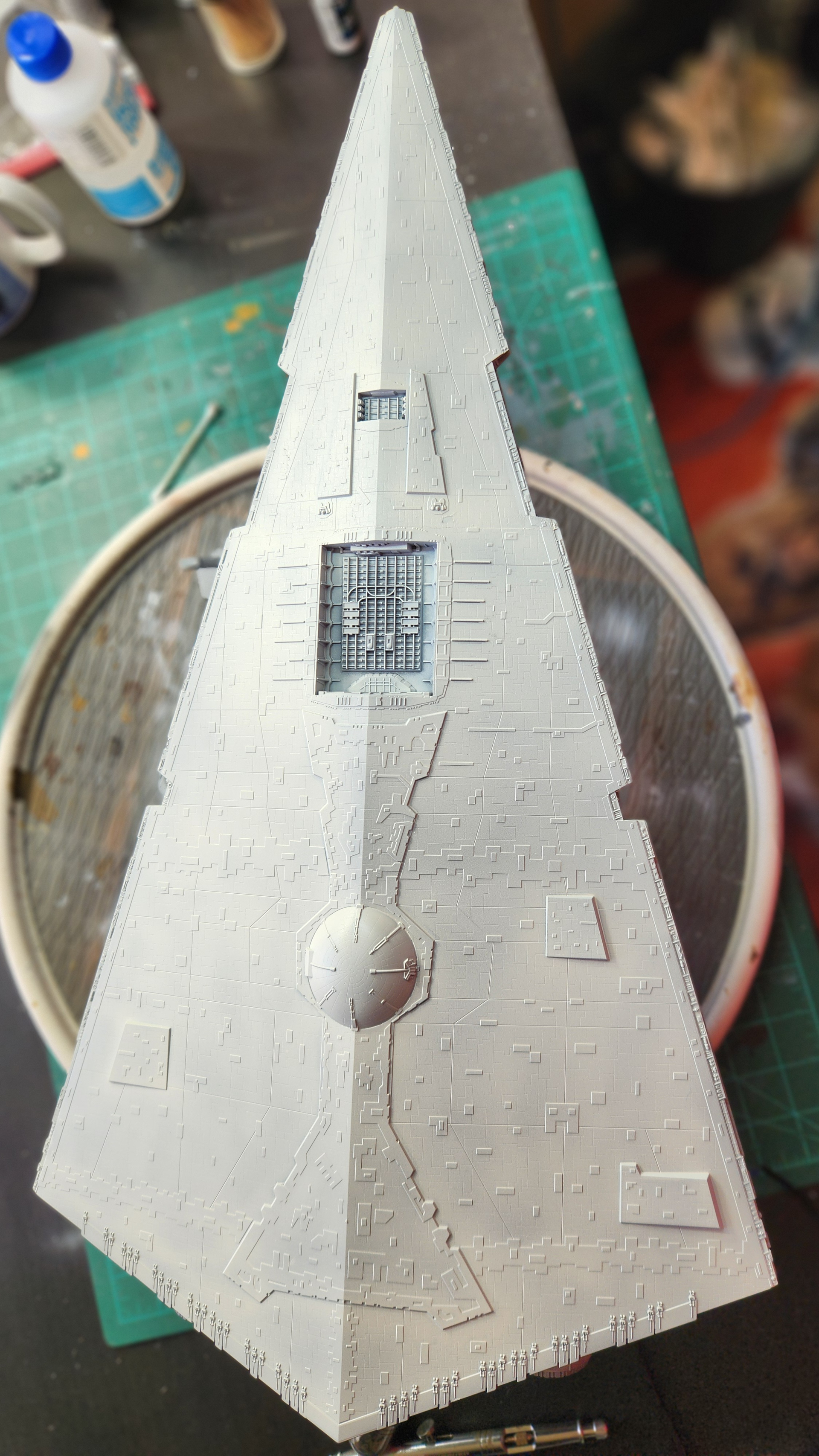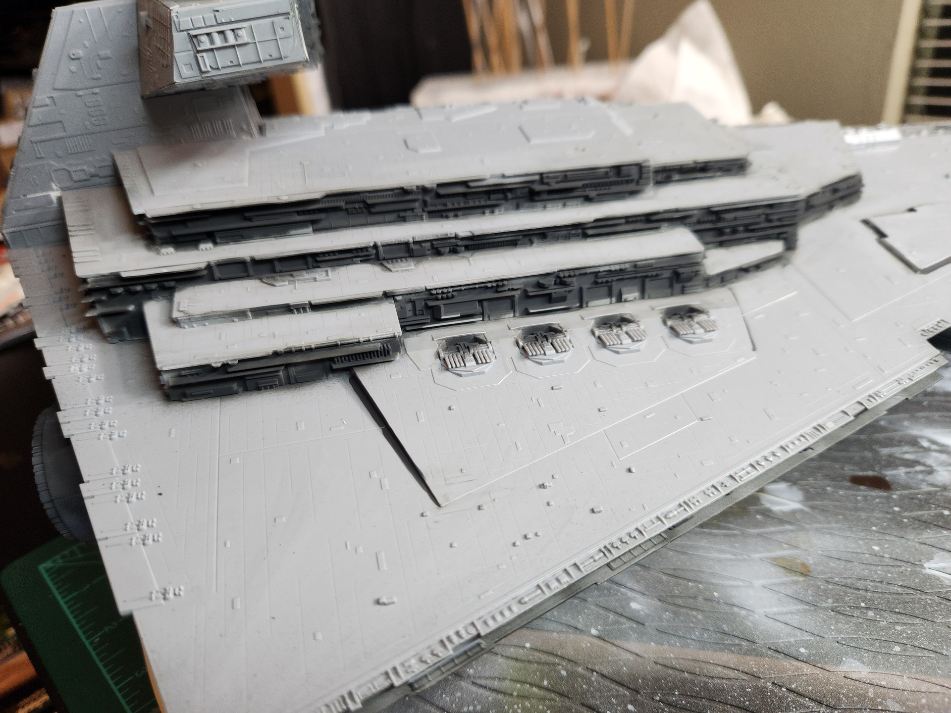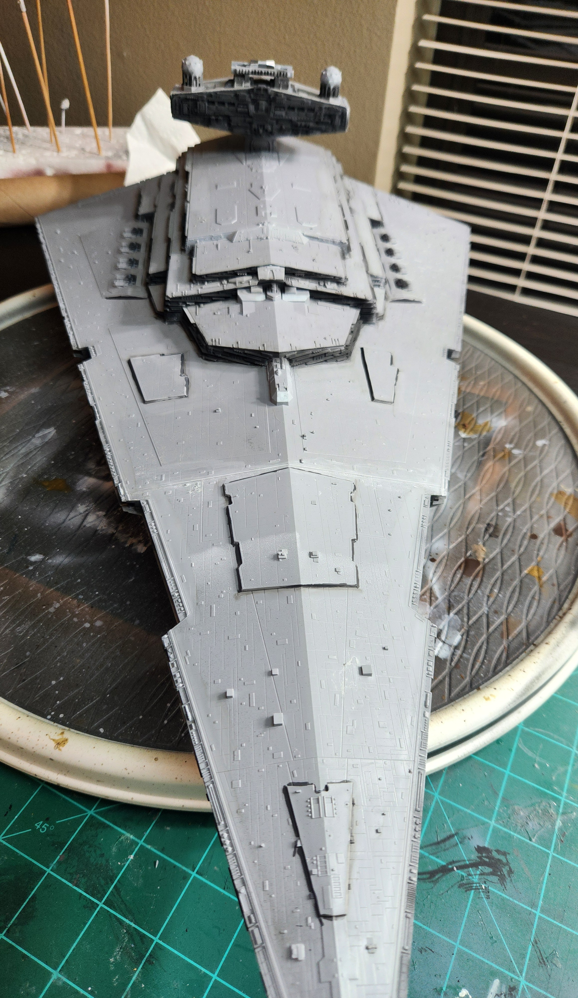 The bottom is painted the base color….Vallejo White/Gray and a satin clearcoat applied…..I will then do an oil paint sludge wash…..Hopefully when I wipe away the oil paint…..it will remain in the panel lines….. I am going to finish the bottom first so if I do mess something up I can learn from it and it’s going to be hard to be seen when it’s on display anyway.