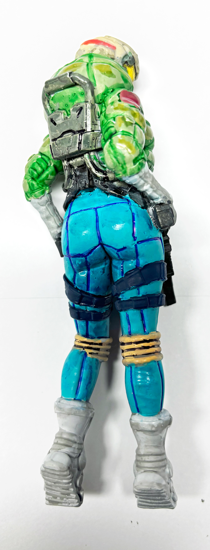 I decided not to be lazy so I went back and used AK Real Markers to paint over the runny blue wash and I used a MicroPro blue pen to ink in the blue seam lines. I painted over the blue fabric trimmings instead of using a blue wash to paint in the front of the turquoise overalls.