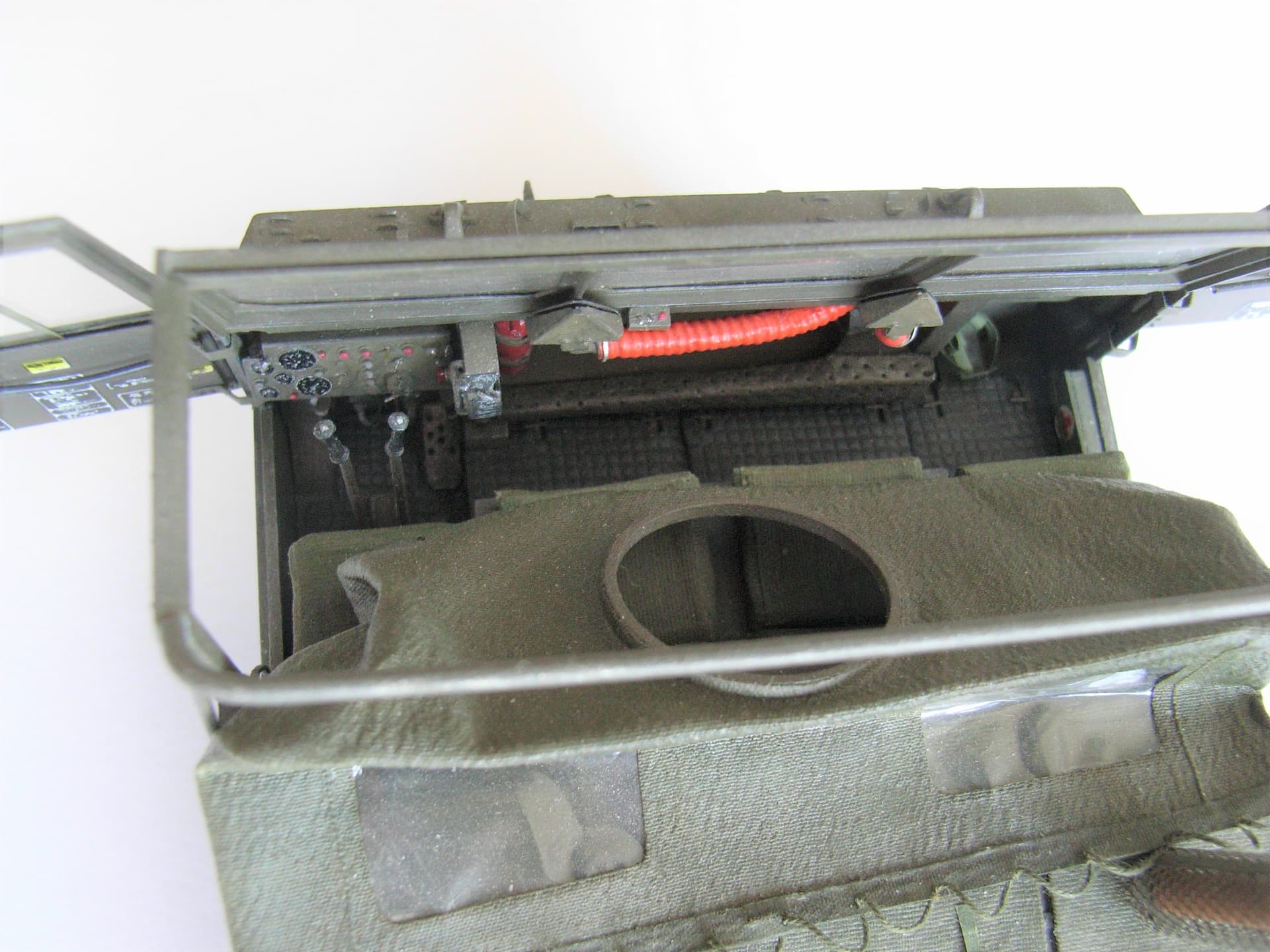The defroster ducts have a 1mm copper wire core with a ball pen spring around it and several layers of white glue to flesh it out, the heater outlet is lead foil with pin pricks. The ārubber floor matsā are from aluminum foil off a champagne bottle (itās amazing how many different patterns there are). Seat covers and canvas roof are from silk fabric just soaked in water color (not diluted white glue) with cellophane candy bag rear windows. The door windows are acetate replacements and slide in new frames of thin styrene sheet, the opening chains are insulated wire, and the working hinges were bent from sheet aluminum. Also note that the exhaust stack has a heat protector from the shear foil of an electric razor (once again, a wide variety of patterns available).