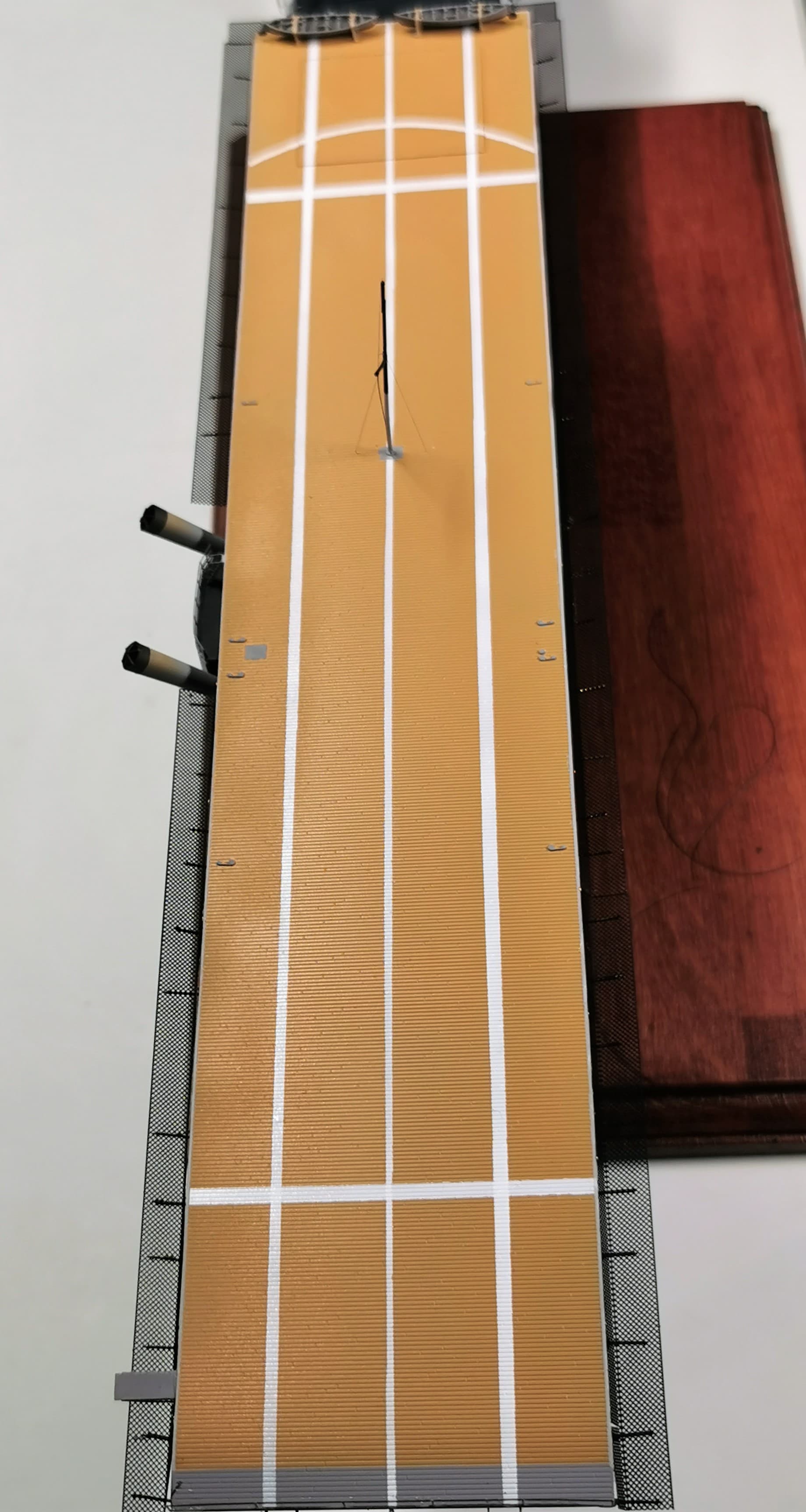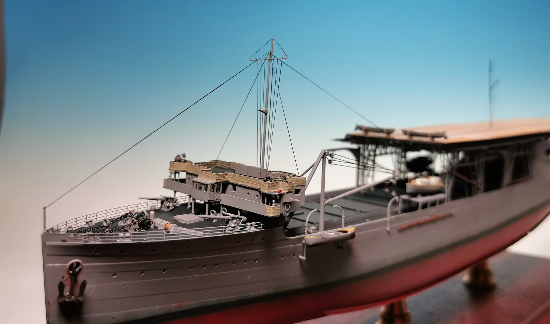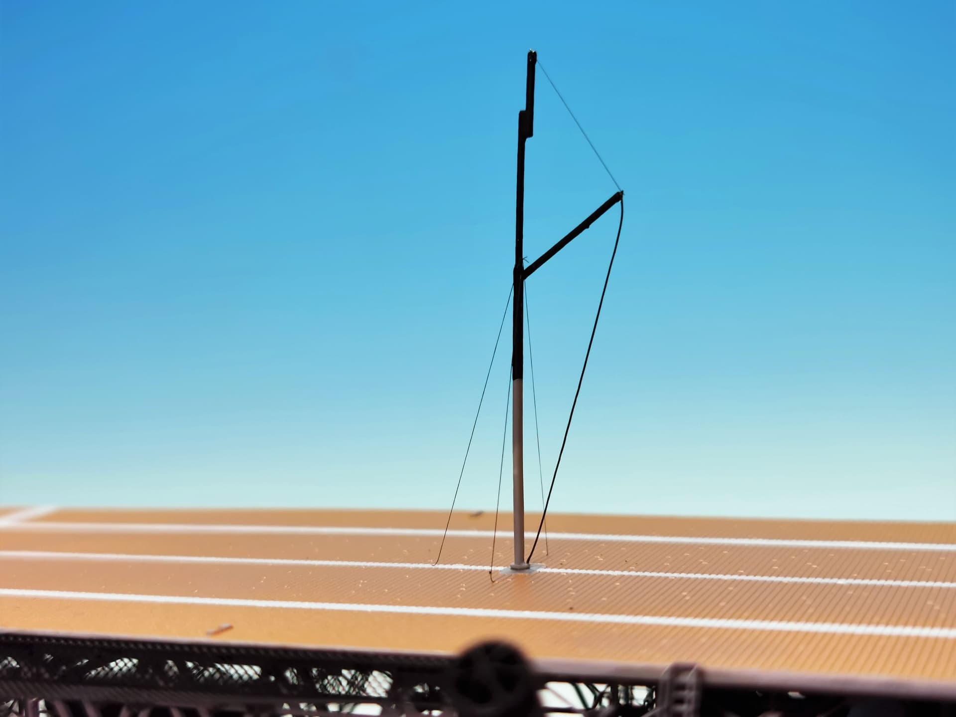 and the rear mast at the flight deck. As this one was obviously also to disassemble I used very fine rigging wire here for the holding ropes