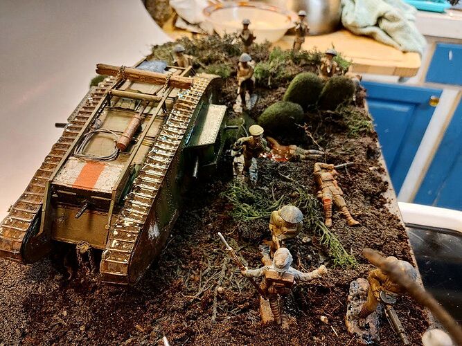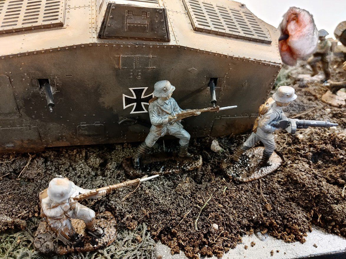 This is a rough depiction of the Second Battle of Villers-Bretonneux, first tank on tank battle, Mark IV Male vs A7V. There were a few tanks involved, but the main engagement happened between an A7V named “Nixe” and a Mark IV Male (name unknown) commanded by Lieutenant Frank Mitchell. There were a couple of Mk IV Females involved, but they withdrew because their machine guns were ineffective against the lumbering, enemy beast. There were multiple A7Vs in the overall engagement, but the bulk of the tank on tank were these two. Nixe was damaged and the crew abandoned the tank due to fear it would explode, but after it didn’t explode, they managed to get back to the tank and leave with it. While Nixe was damaged, neither of the tanks were heavily damaged from the engagement. But it did usher in a new era of thinking about how tanks would be used in the future.