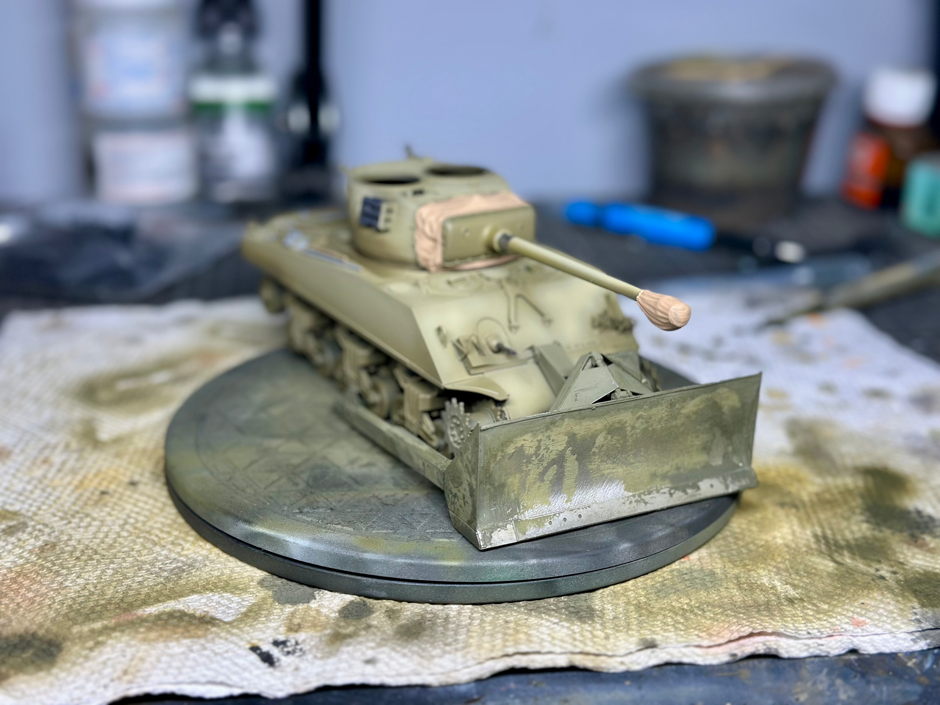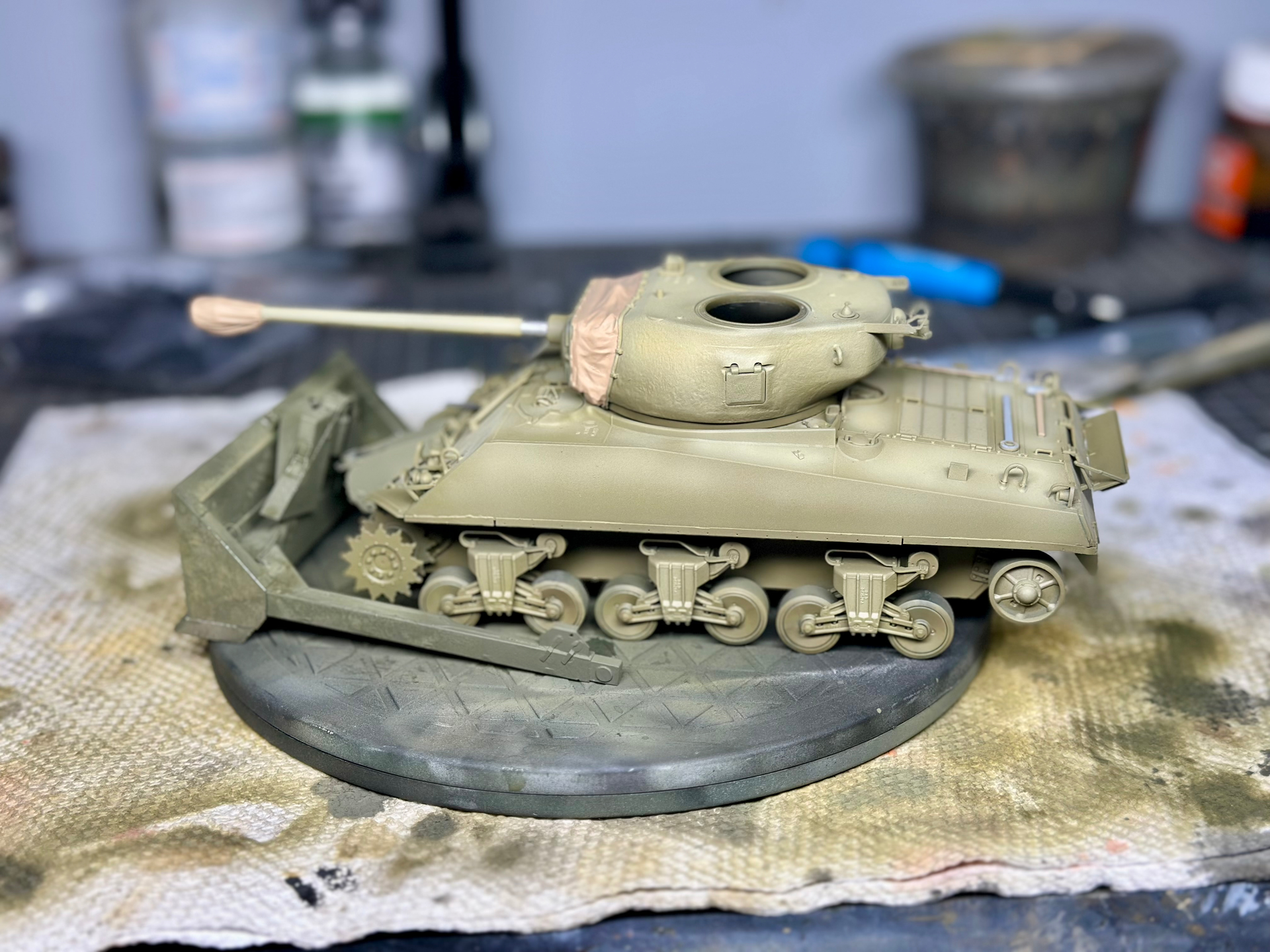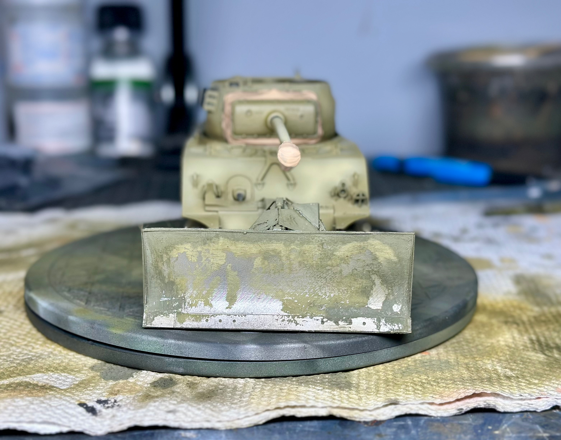 Colour modulation is done. I applied faded OD and then lightened it up before over spraying a super think layer of the original OD No.9 to unify the finish. Next is the dozer blade painting then onto decals and weathering