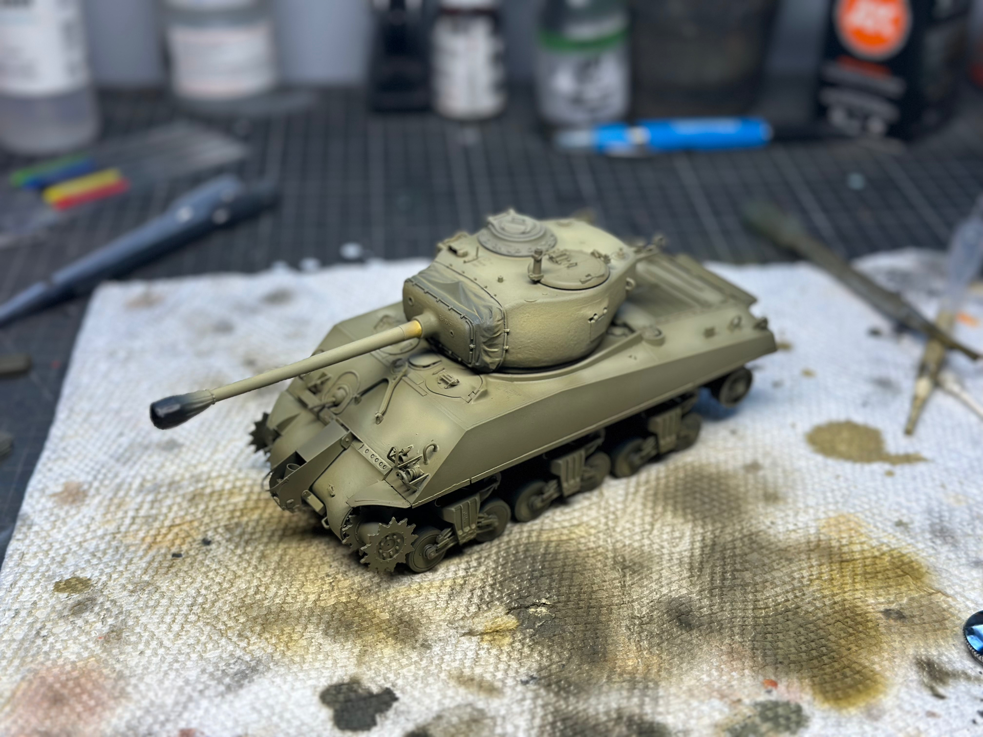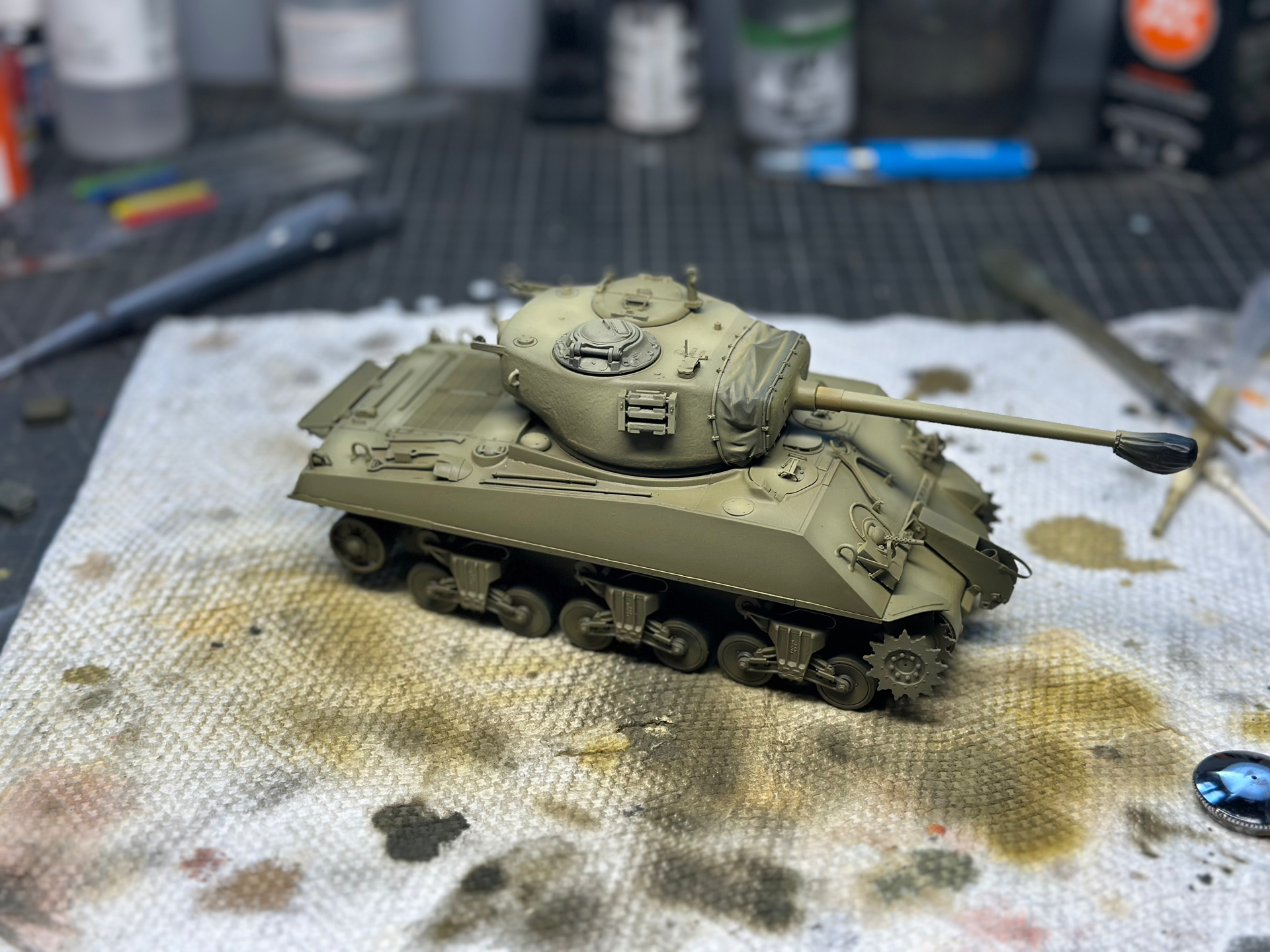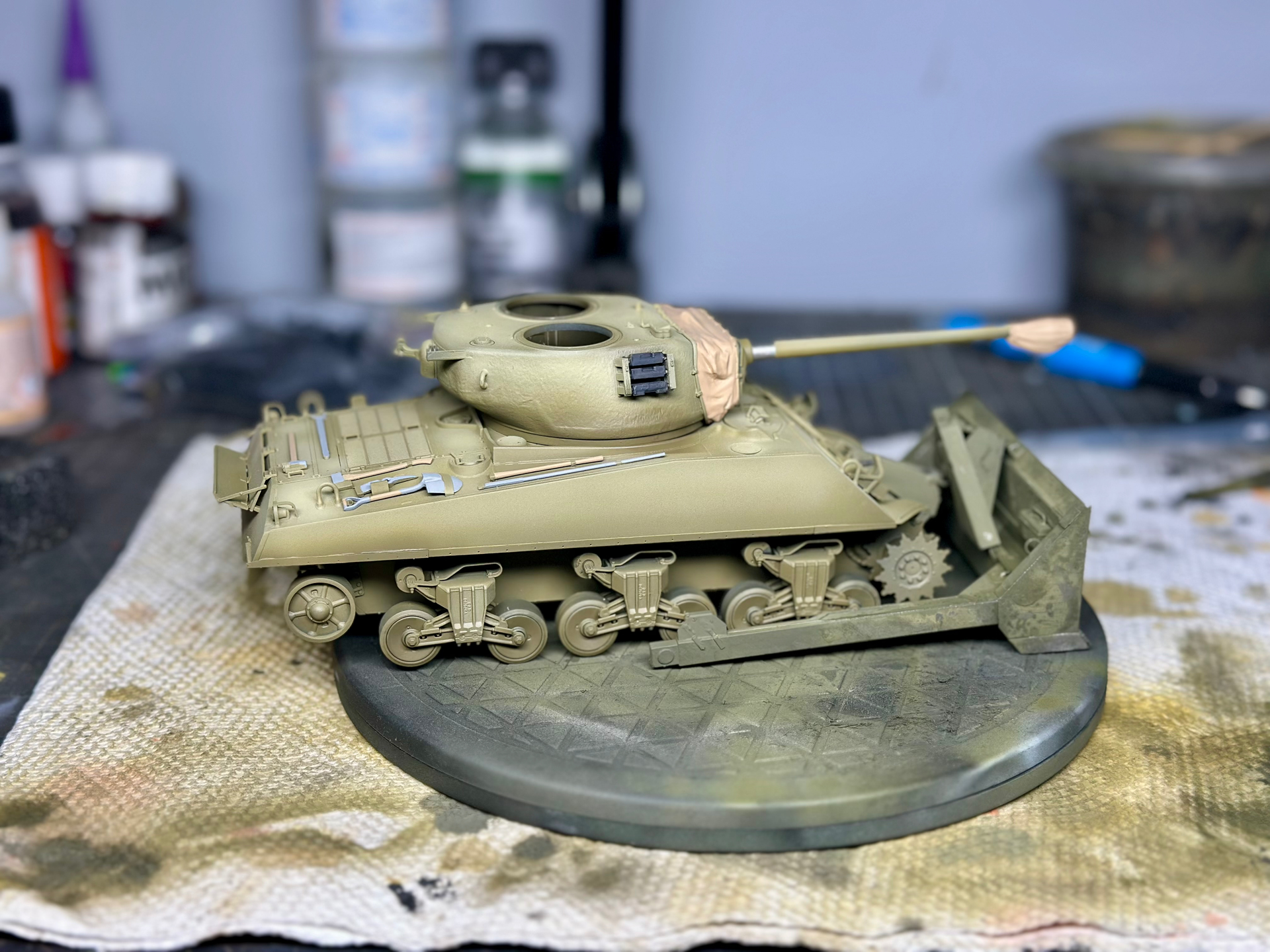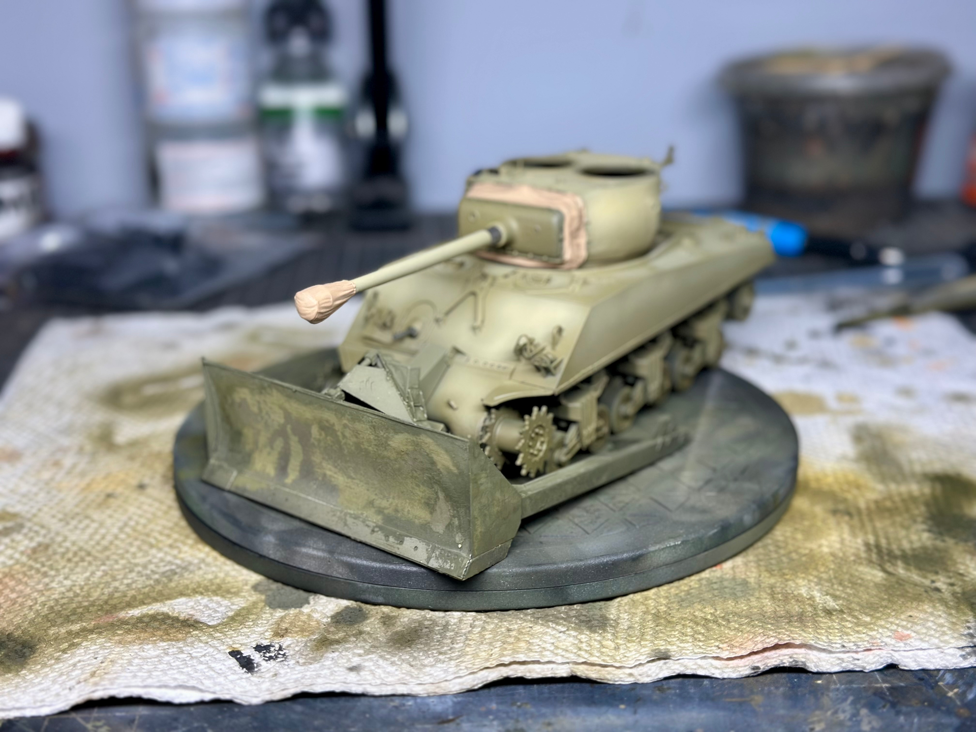 Colour modulation is done. I applied faded OD and then lightened it up before over spraying a super think layer of the original OD No.9 to unify the finish. Next is the dozer blade painting then onto decals and weathering