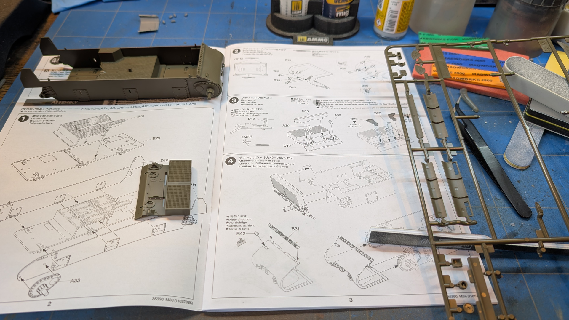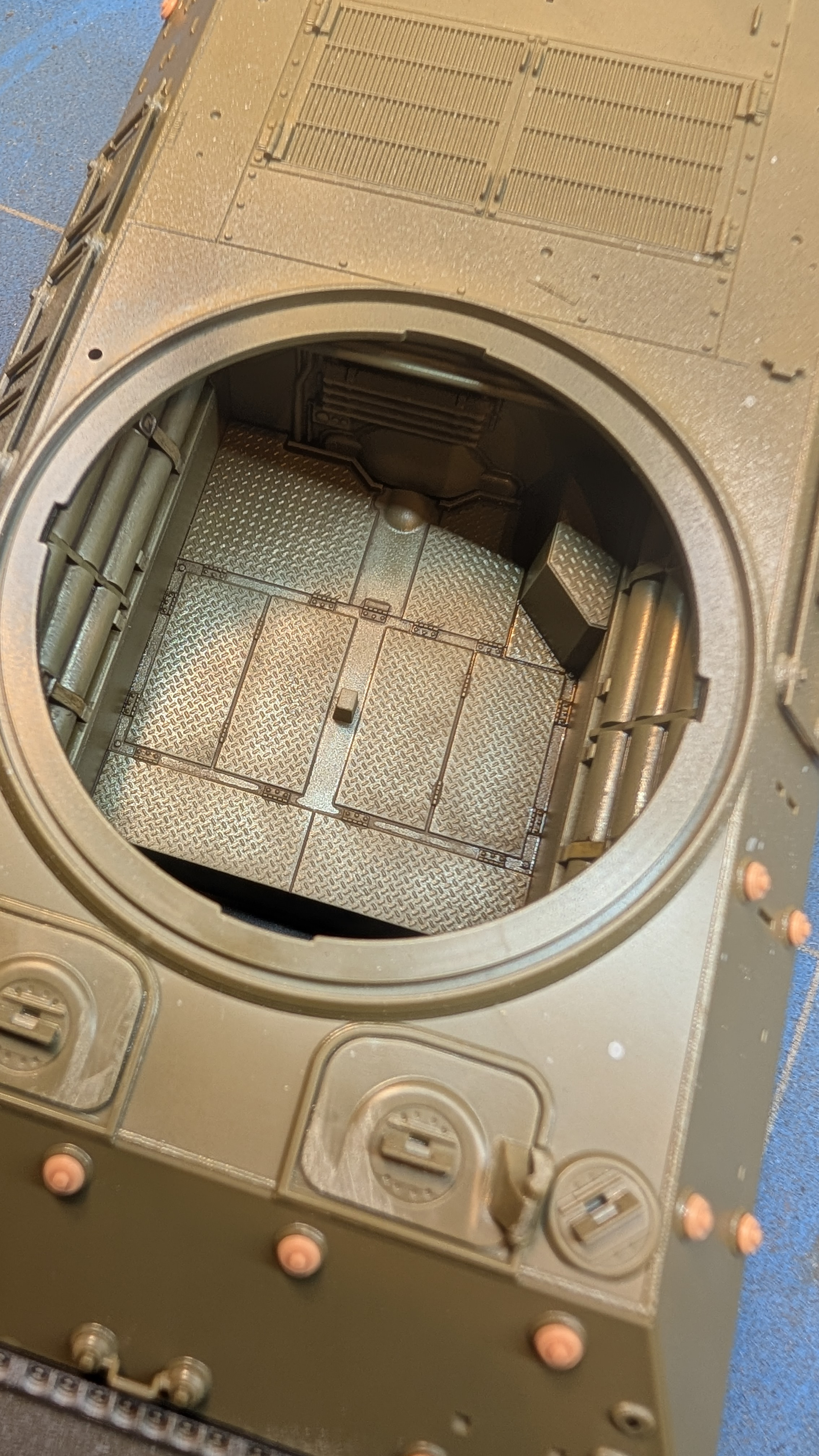 Building the M36 is pretty much done. It’s become a real Frankentank (destroyer), with most of the model being the Tamiya kit (obviously), extra details from T-Rex and a small part from the Tamiya M10 IIc Achilles (the mounting bosses with grab handle on the glacis plate). I added 3d printed tool straps, but can’t remember who made them, I just know I have a lot of them. I replaced the wheels with Asuka wheels, because the Tamiya wheels lack the grease nipples. I replaced some of the solid handles with wire and left the ones that will be covered by stowage and other gear. The interior of the hull and turret are already painted.