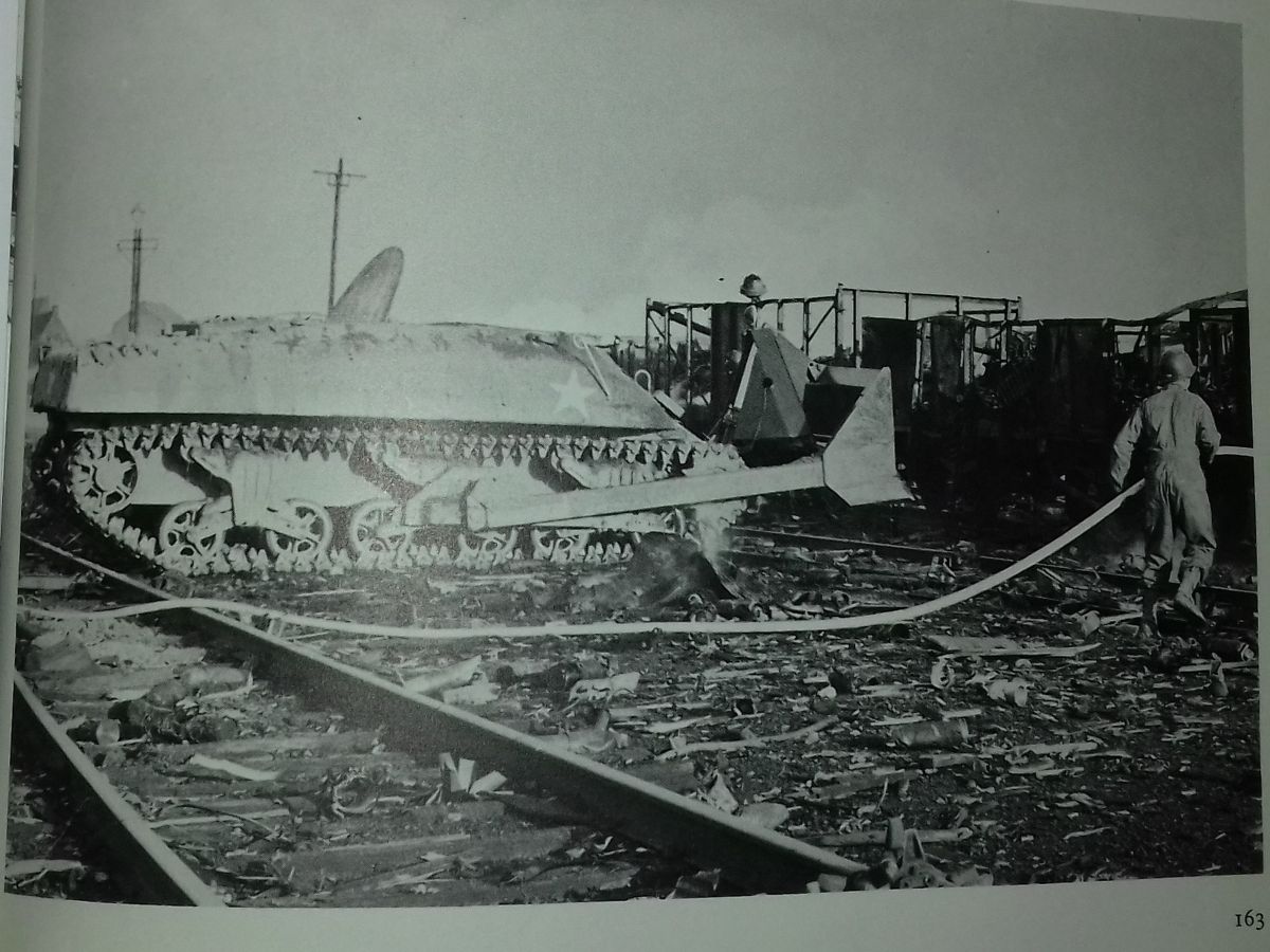 Odd turret with extra lift hook on upper left side, early stowage brackets dropped down halfway, inboard front hull lift rings, turret forward antenna but with bolted over circular plate, later suspension with upswept return roller mounts, smooth unthreaded M1A1 barrel, forward hull ventilator missing the cover like on “operation cobra” M4A1s…
