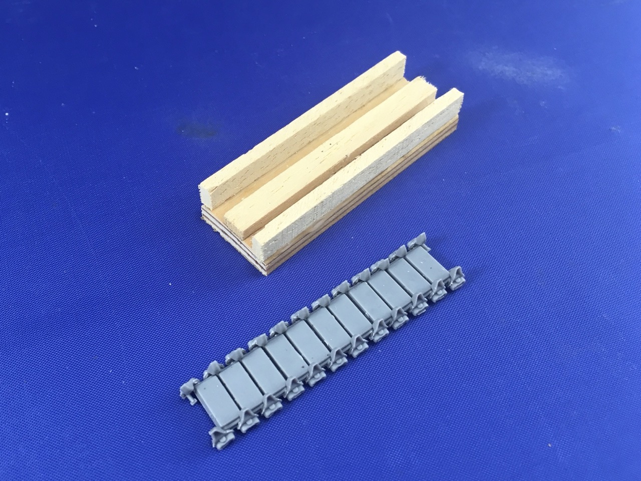 I first assembled a couple of links the way MiniArt tells you to, but found that difficult. The jig is just four bits of wood: the two on the sides are far enough apart that the length of tracks sits nicely between them, with the strips against the sides of the track without being tight.