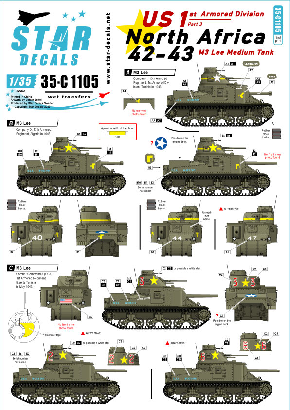 1st Armored Regiment was equipped with M4 Sherman’s in their medium tank units while 13th Armored Regiment was equipped with M3 Lees in their medium tank units. During the campaign, whole battalions were equipped with M3 Stuart light tanks, so without knowing the proper TO&E, you could be putting the wrong regiment or battalion markings on your Lee. IIRC, at the time each regiment had two battalions of Lights and one battalion of Mediums. After the campaign US tank units were reorganized based upon lessons learned in combat.