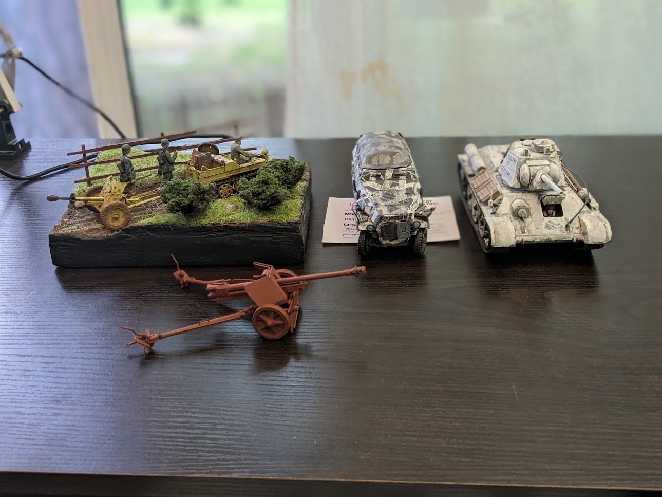 These are my Tamiya models, from right to left in ascending order of assembly – T-34-76 m.1943, Sdkfz. 251/8 (modified from their 251/1 kit), and Sdkfz. 2 + Pak 38 with the rocket. The Pak 40 is yet to be painted.