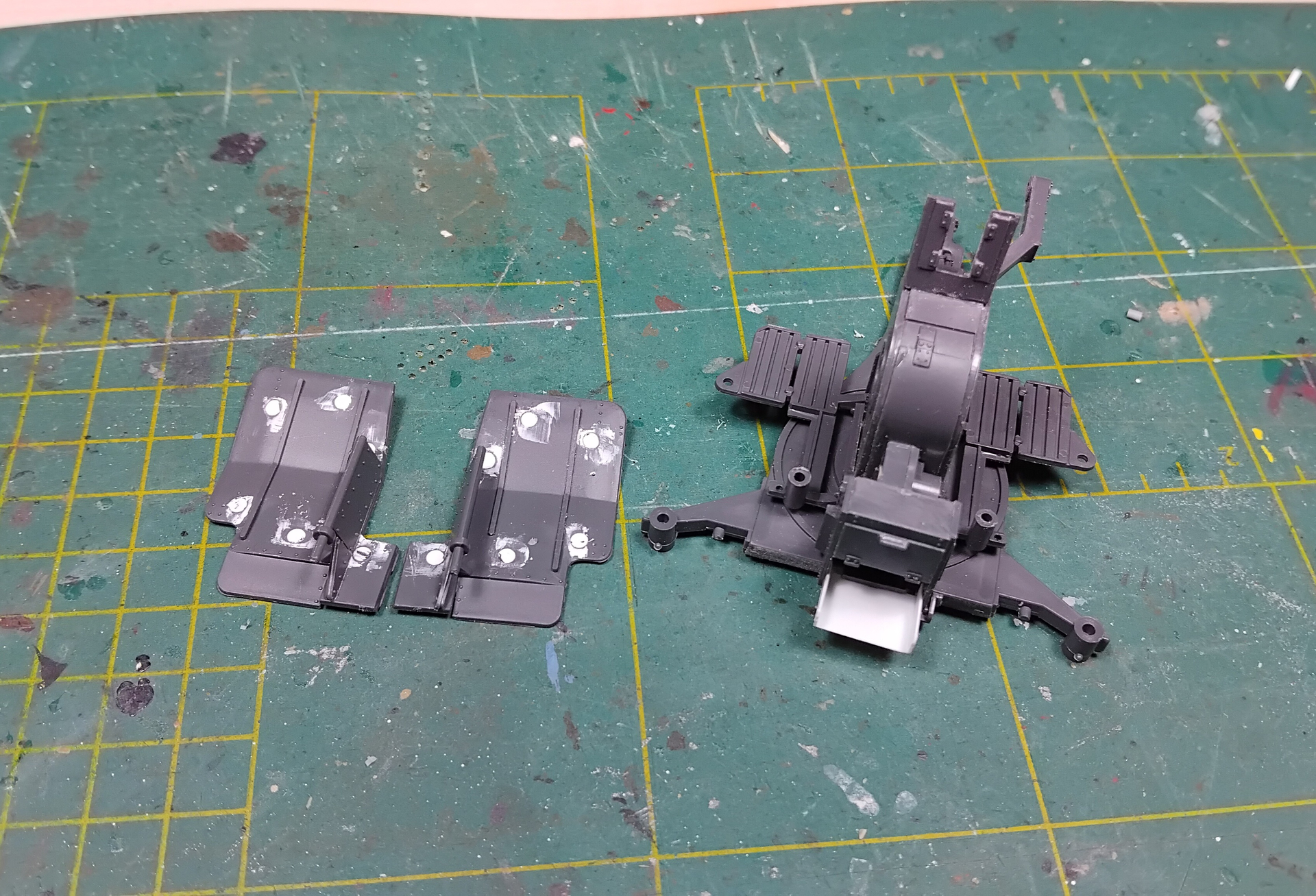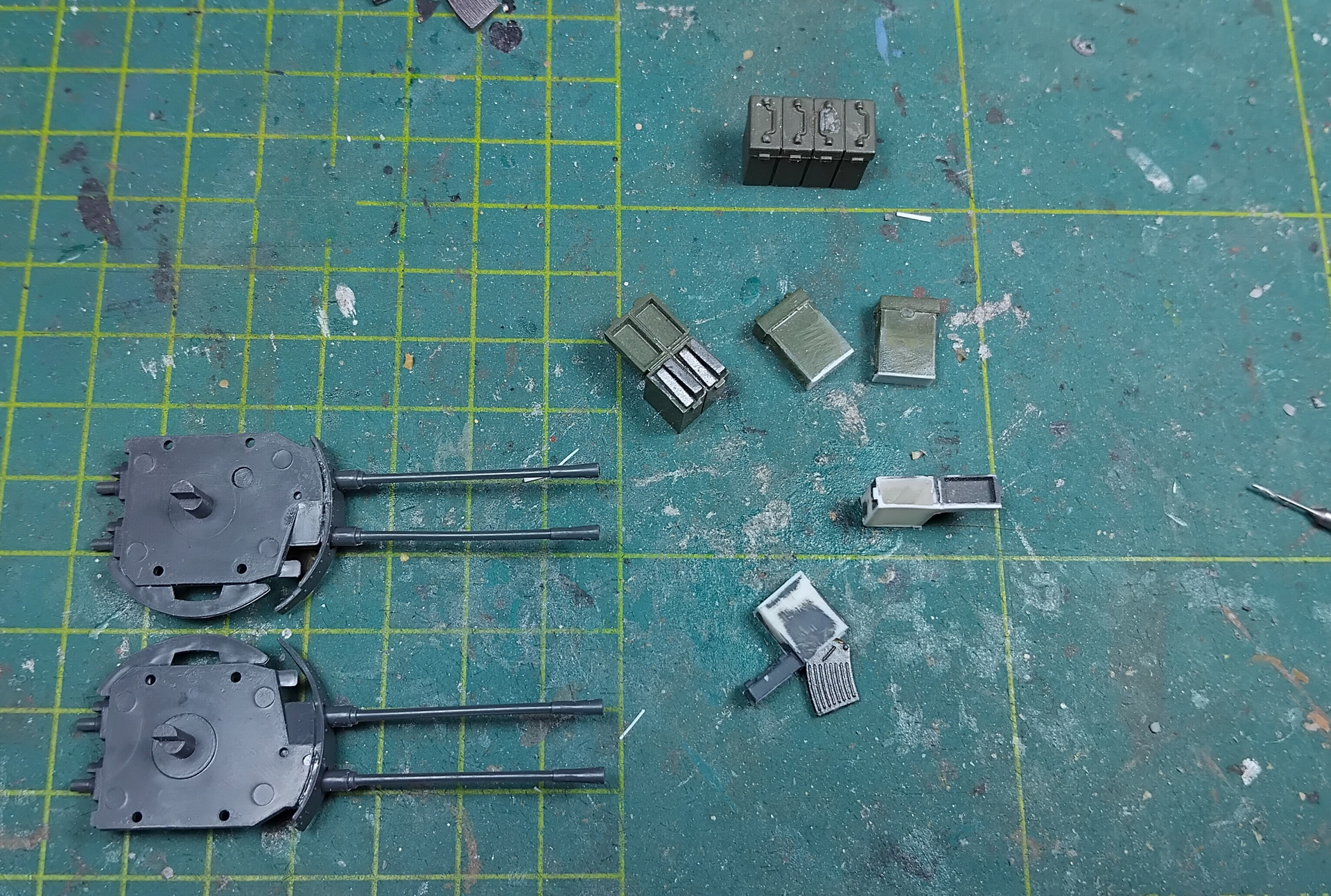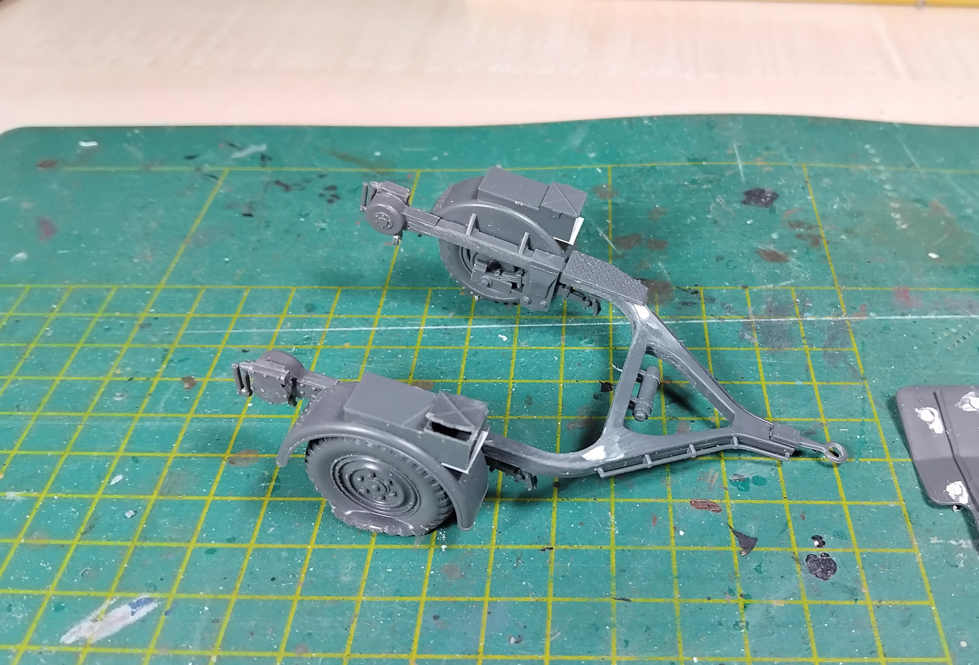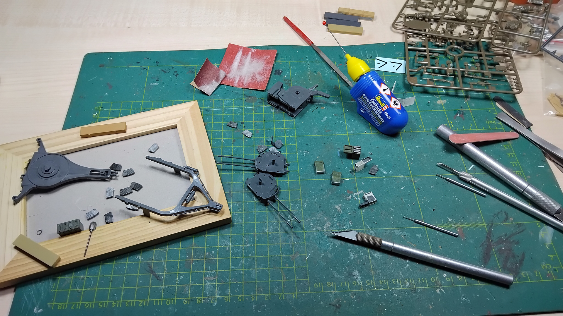 Barrels straightened and drilled out, made an exitchute for the spent cartridges. This however does compromize the structural integrity and I had to cut and carve away the required opening. I also had to fill numerous ejectormarks. For the Sd.Ah. I had in mind that it should be damaged by a nearby explosion or grenade, thus making it logical for it to be abandonned in haste. So one tire had to be flat by softening it over a flame, pressing it down in the right angle and carving in a new threadpattern. The lid of the box on the same side was to be blow open, so I tried to carefully cut if off, but it still deformed. These stowageboxes had no bottom, so had to add so plastic strip.