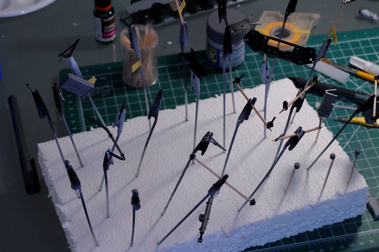One thing is clear that from a kit that is close to 50 years old there is a lot of cleaning up mold lines and injection marks. So starting at the front of the car a couple of hours of scraping and sanding I have a forest of parts ready for painting and completing the front suspension.