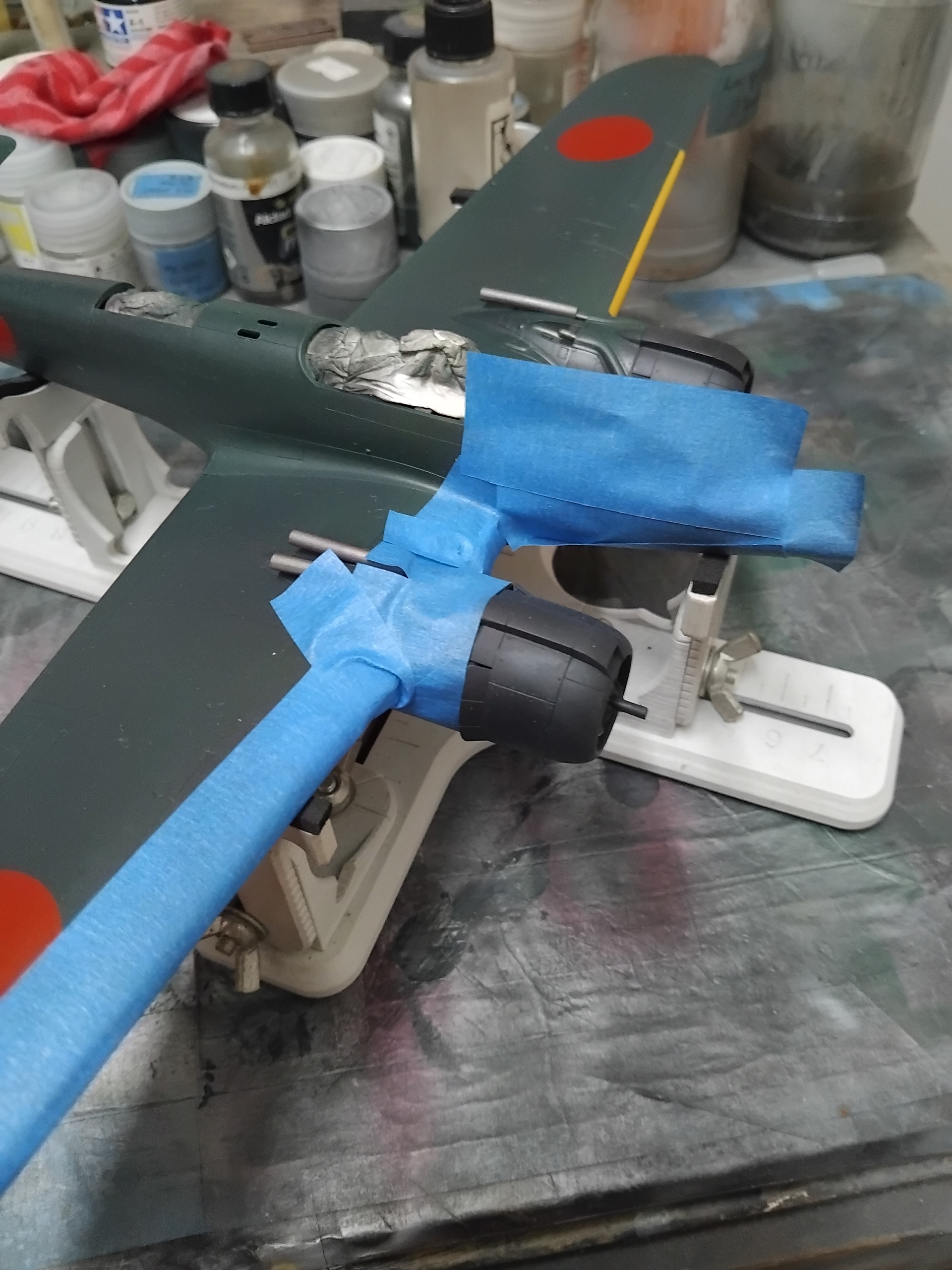 Following the painting, I went to put down a matt clear finish. With supply lines, and scarcity of clear I had to improvise. Using a mix of Future floor wax and adding in some very old Tamiya flat base, I sprayed the bird, and much to my dismay I got a run on one of the engines. Using a tried old technique, I let it all dry thoroughly, and then lightly sanded the area down. The first step in repairing this goof was to mask off the area, and then begin sanding.
