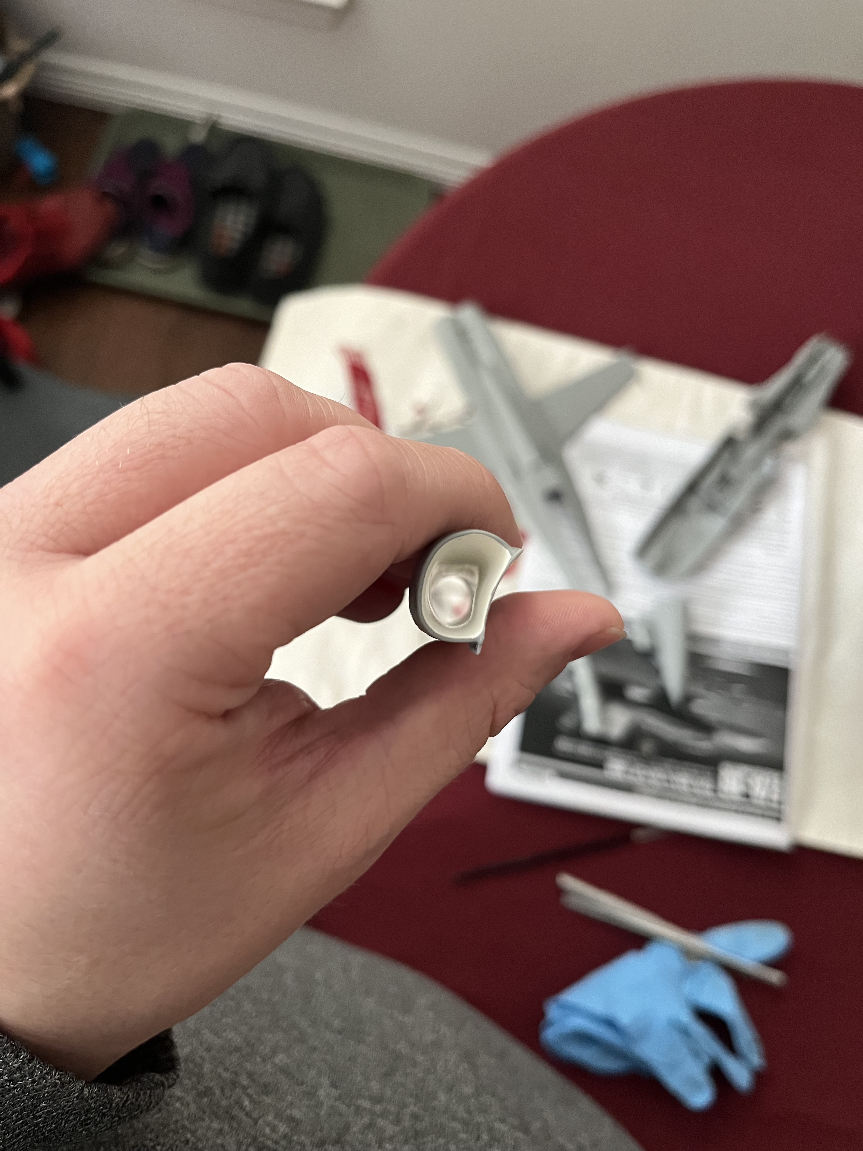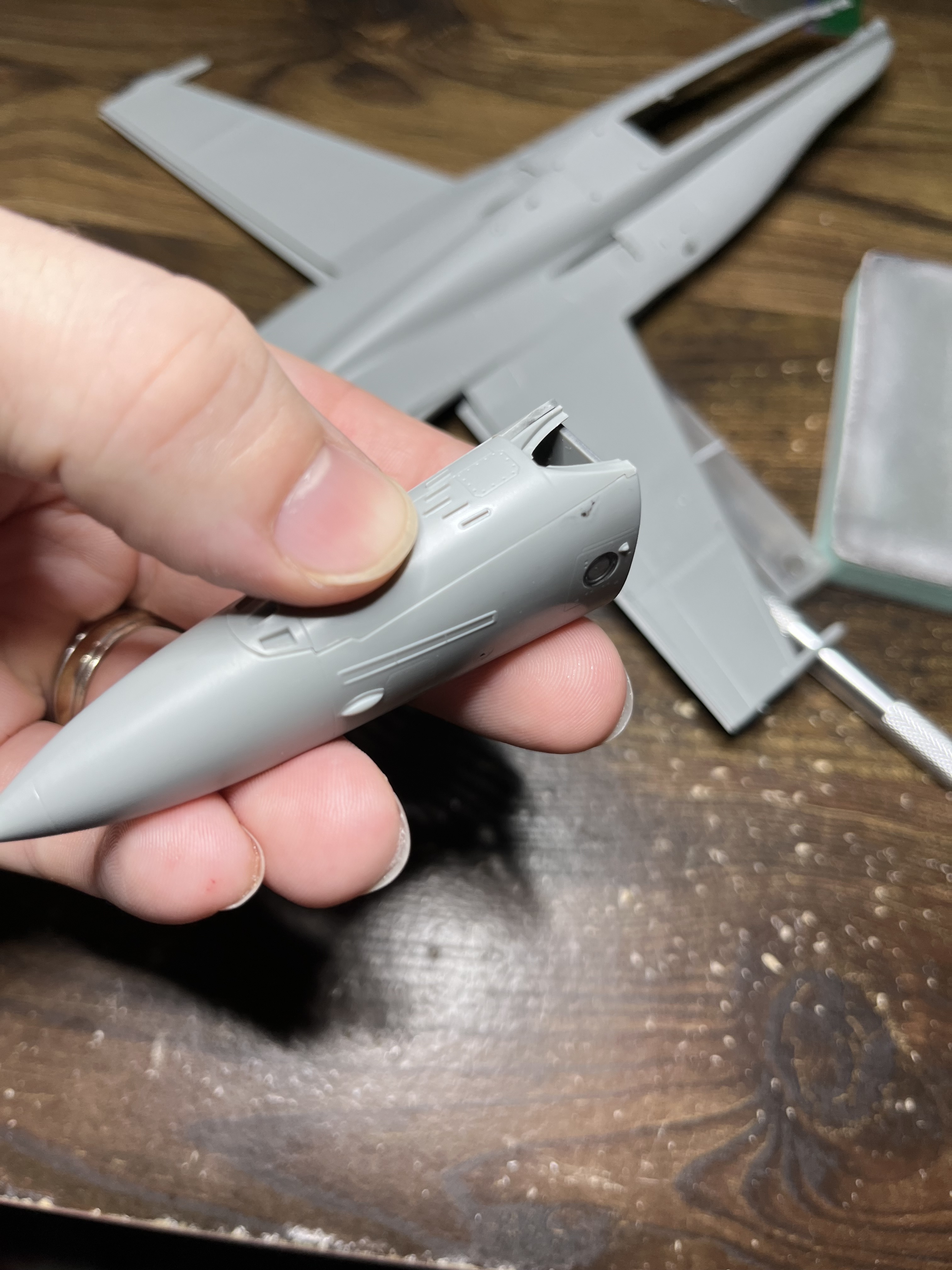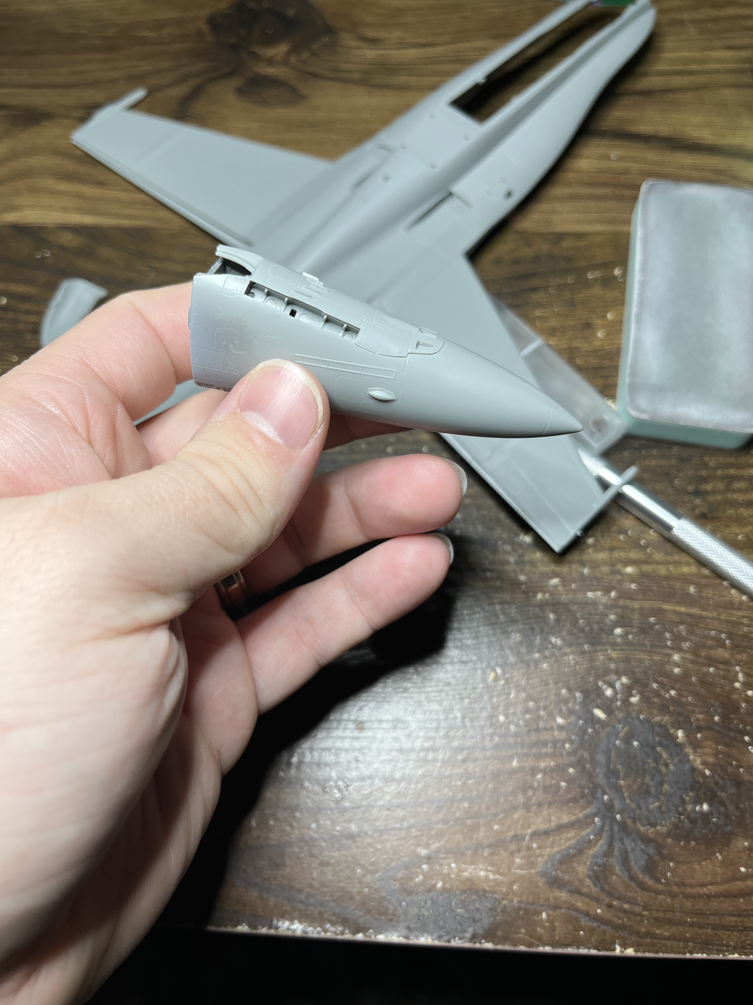 Last update, is on the nose. I got the search light painted, which needs to be painted from the inside. I will mask it off later. The second larger issue with the nose is the top piece. It is attached to the upper fuselage, but is somewhat flimsy and has a poor fit. Reading other posts. A solution is to cut the nose piece off the fuselage, attach it to the nose and then attach the full nose assembly to the fuselage. This is the route I went it makes fitting the fuselage easier, and the seam is mostly hidden by the IP cover. The small part that isn’t hidden is easy to fix with some light filler