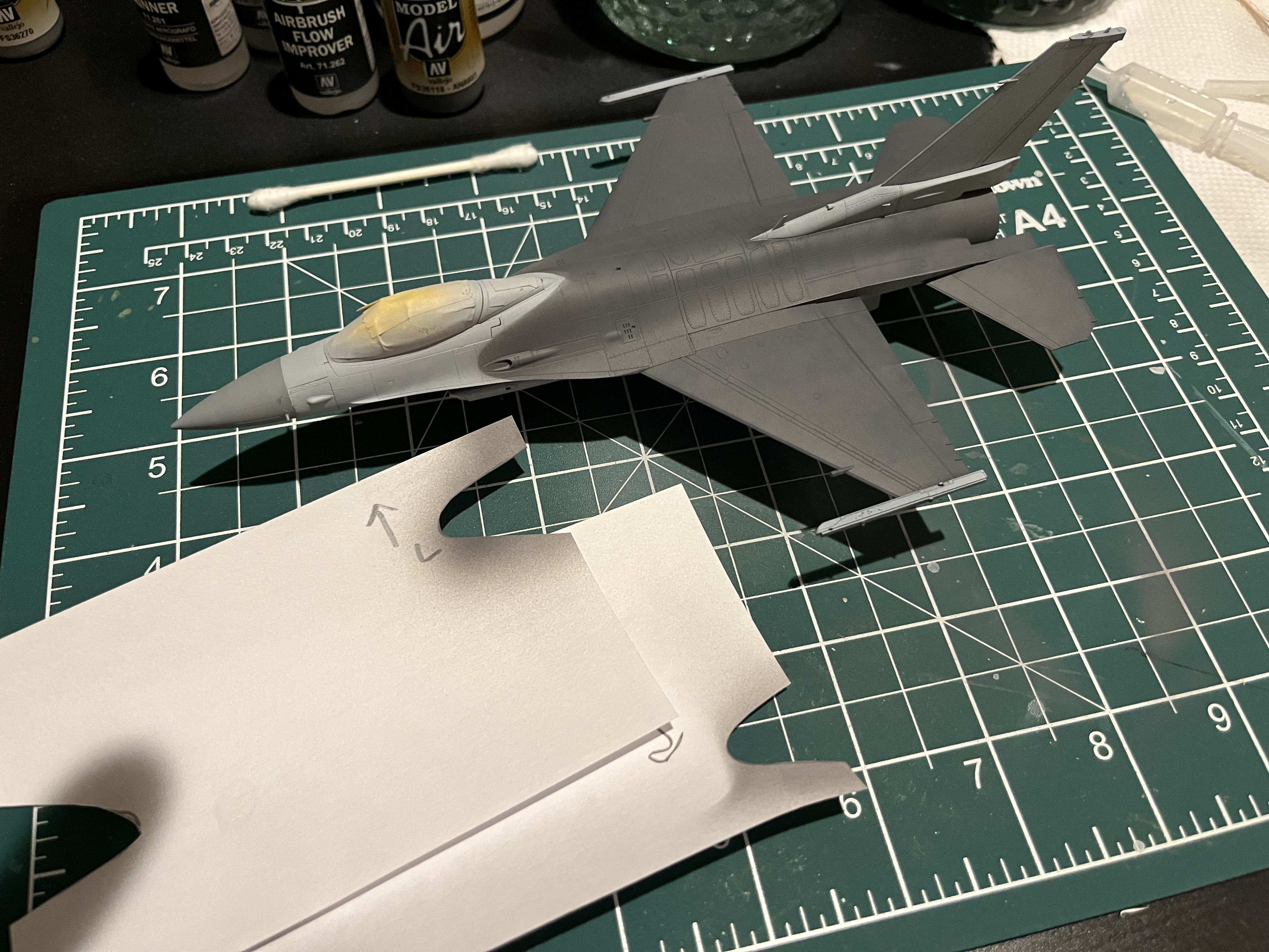 For those of you who did F-16s with the two tone gray on the fuselage - is there a premade mask for the demarcation between the two grays, that curve beneath the cockpit? Or tips on how to make one that looks symmetric on the two sides of the fuselage?