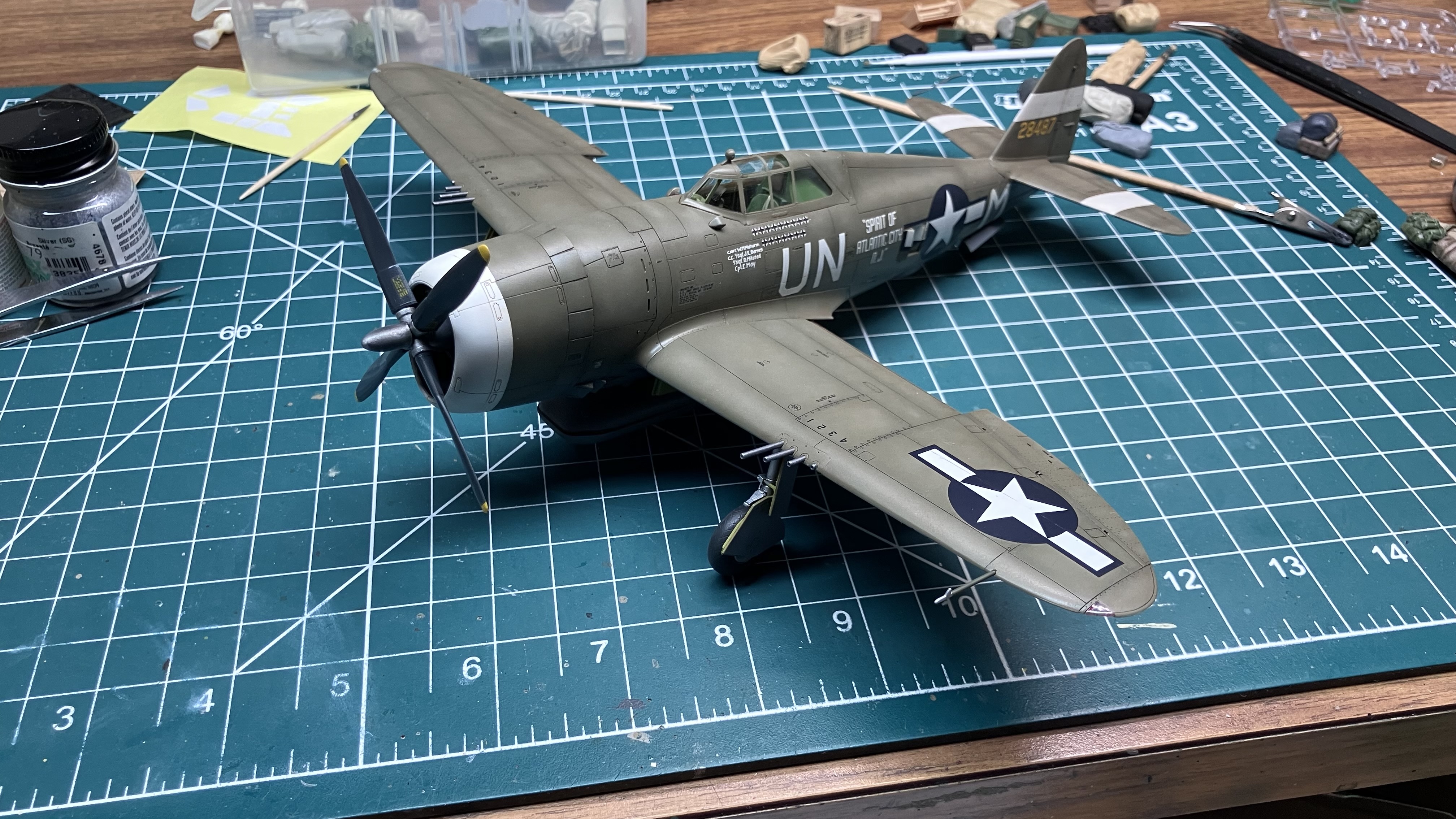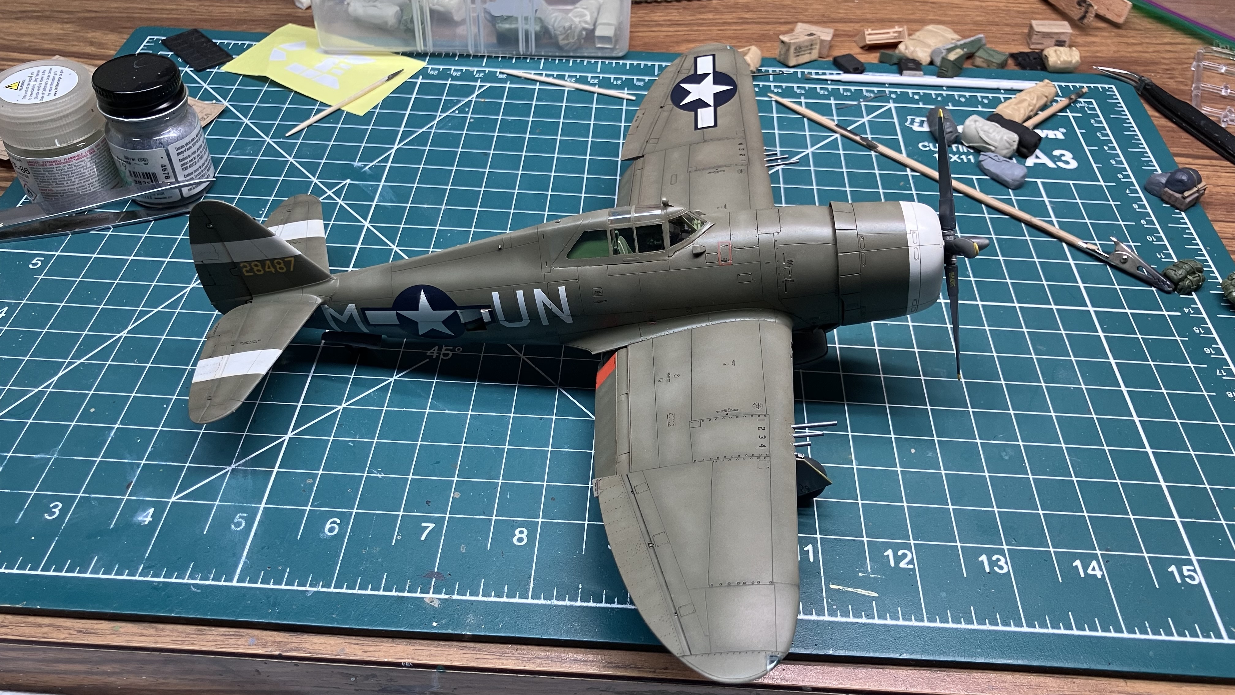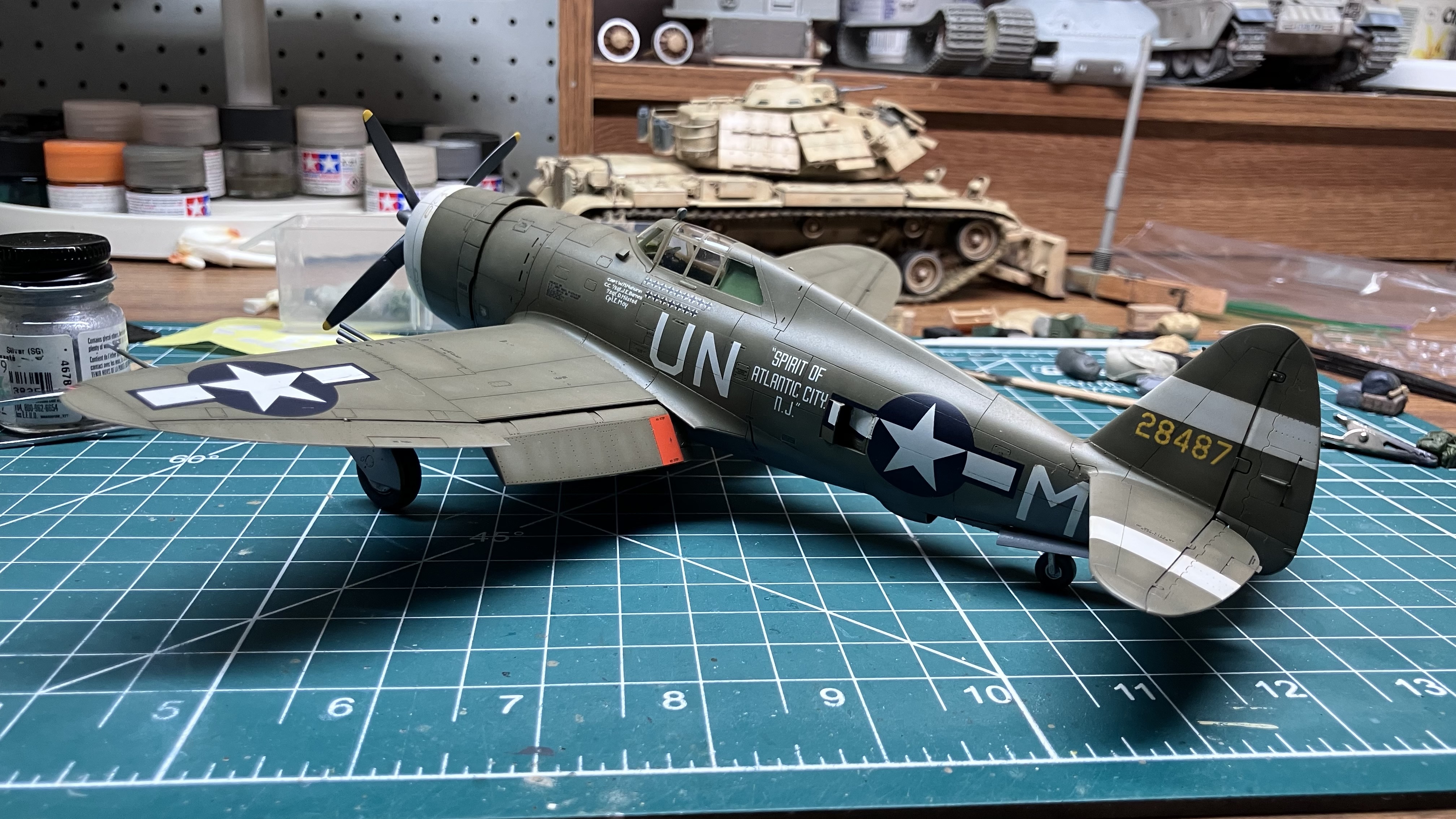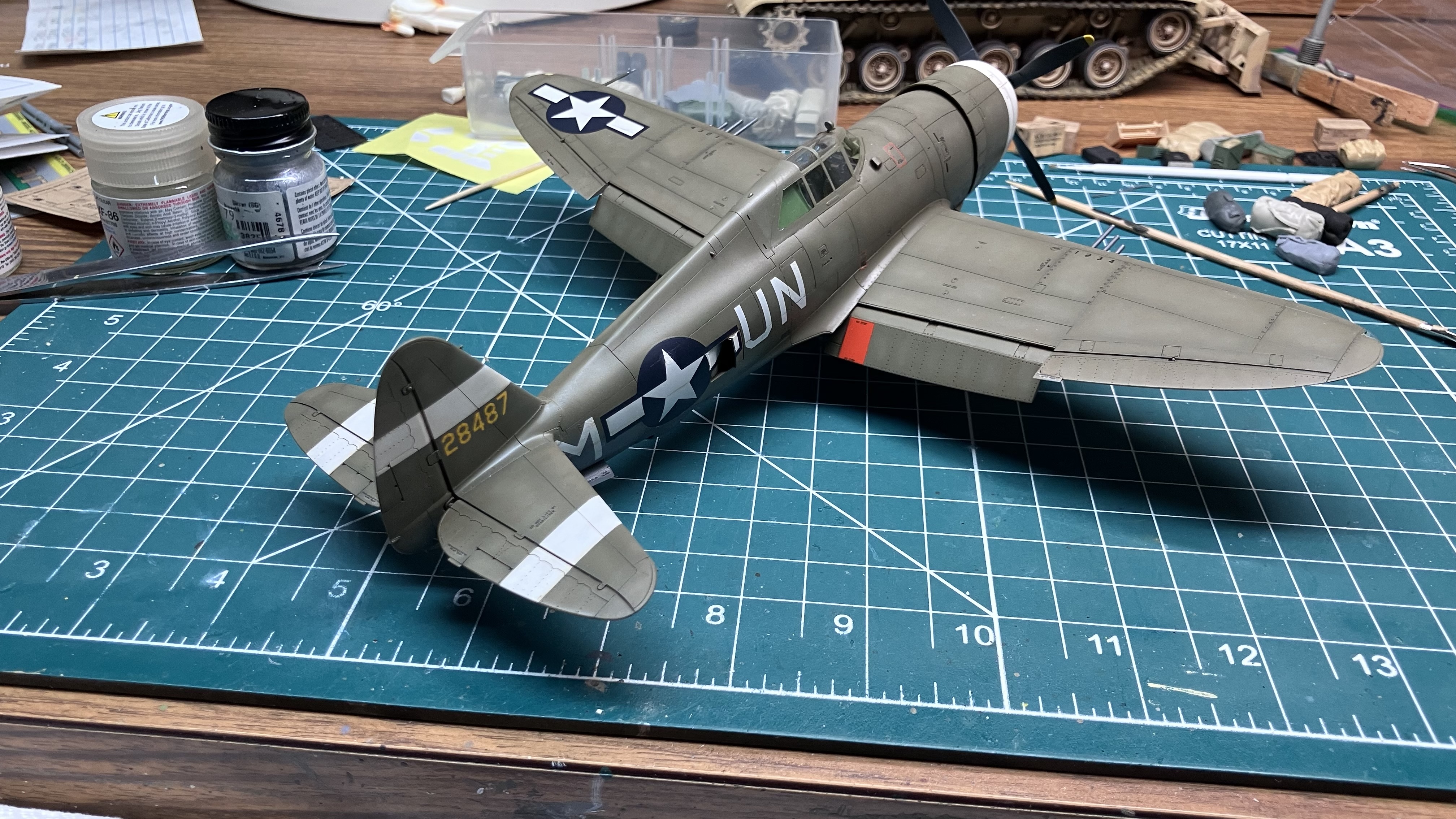 The Tamiya kit OOB. Easy carefree build. No hassle construction. Some seams to fill but that’s almost a given with aircraft. Used canopy masks to make painting easier. Preshaded with black. Very lightened Tamiya OD topside, Tamiya Neutral Grey on the belly. Really like how the painting turned out. So far so good. If I could have stopped here it would have been a near perfect build. The decals ruined it. Doing all the stencils was tedious and time consuming but not too bad. The national insignia was a nightmare. The stars on the fuselage are 3 pieces which do not mate up well. The thick decals also did not respond to Solvaset. The stencils were fine but the blue absolutely refused to soften and conform to the panel lines. Also had trouble with the canopy. It popped off after everything was painted. Put it back on as best as I could but… Overall it’s a 3 footer. Thanks for looking.