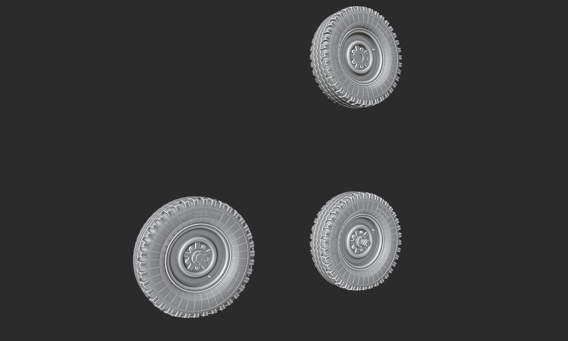 I designed also tires for 3D printing, because the rubber ones have some flash and are not weighted. Front and rear wheels are weighted plus one spare for the back (not weighted):