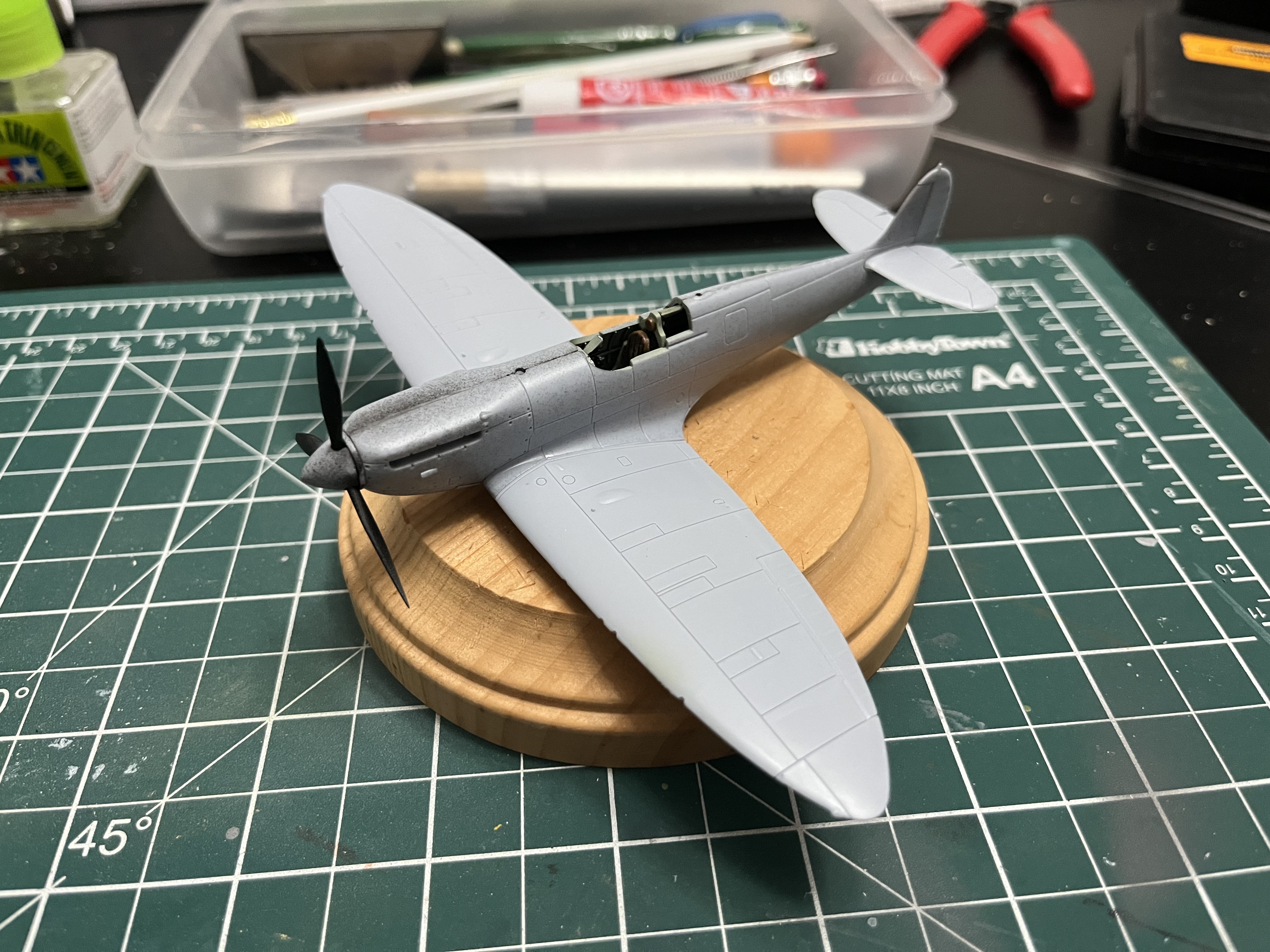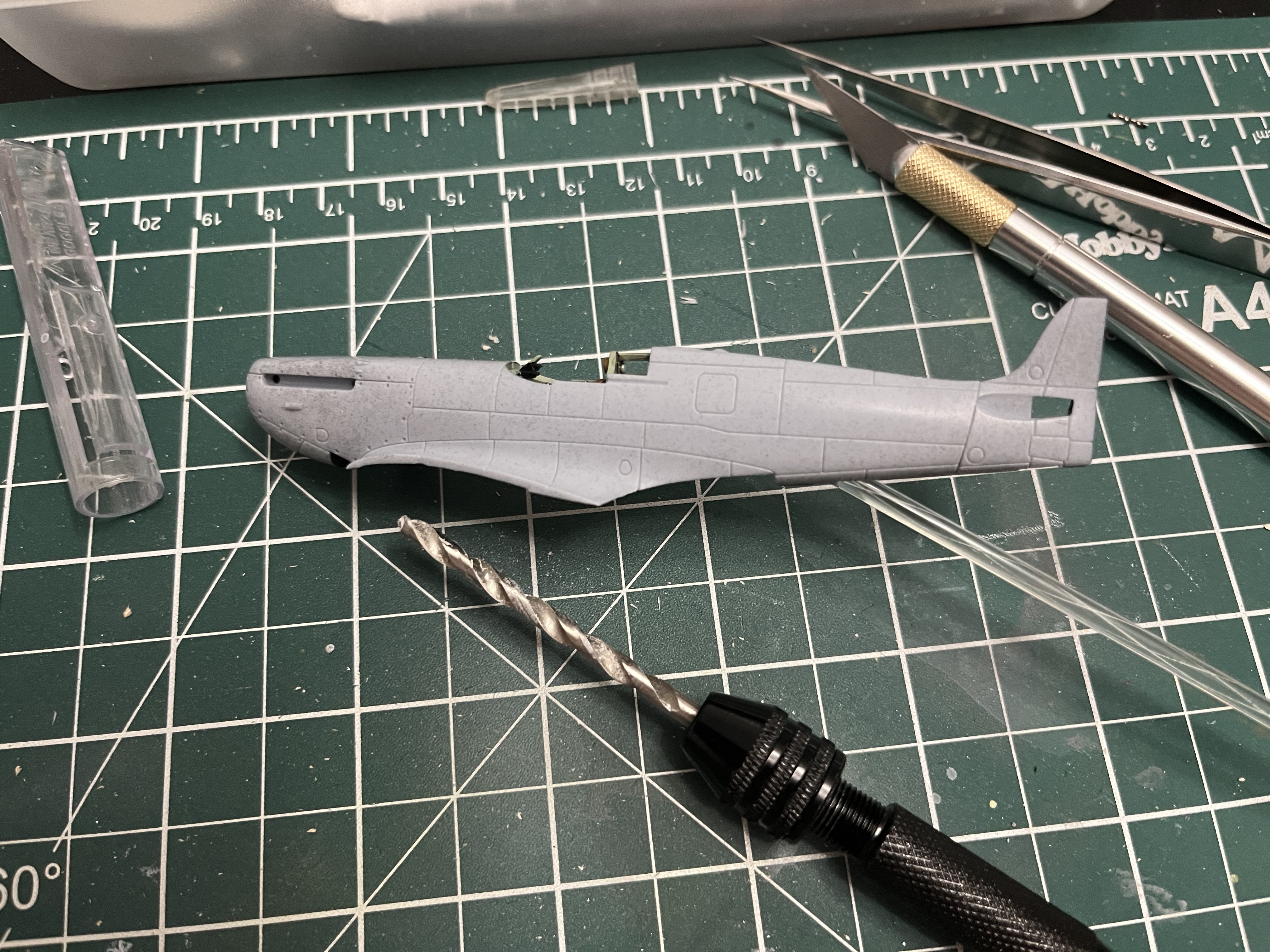 Drilled a hole into the tail section for the small acrylic rod, which will be bent with a heat gun into a “C” shape to hold the aircraft. The base will be black with the top surface an RAF roundel like my avatar.