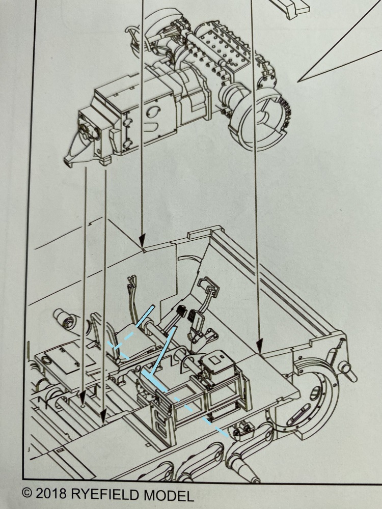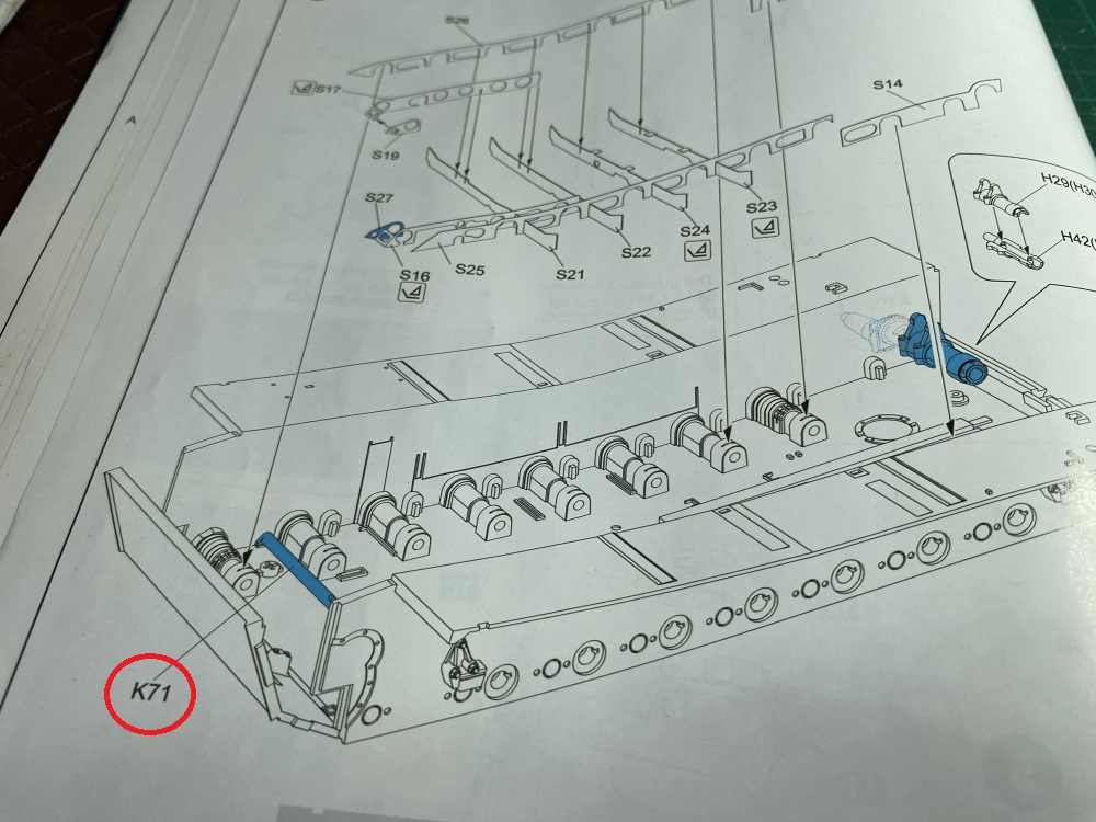 Back to the build. The vendor had done a good job on the suspension, except it could have been movable but he glued it all dead level. And his strange methodology omitted parts even on seemingly completed sub-assemblies. For example, here the plastic part K71 (incorporating the steering levers) was supposed to go under the PE longitudinal braces…