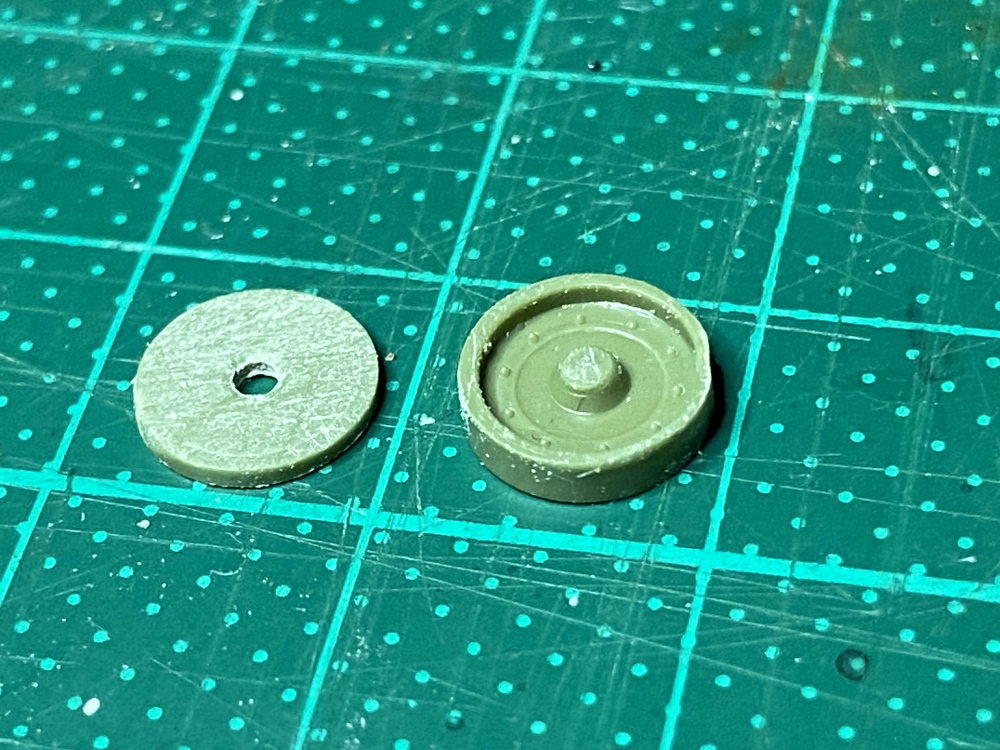 Why make a single part when you can chuck 4 nano-parts at the builder? And just for fun let’s not bother to provide positive location points for them either, a 0.001mm depression in the wheel hub on either side will surely suffice. The whole assembly is 7mm long. Well, shockingly I actually did make one as shown, after chasing the parts round the workbench for an hour or so. But the first two parts of its brother flew off into the carpet monster’s gaping jaws never to be seen again, and Life’s too short to get the vacuum cleaner out. Just ridiculous. Will it be visible with an open hatch but an opaque roof? Not much, maybe I’ll scratch a rough substitute.