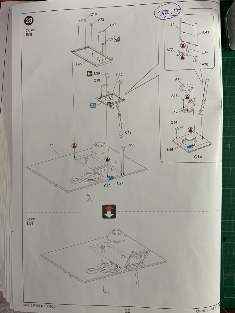 The next steps were the wheels & tracks, but I’ve jumped ahead to the last interior area so I can paint everything inside…that’ll hardly be seen. And immediately the 2-page instructions for the interior roof fittings bamboozled me…