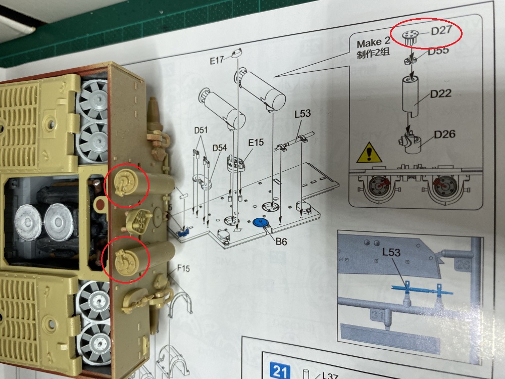 Meanwhile, finally, I’ve collided with a missing part – a pair, the exhaust covers D27…