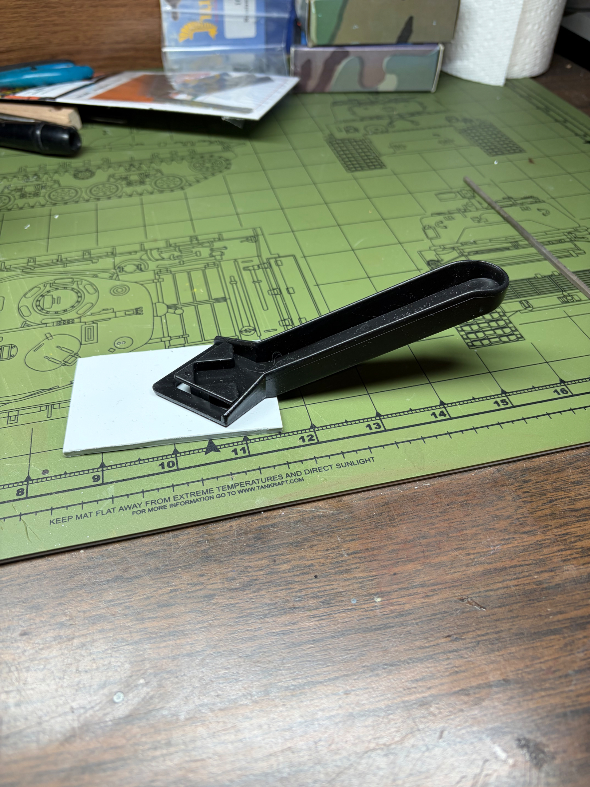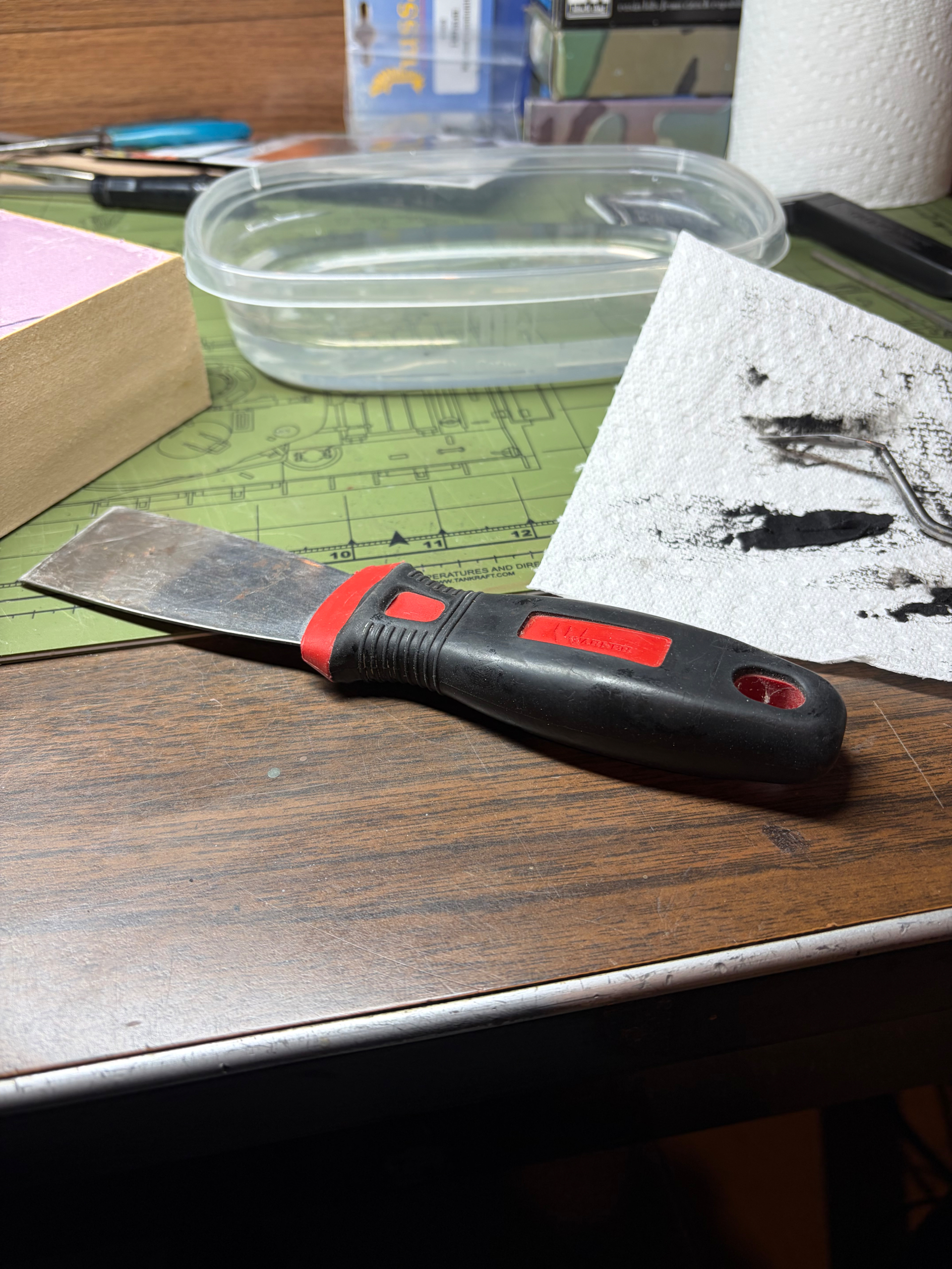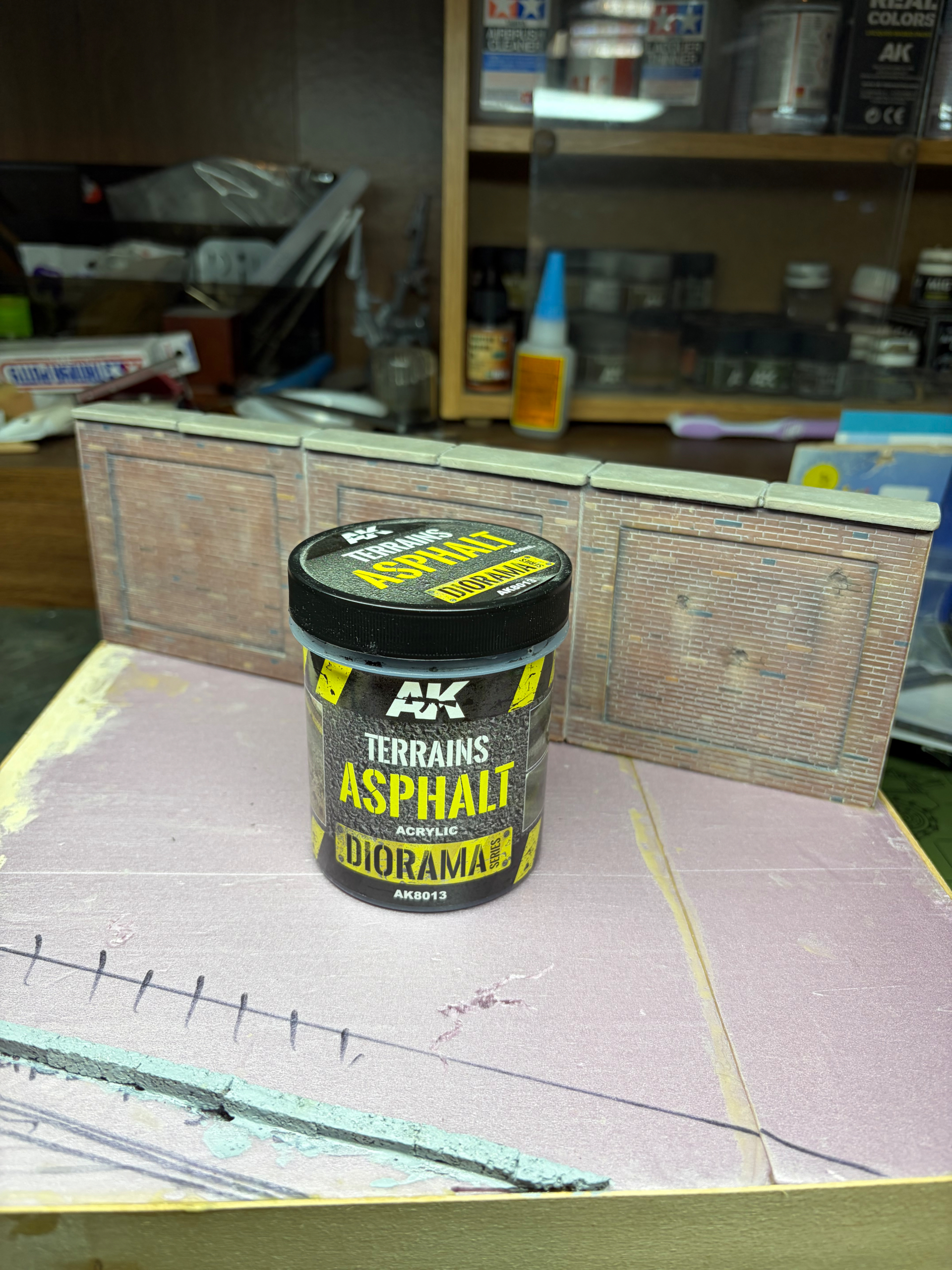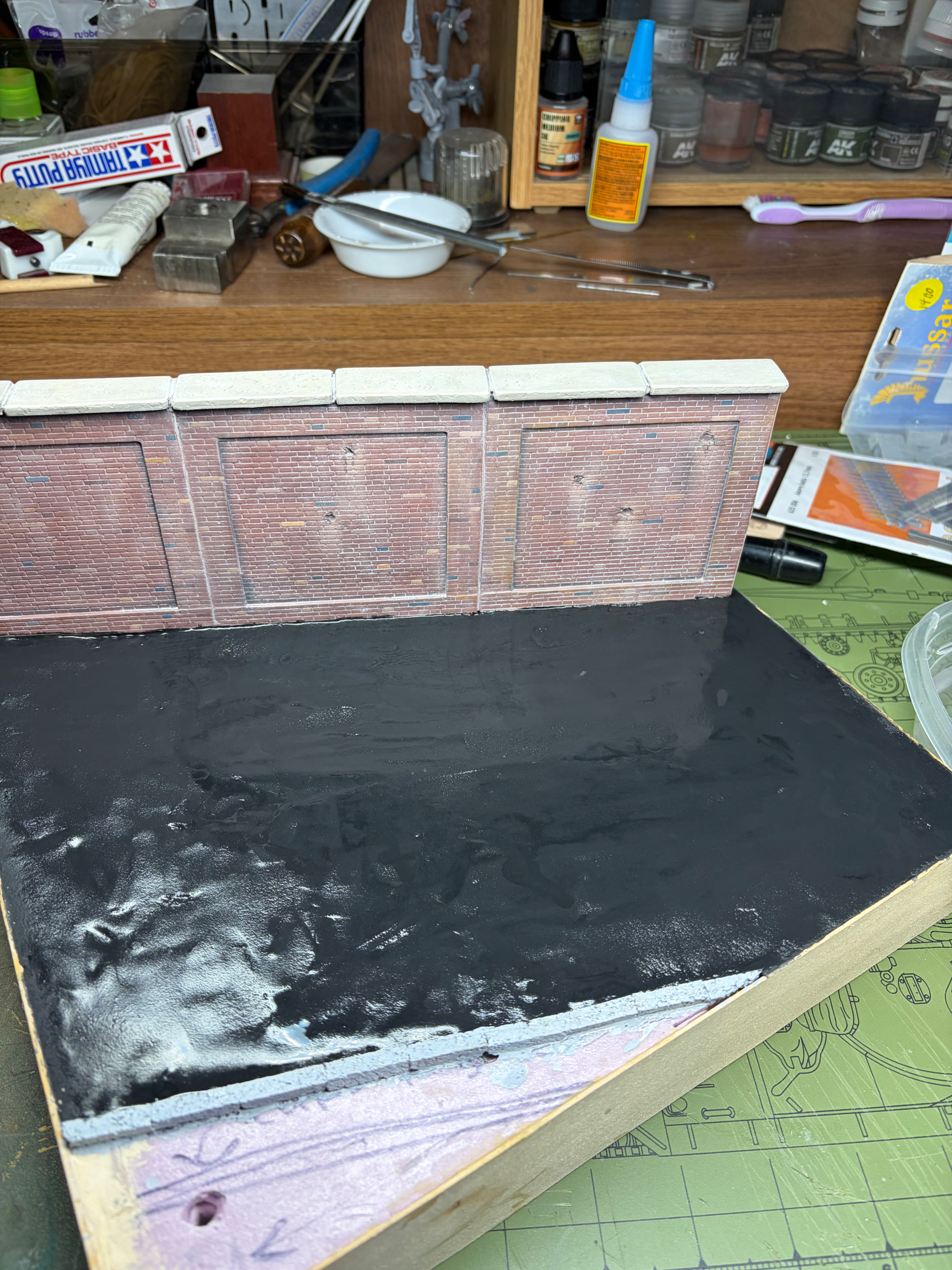 Today I applied the asphalt surface using AK Asphalt terrain product. It’s very thick and when I opened the container, there was a layer of water on top. I spent several minutes mixing it with a metal rod. It is an acrylic product that does thin out with the use of water. First time I’m using the stuff so I was a little nervous. It does take some work to spread it around and smooth it out. As I said, you need the water and it helps a lot. I had originally made a spatula from an old plastic caulk tool I found in the garage which I then superglued a piece of plastic to, but it snapped off about 5 seconds after I started. So I used my old spackle knife. It also depends on how big a surface you are applying it to, smaller bases are easier to manage I would think. Working time is pretty good. I went back and smoothed out a few raised areas with water and a small oil painters spatula. Let’s see how it looks when dry.