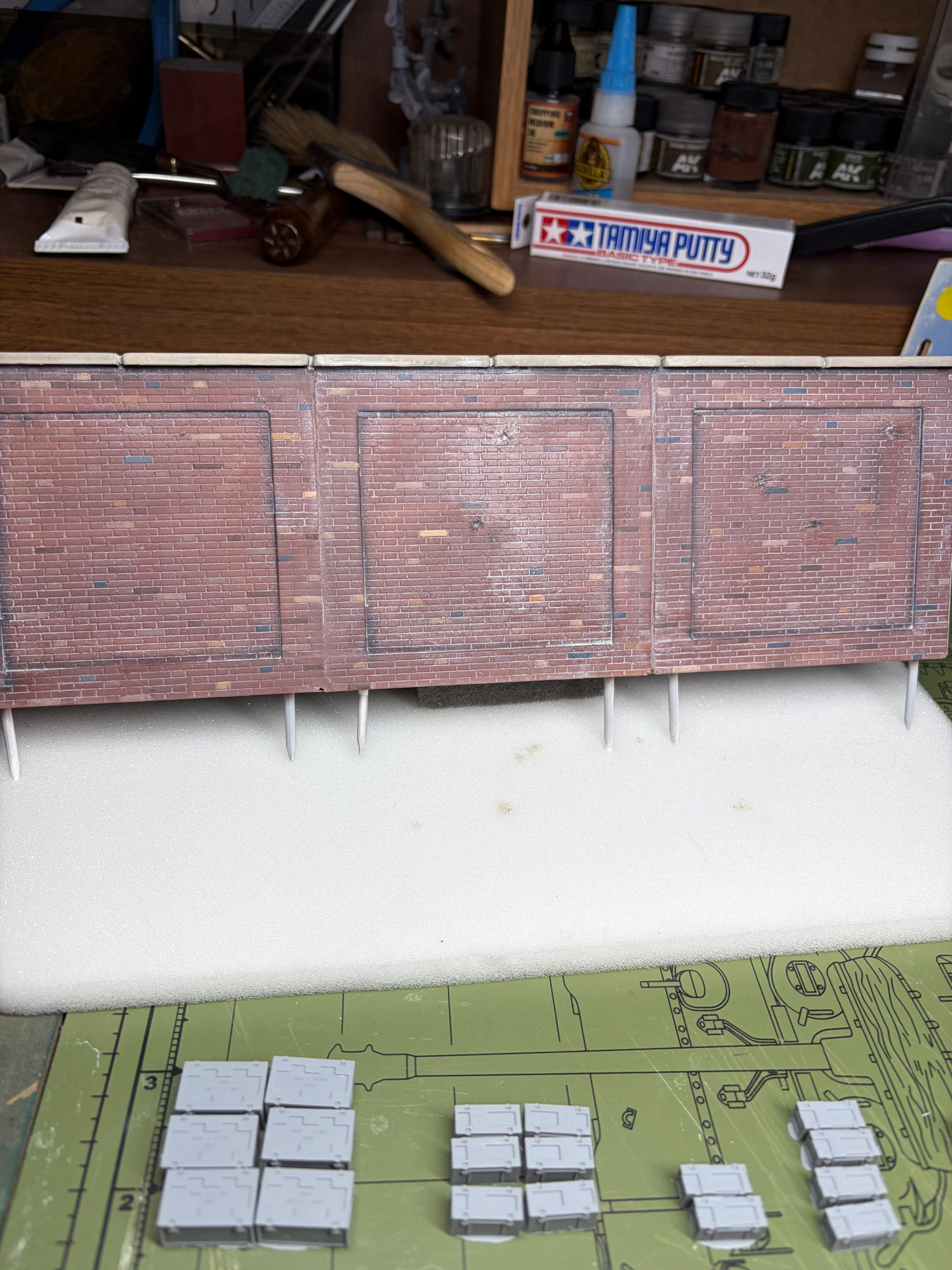 As for the wall, that’s exactly what I’m going to do once I get the basic painting done. I plan on using a light gray wash and see how it looks afterwards, then make adjustments if necessary. I cut 4 or 5 pock mark holes in a few sections of the wall, then I’ll add debris at the base of the wall once it’s situated on the base.