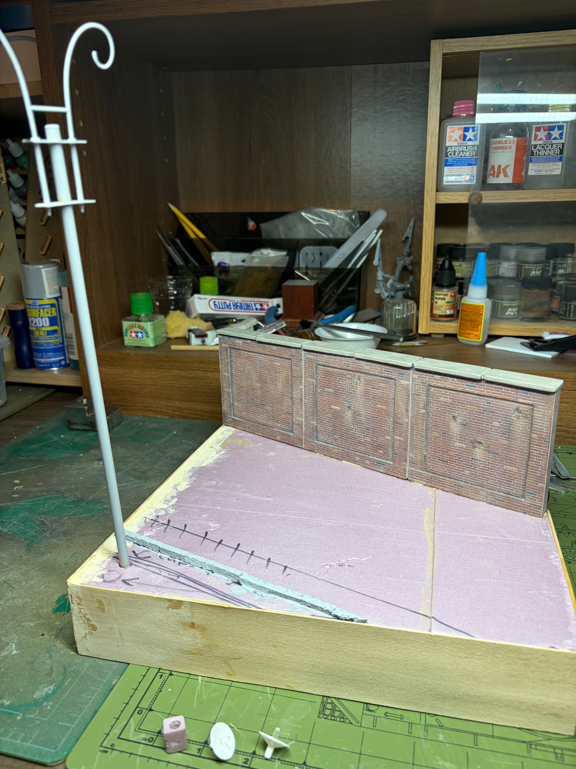 Here’s today’s progress, not much but…I weathered the wall and glued it in place. I’ll dust it with pigments tomorrow. The street lamp has been primed; I set it in its hole just to dry. It will be about an inch or so further down into the base. I made a small simple concrete base for it from styrofoam which will get a coat of Mr. Surfacer and then glue in place and painted and weathered later. I also added a light bulb to each lamp. They are cut down clear plastic wine bottles from a Tamiya farmer set or something. I’ll prime the reflectors by hand so i don’t mess up the bulbs. I plan on lamp post aluminum and weather it after. Tomorrow I will add the asphalt surface and ground work inside the curb where the light pole is.