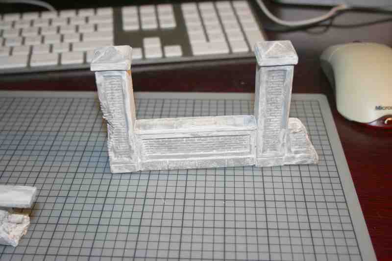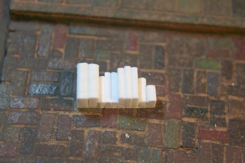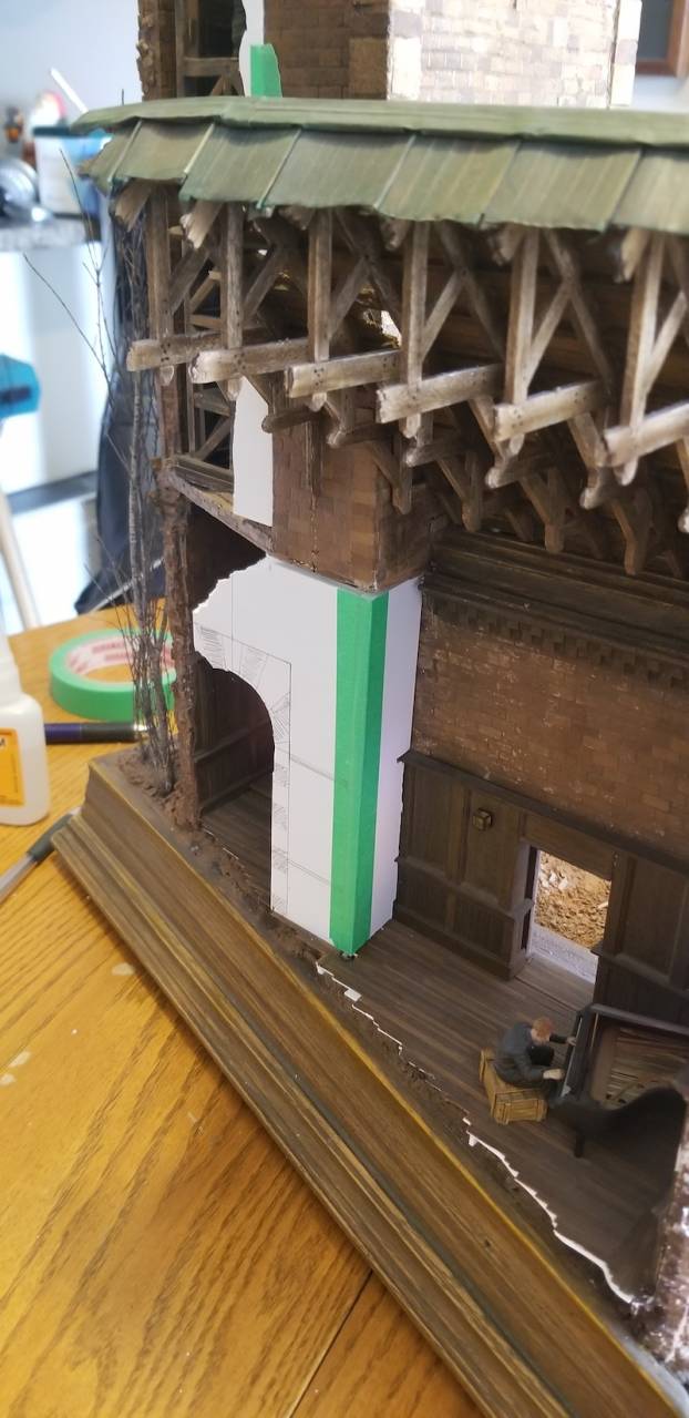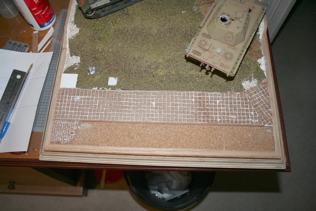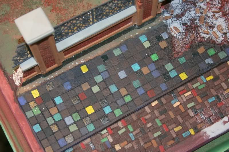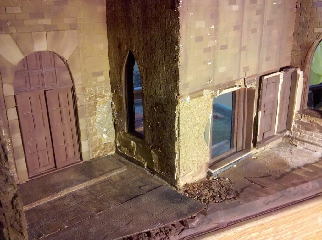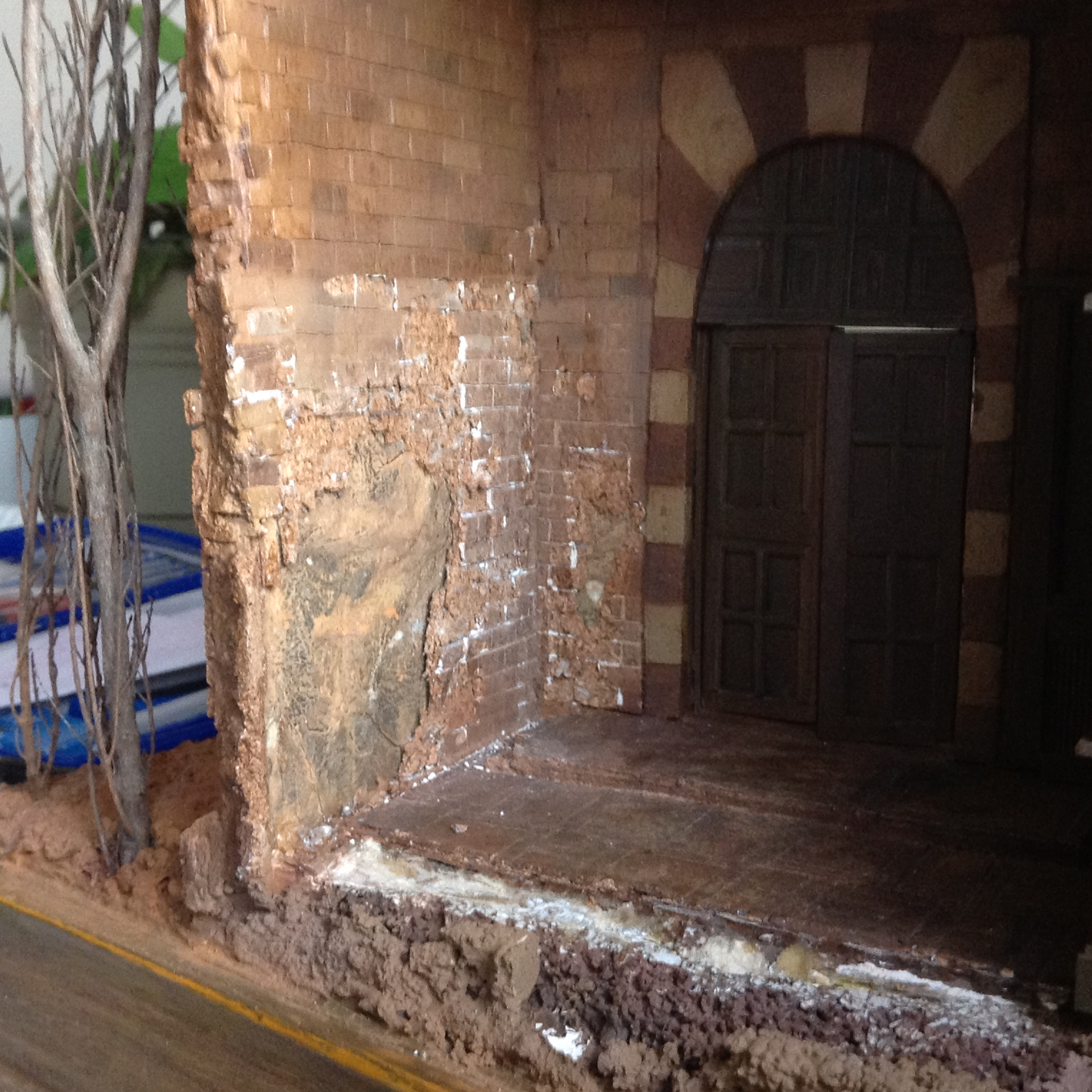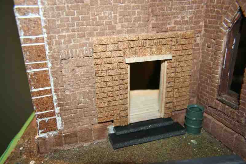 A few of the WIP of the street front area… again dozens of individually cut and glued down pieces of adhesive backed cork sheet. I used PVA glue as well so that if the adhesive ever wore off the backing of the cork it wouldn’t fall apart. Redundancy. It’s not just a four syllable word!