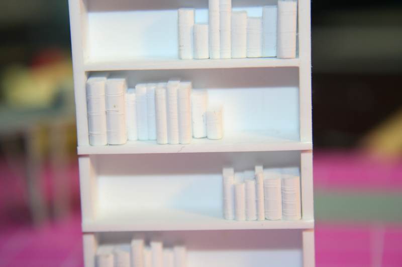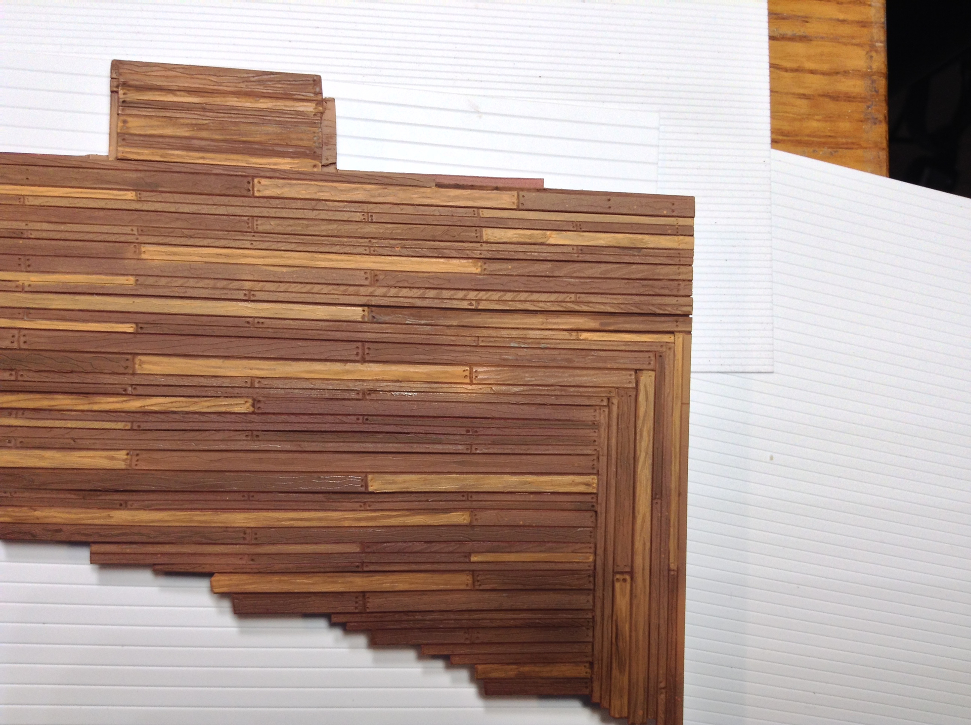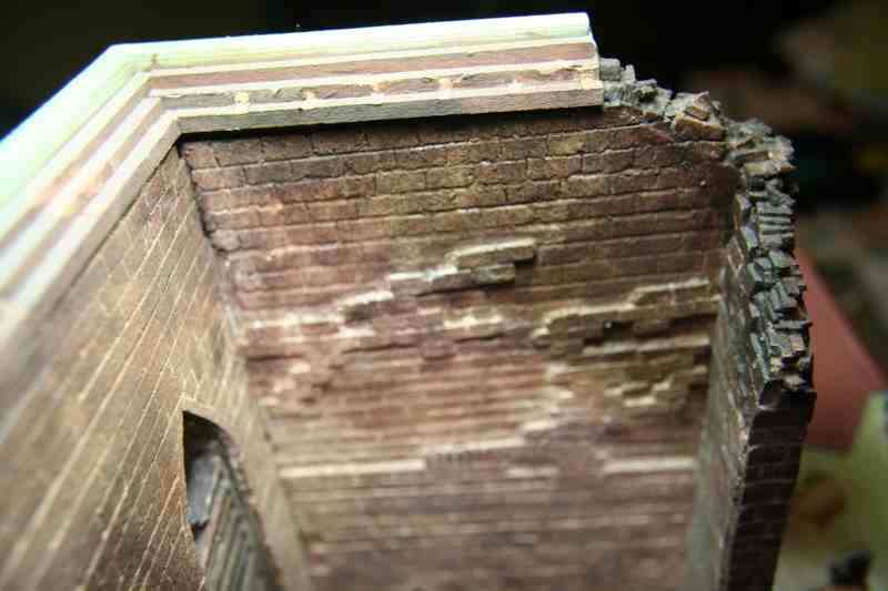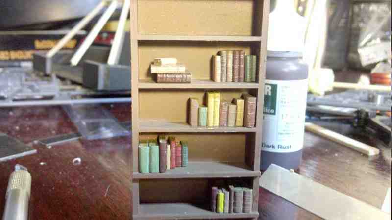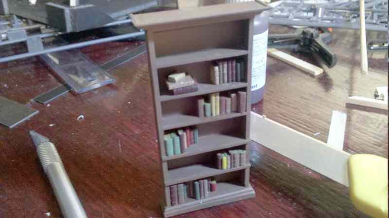Thanks Jeremy. Sure. The majority of the structure is a foamcore board construction, with the bulk of the exterior and upper portions of the interior surface covered in thousands of individually cut and placed pieces of adhesive back cork sheets. The lower sections of the interior, and the doors are Evergreen plastic of various sizes and thickness, cut and glued using a variety of hobby tools and mostly Tamiya extra thin adhesive. The piano is also scratchbuilt, along with the bookshelf and assorted books. The trees are pieces of a wicker wreath type thingy, cut and painted to resemble poplars or similar trees.