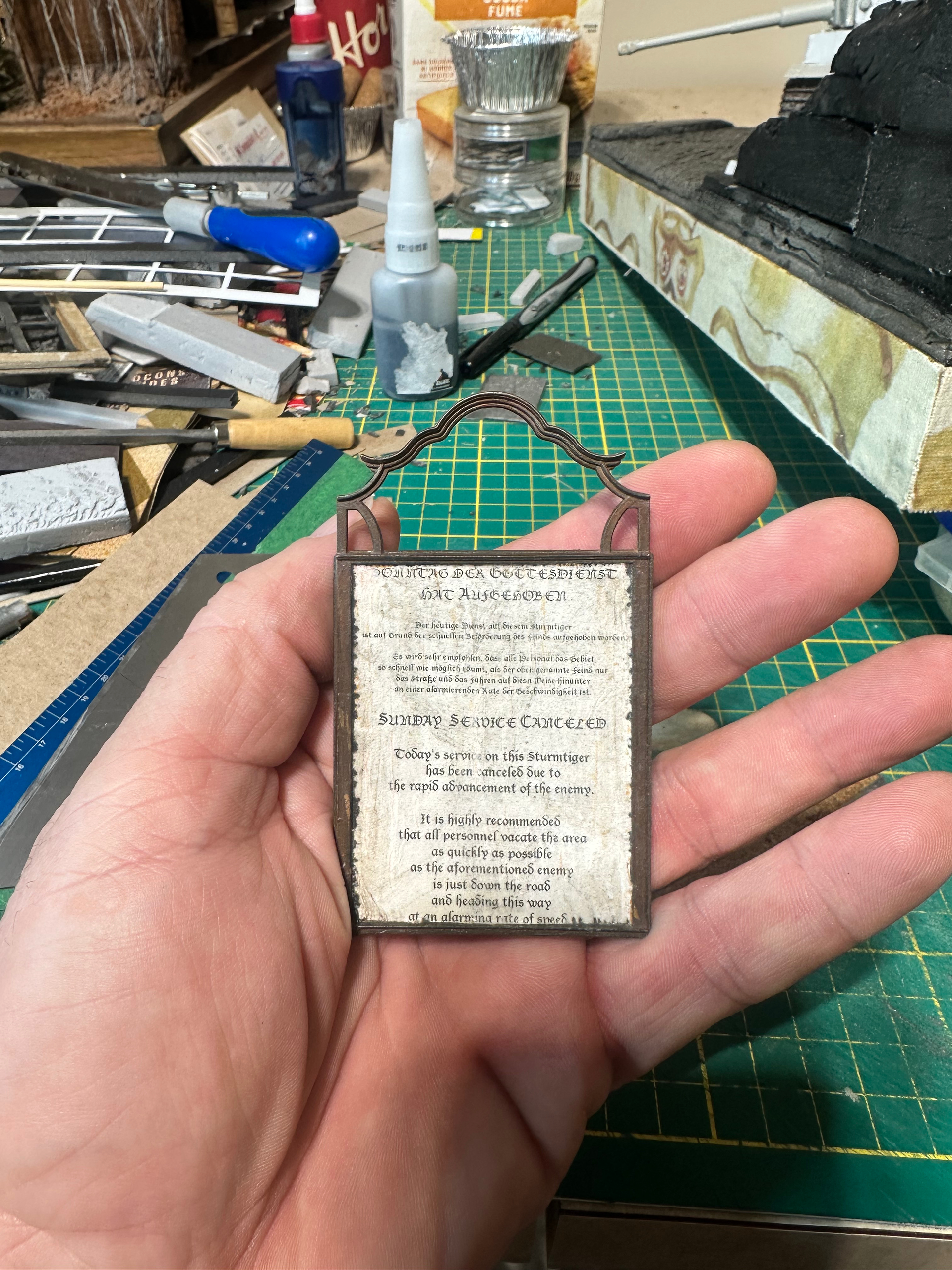 One more before bed. The sign that would normally stand outside the church, perhaps with the coming sermon title and the pastor’s name; or the churches name and address and service times. Now, well at one time before I removed it to take this pic, it resides underneath the Panther that has busted through the gate to the property; and describes the diorama to the keen eyed perusers of the scene.