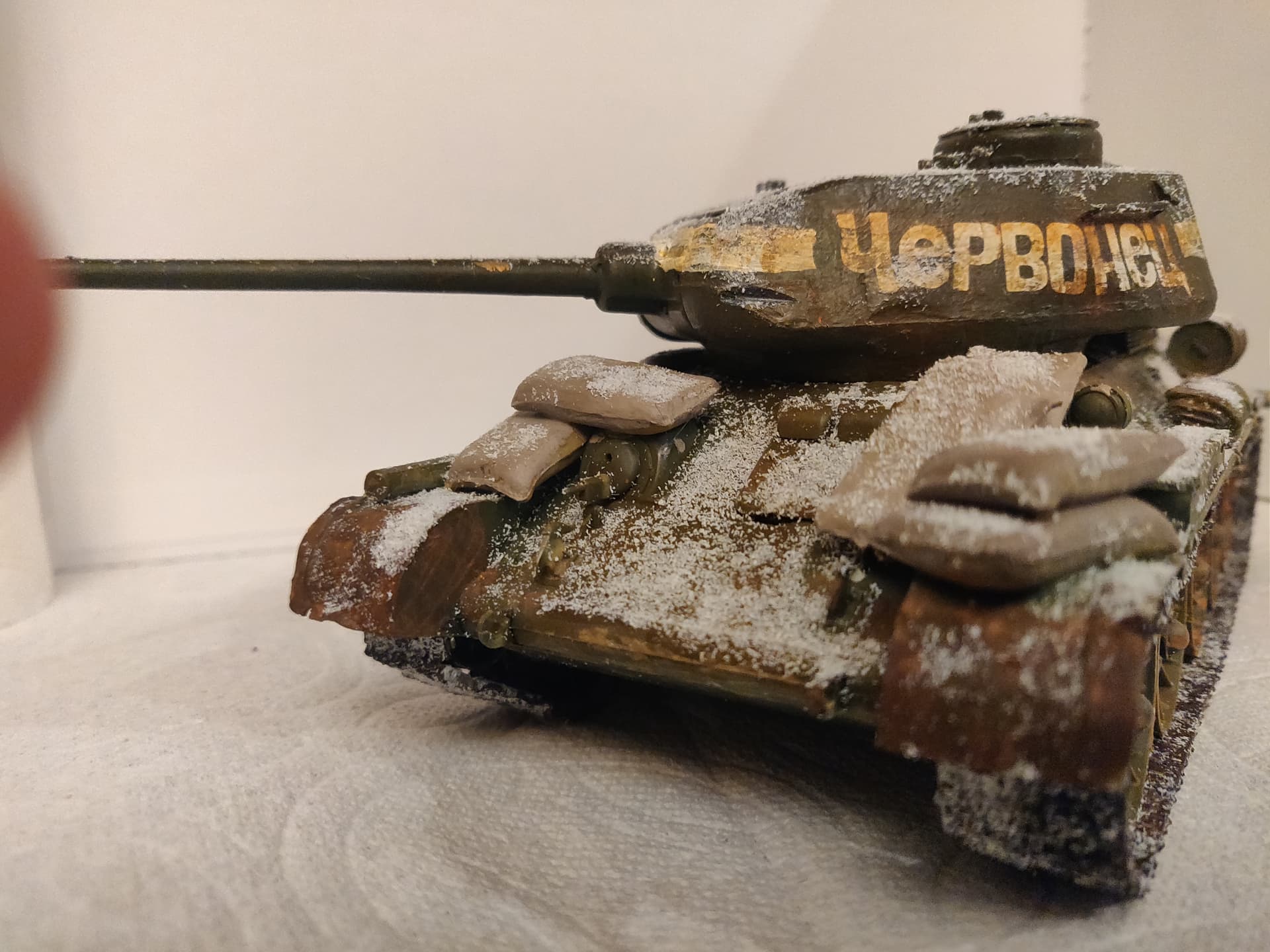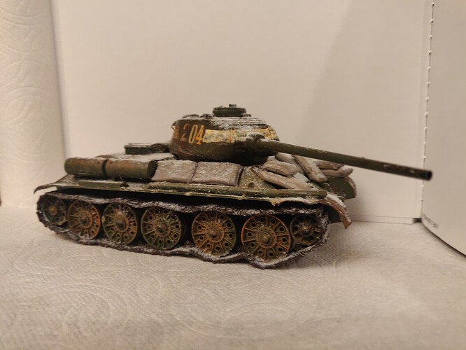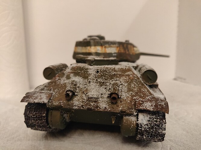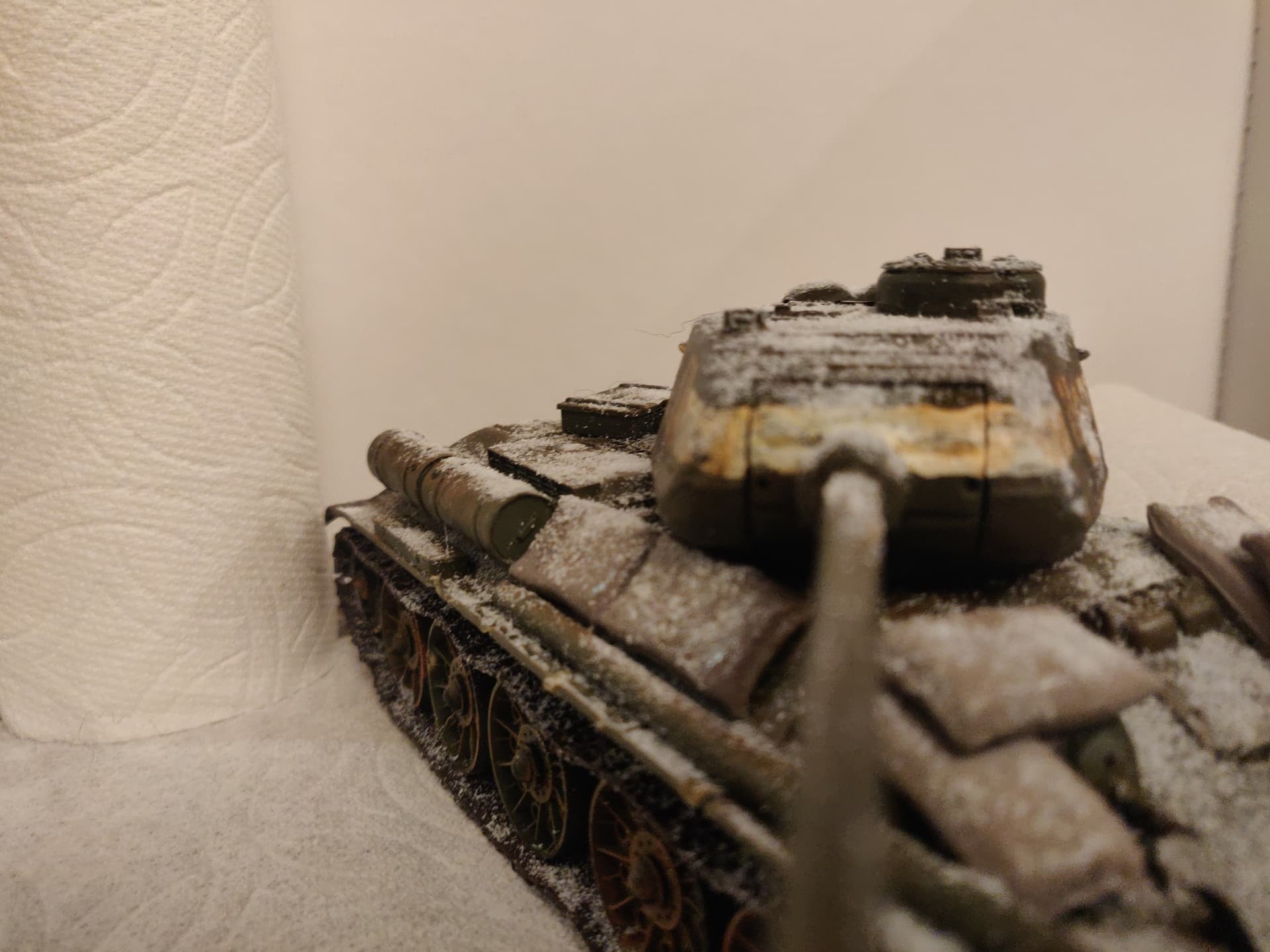 Finally, after, uhh… some time, I have finished the T34. And, as you can see, I am NOT the best person for that kit. I messed up the chassis, (that sucker’s from a T34/76) had to putty the last 14 track links, (ran out of wire) and add snow to hide hideous imperfections. All in all though, it was fun!