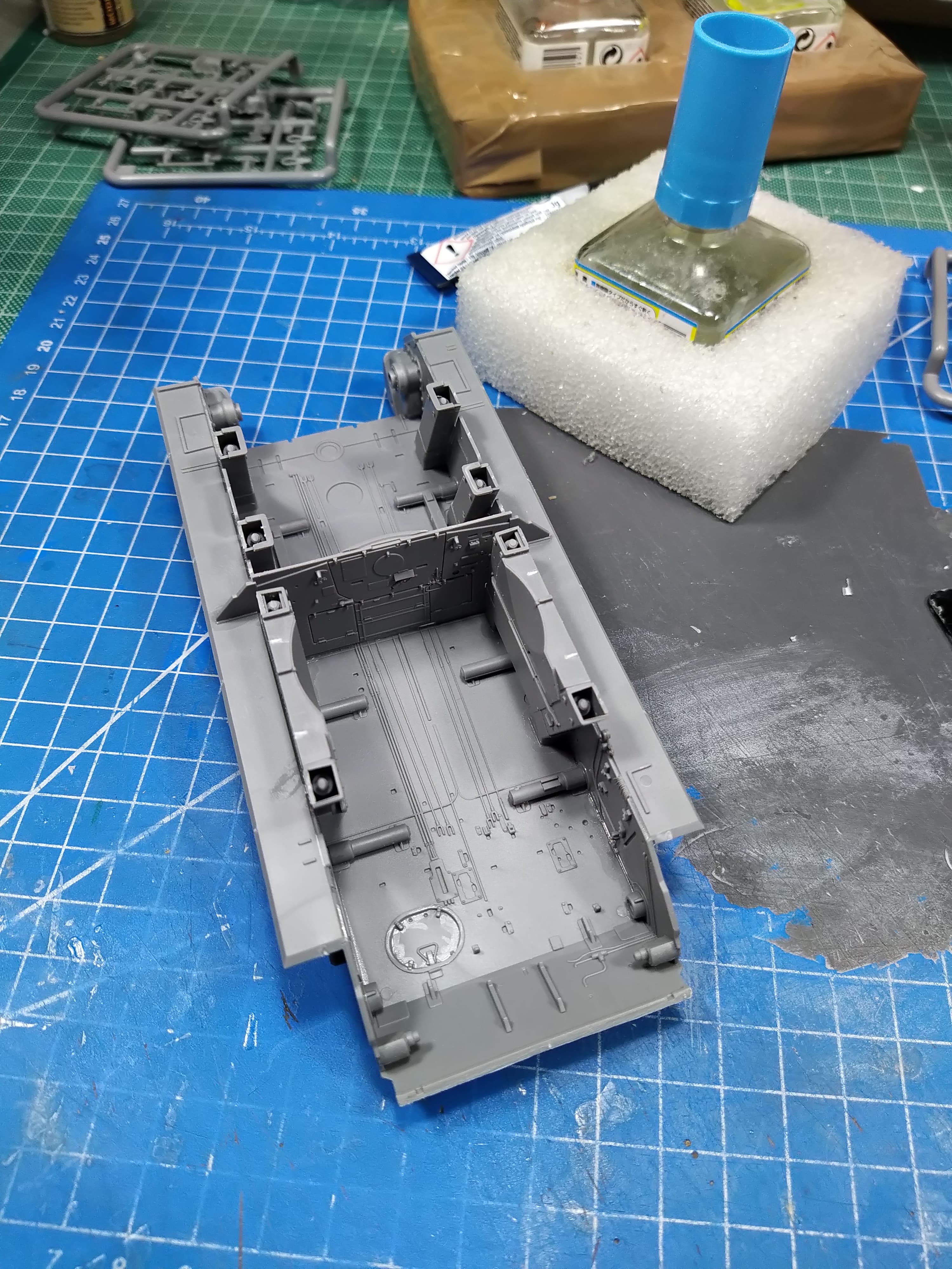I am happy to report that I could finish the build works by this weekend and now the black primer is applied to the hull, too. There are plenty of nice details in the kit and lots of challenges with the PE parts. I spent a good afternoon only on the towing cables to ensure that the securing belts are nicely linked to the U-shaped tiny parts on the hull which broke up several times. Finally I could tackle all parts but it was really a big challenge. Not a kit for the rookie or inpatient modellers.