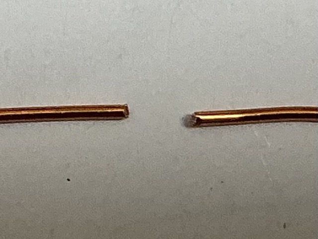 The copper wire on the left side in the first photo was on the flat side of the snippers, the pointed end on the other.