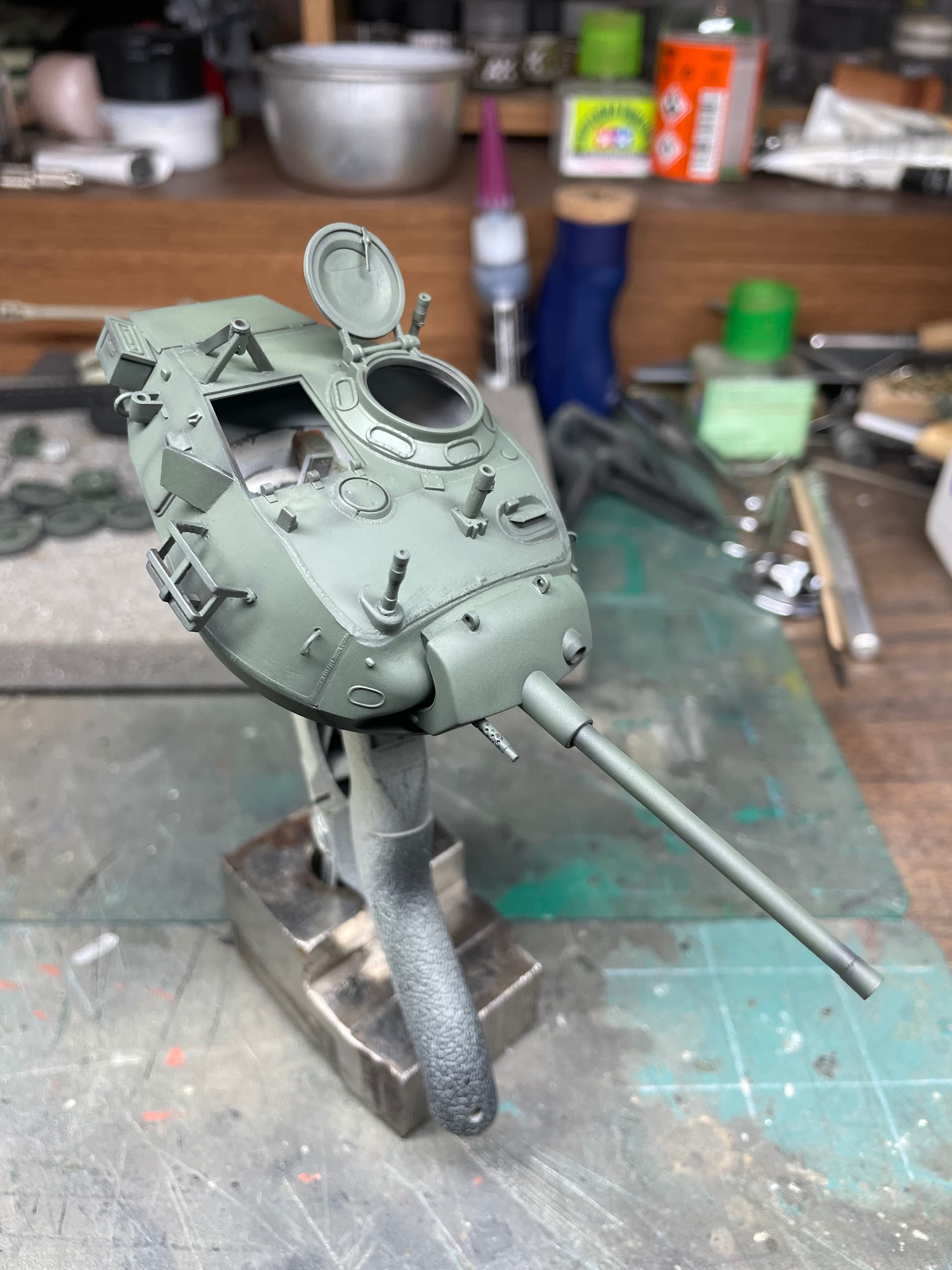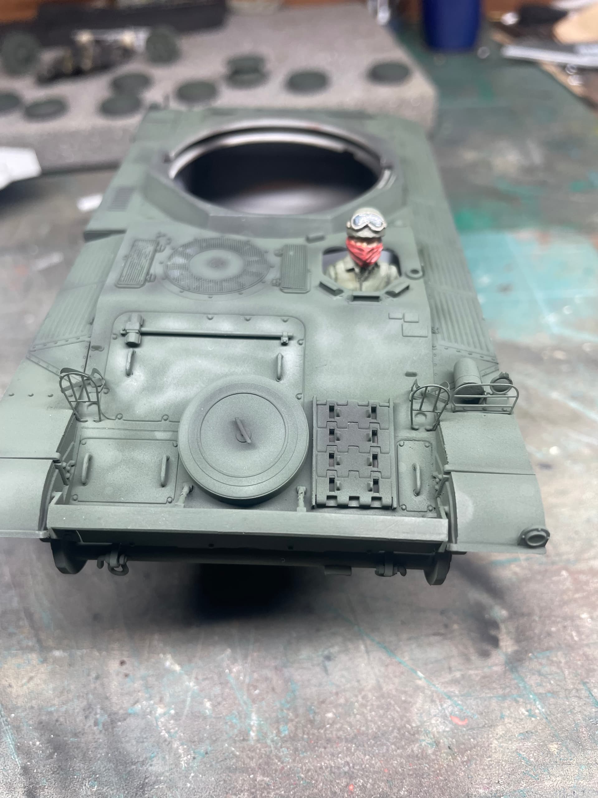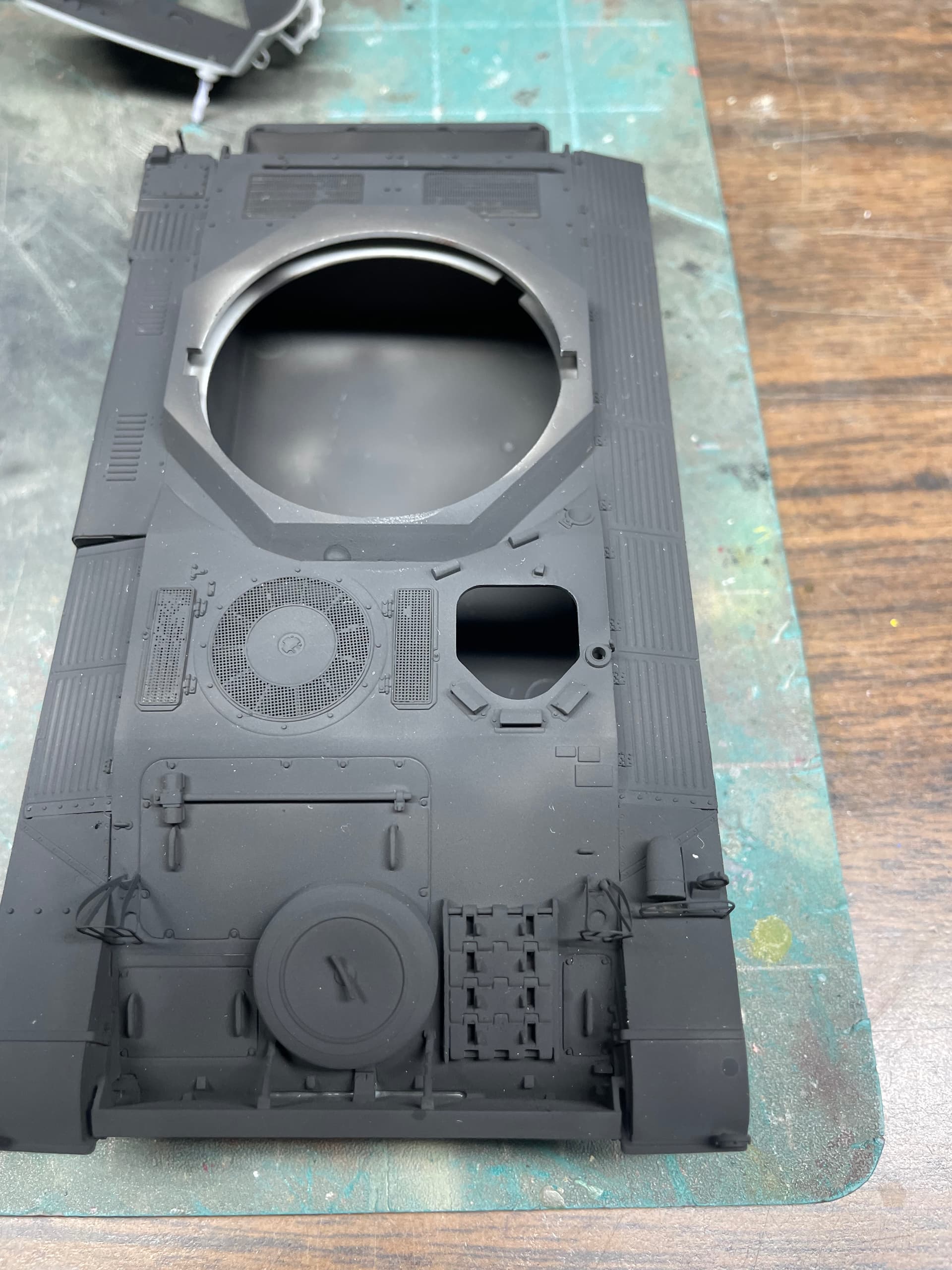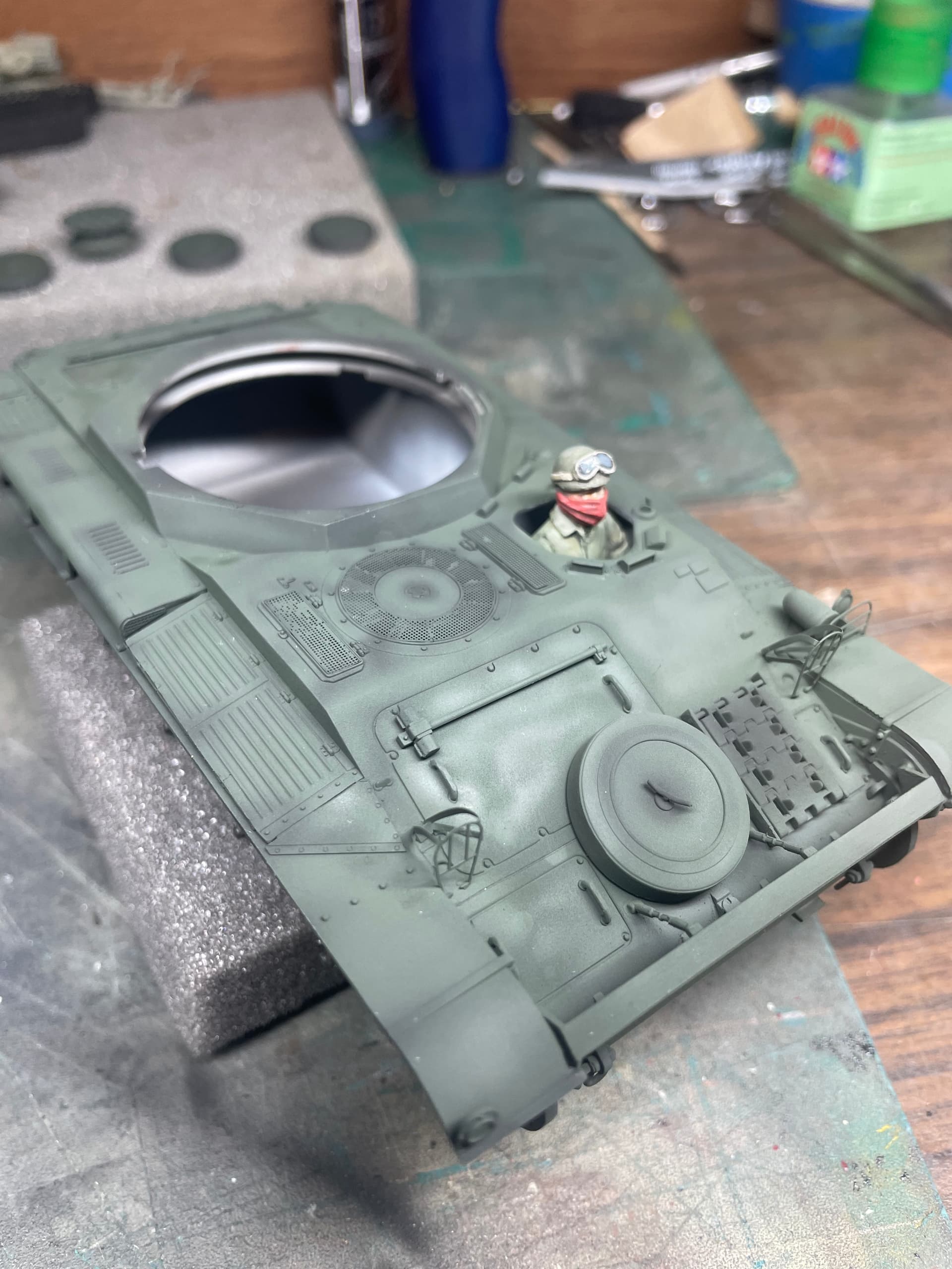 Finally got some paint on the hull. The turret interior was painted and given a wash, I will have the hatches open with crew members in them. I also got the driver painted and seated.