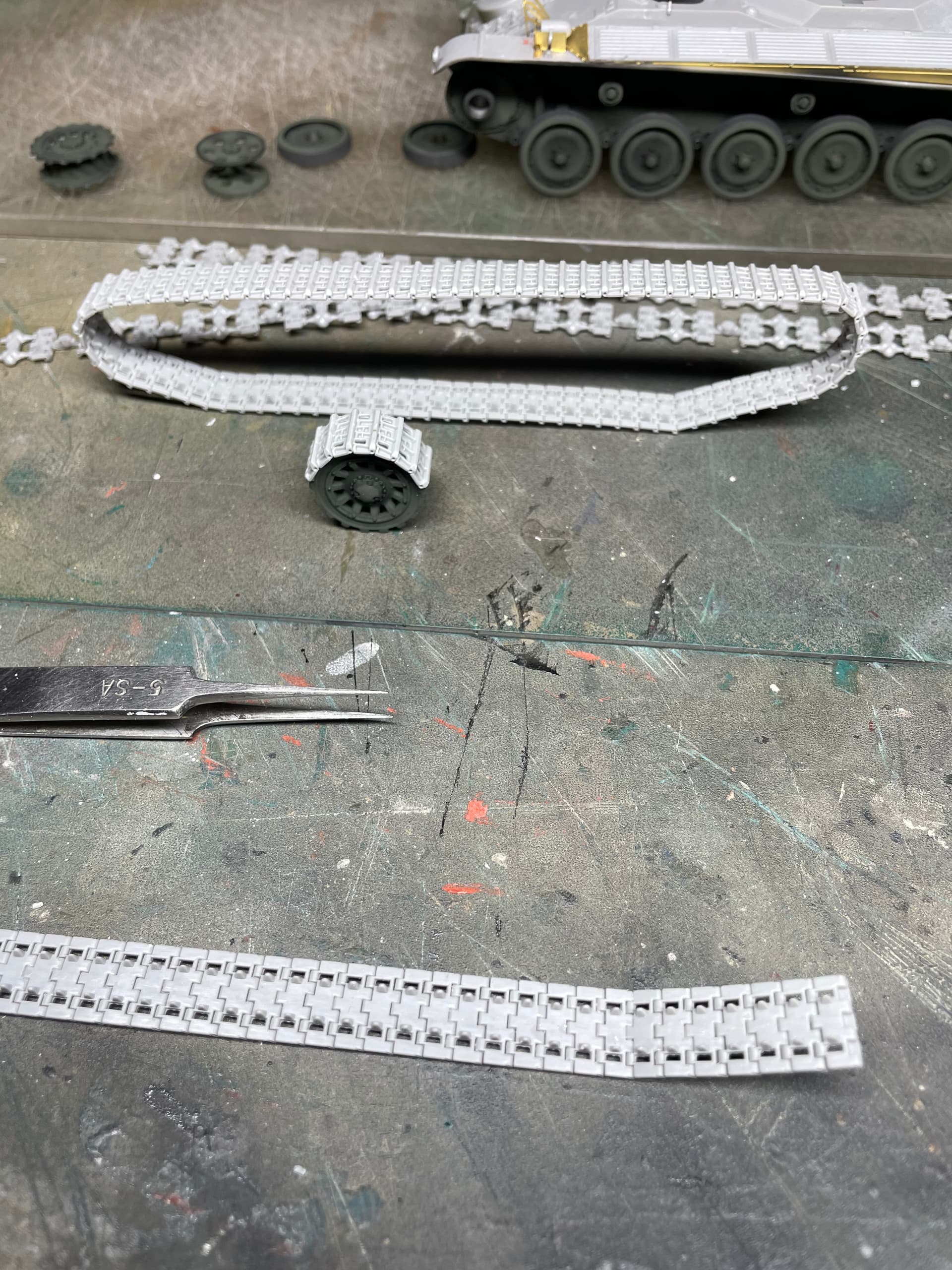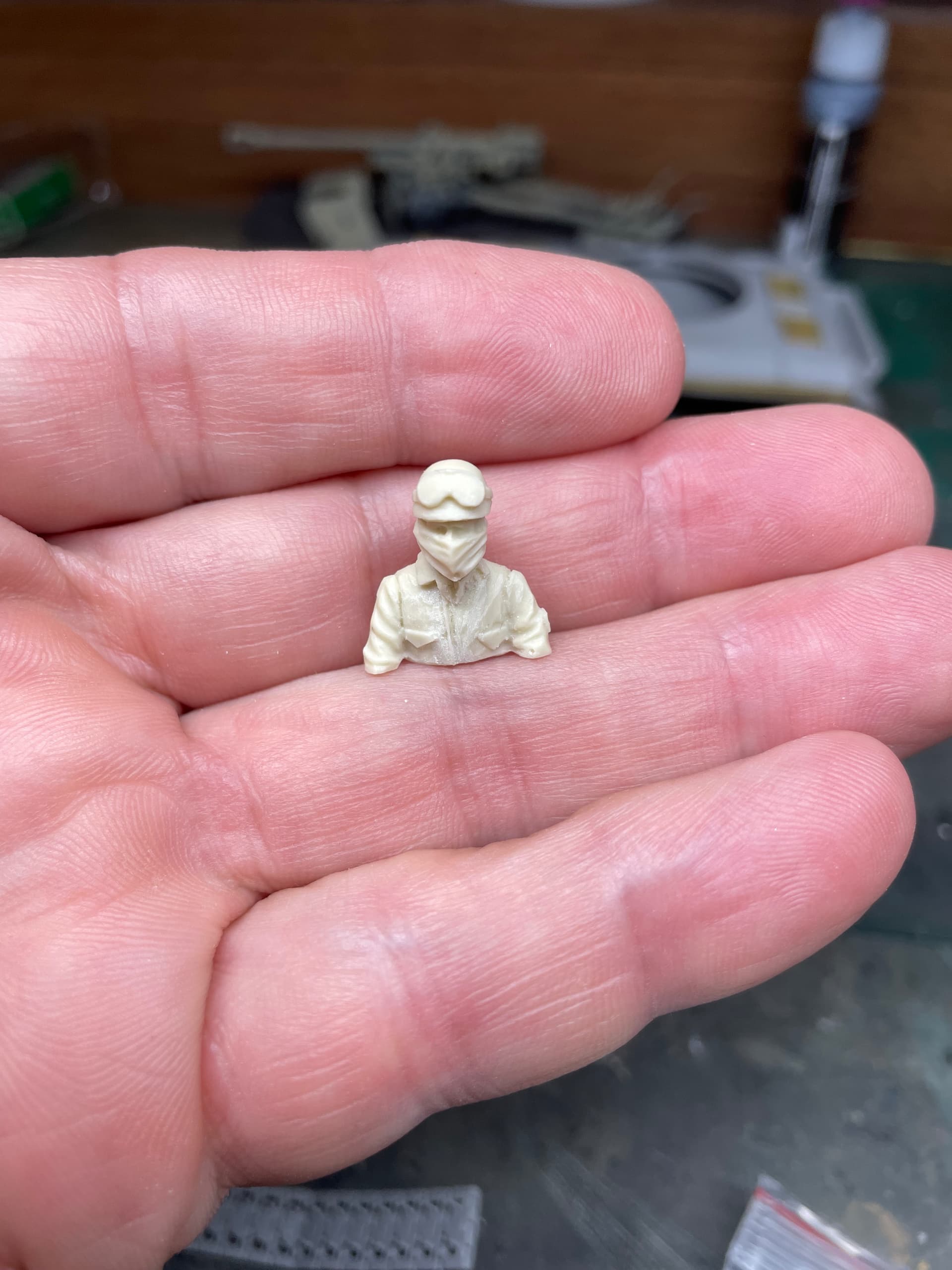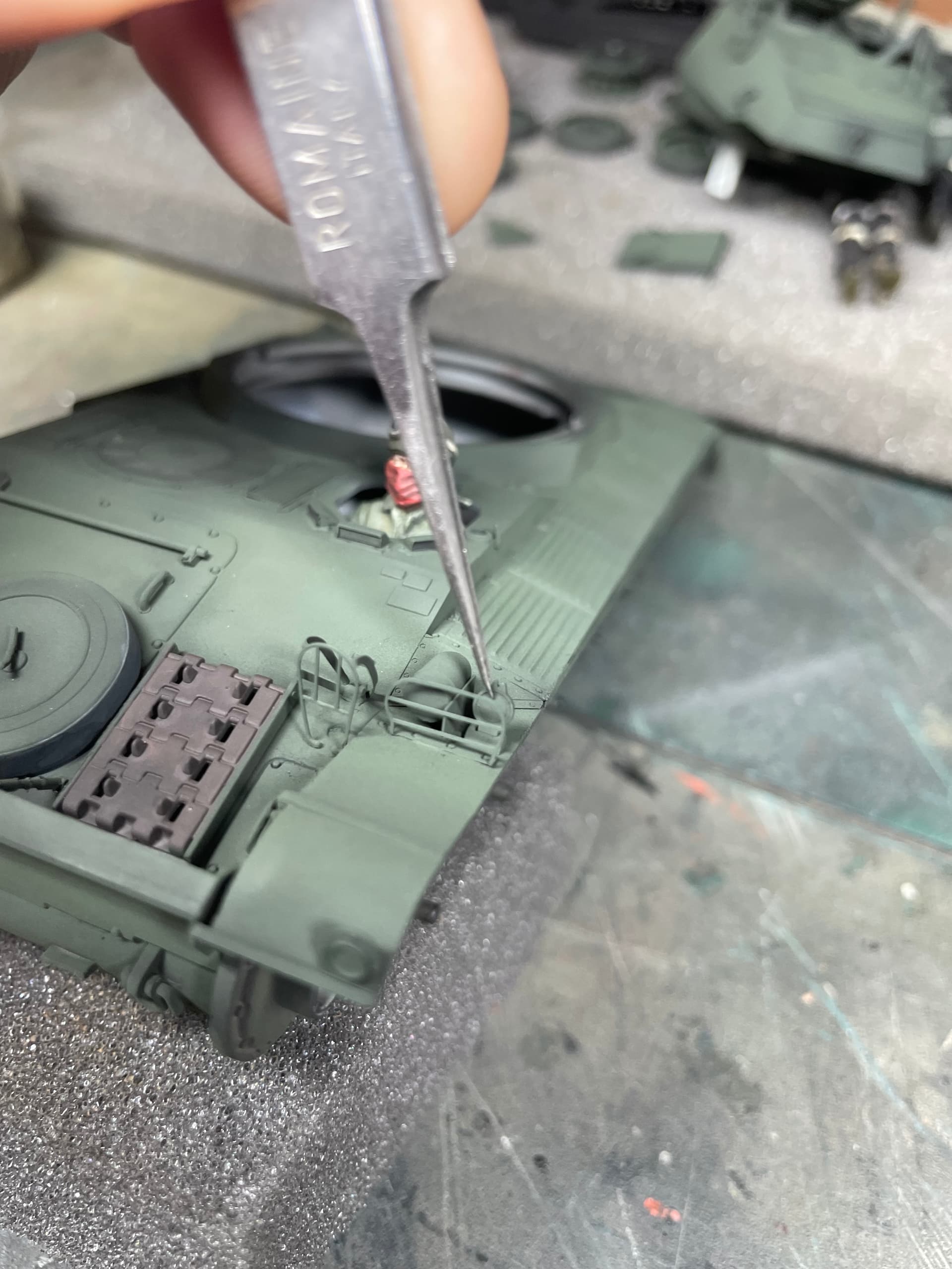 While letting the glue dry for the tracks, I started carving off and sanding the commo straps on the driver.