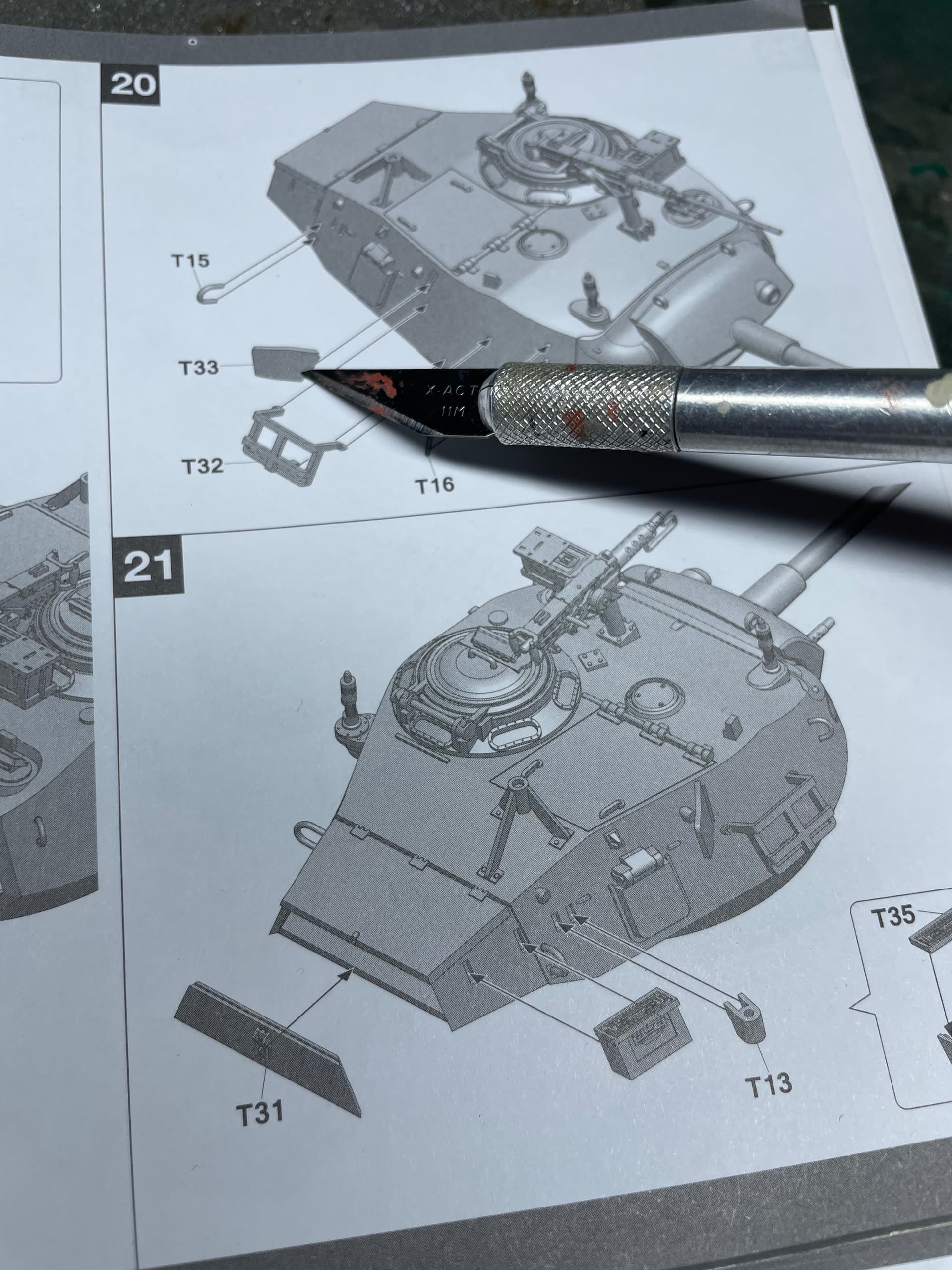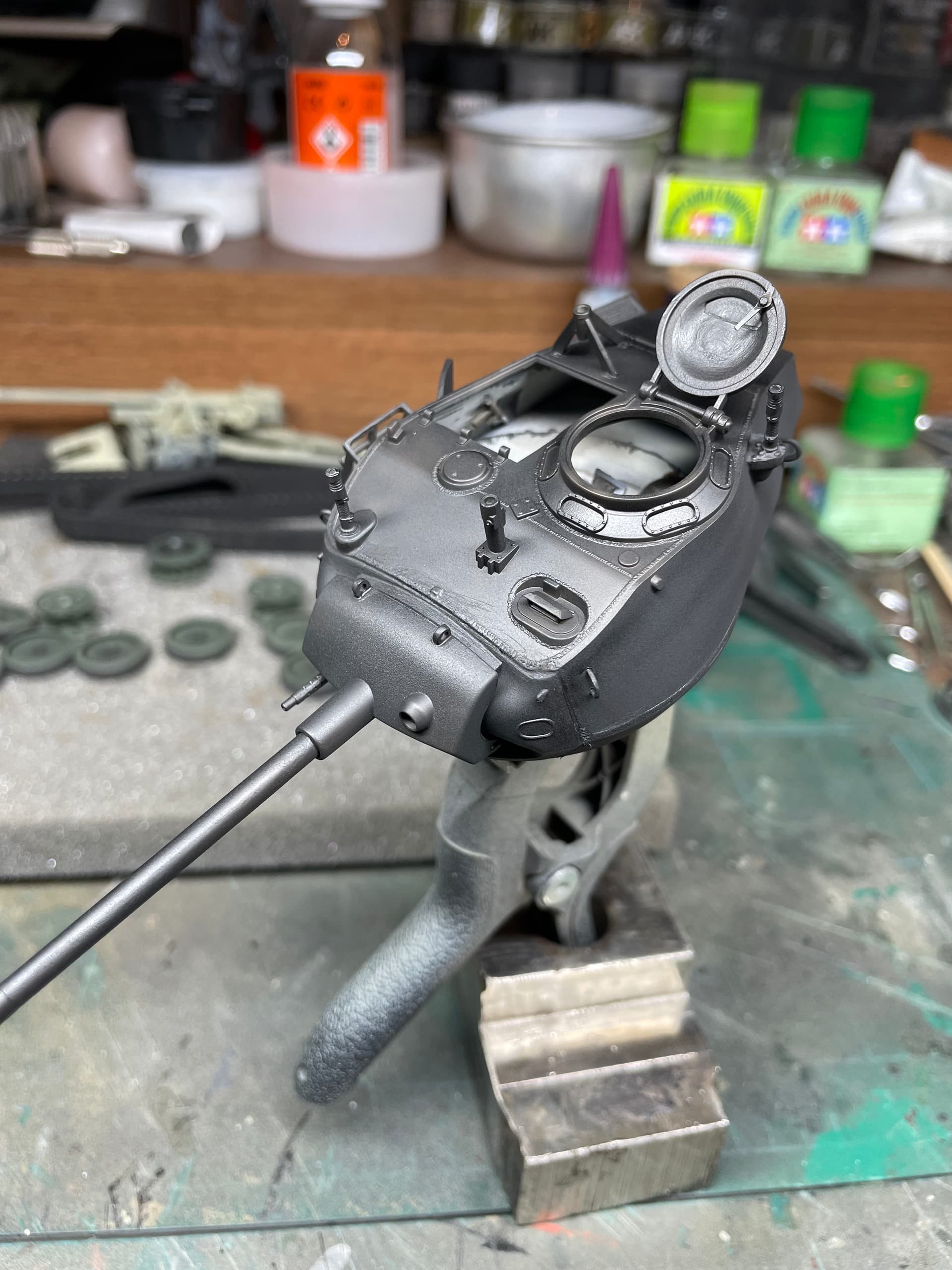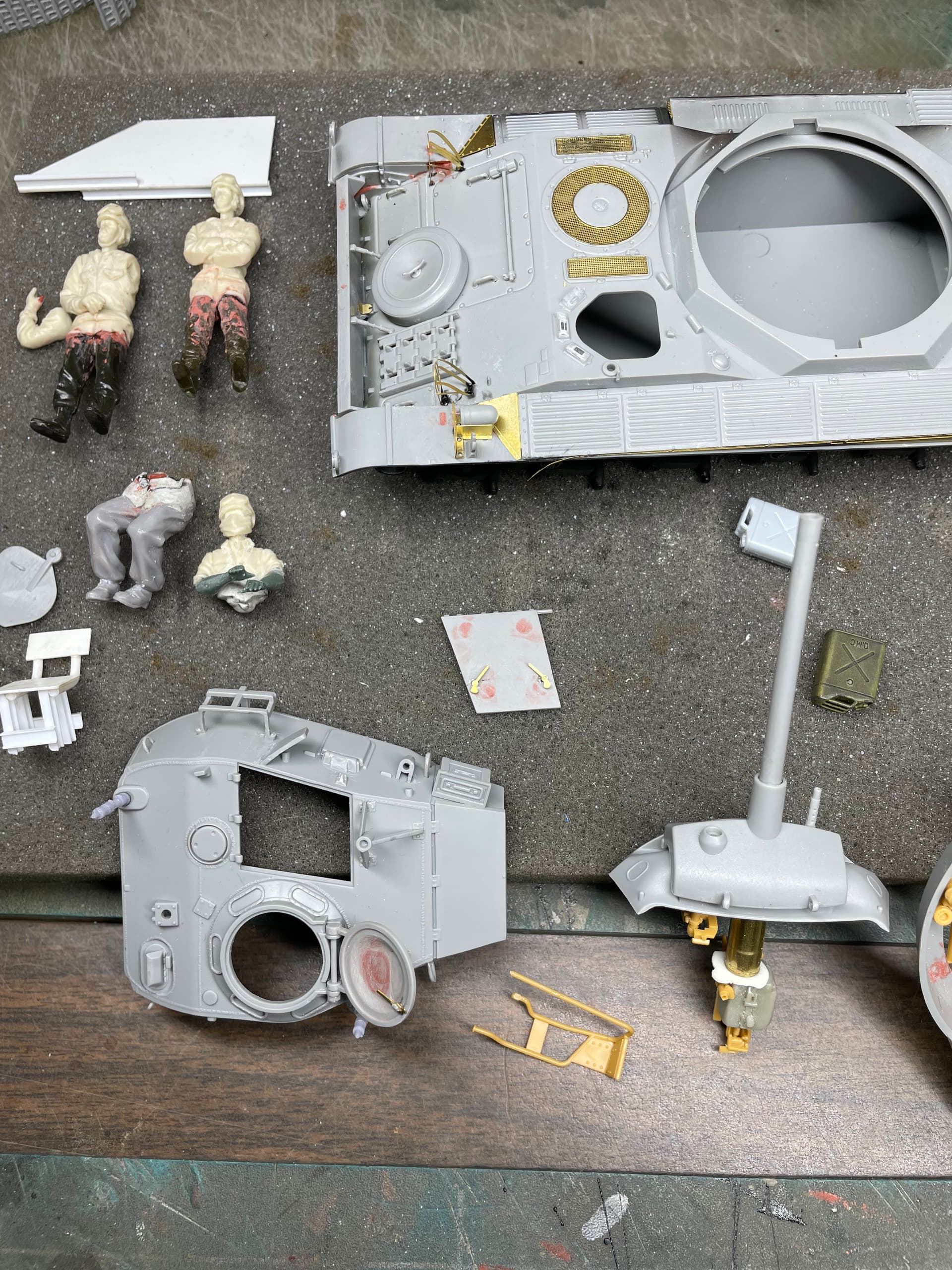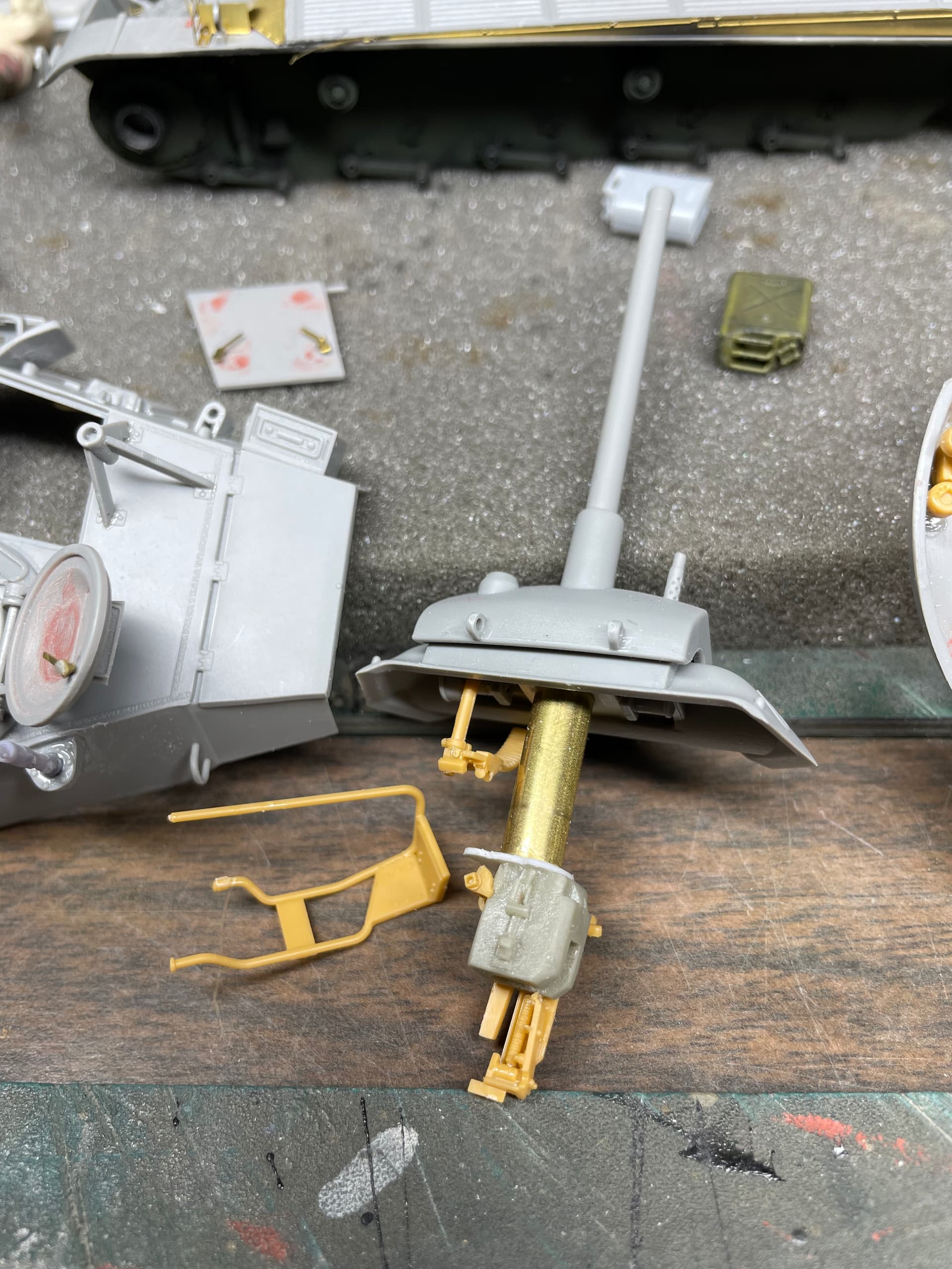 I managed to get some more work done on this project. I decided at the beginning to leave the turret/ drivers hatches open so I could use the figure set from Blast. I did add a few turret items from a sprue of a Bronco Chaffee turret, they are the yellow parts; just the seats and gunners controls. The main gun breach is from an old Resicast M4 75mm gun - even though it’s not the same as the one in the Chaffee. I also made a crude drivers seat and a wall next to him to hide the open space next to him.