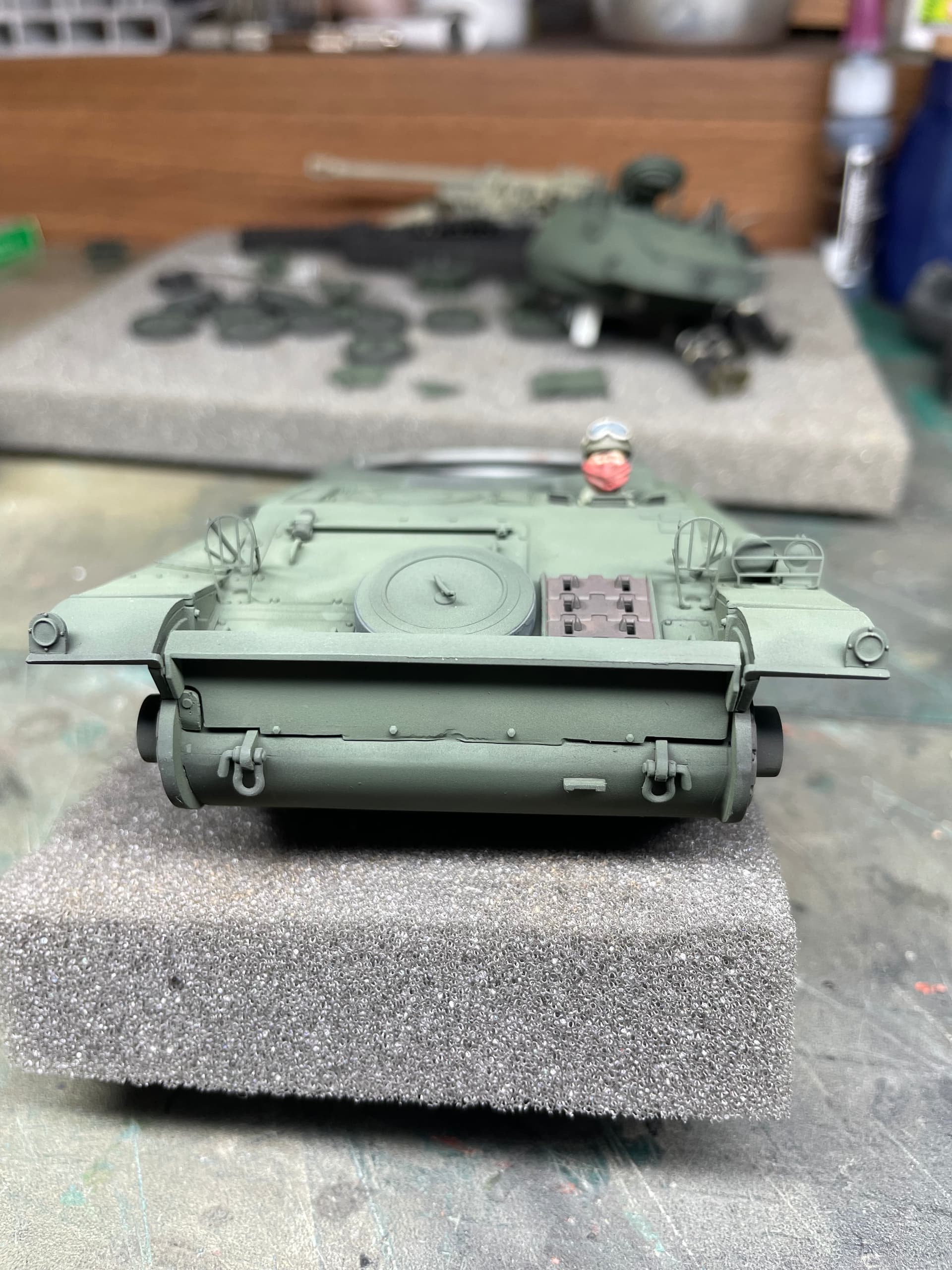 Richard this model looks excellent and the driver looks just right. All AFV crew wear face scarves if they’re in dusty environments and there’s no regs stating what color that scarf has to be. The red scarf does catch the eye and is well done. Good choice.