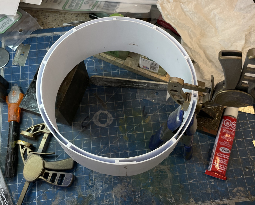 Then I tried like crazy to redo that spacing ring and still couldn’t get it the right size. Yesterday’s ring was a good 1/16" undersized. I cut a new ring, to laminate it to the existing one to give additional stiffness AND enable me to make it out of two pieces of styrene since I had no more pieces of sufficient size to cut a 6.25" circle. The pieces I cut ended up being undersized also… not as bad as the original ring, but still not right.