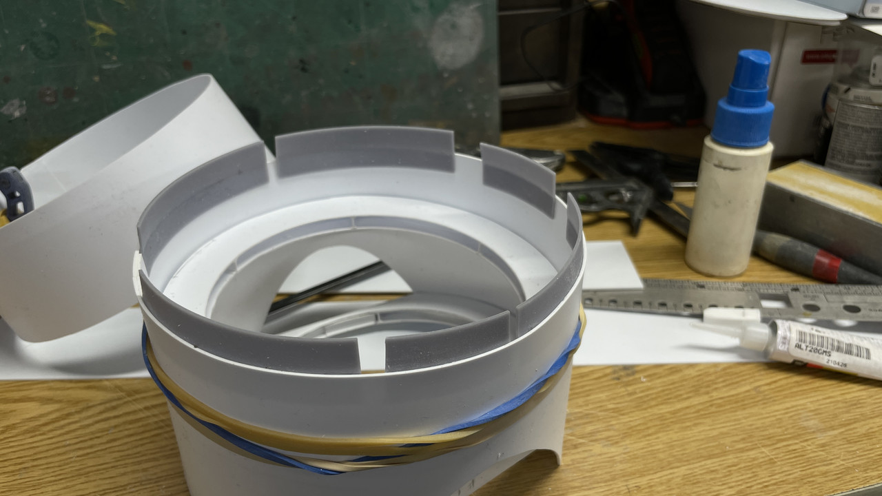 As you can see here in the best cross-section drawing I’ve found, the barbette joins the lower cylindrical bulkheads just at the crease at the junction of the tapered and straight sections. I needed to make a ring to fit this space. The shells are very flexible and not absoulutely round so capturing a perfect diameter was difficult. Notice that there’s some thick stuff on the other side of the taper/straight joint very similar to pieces that I 3D printed. Seems like life imitating art here.