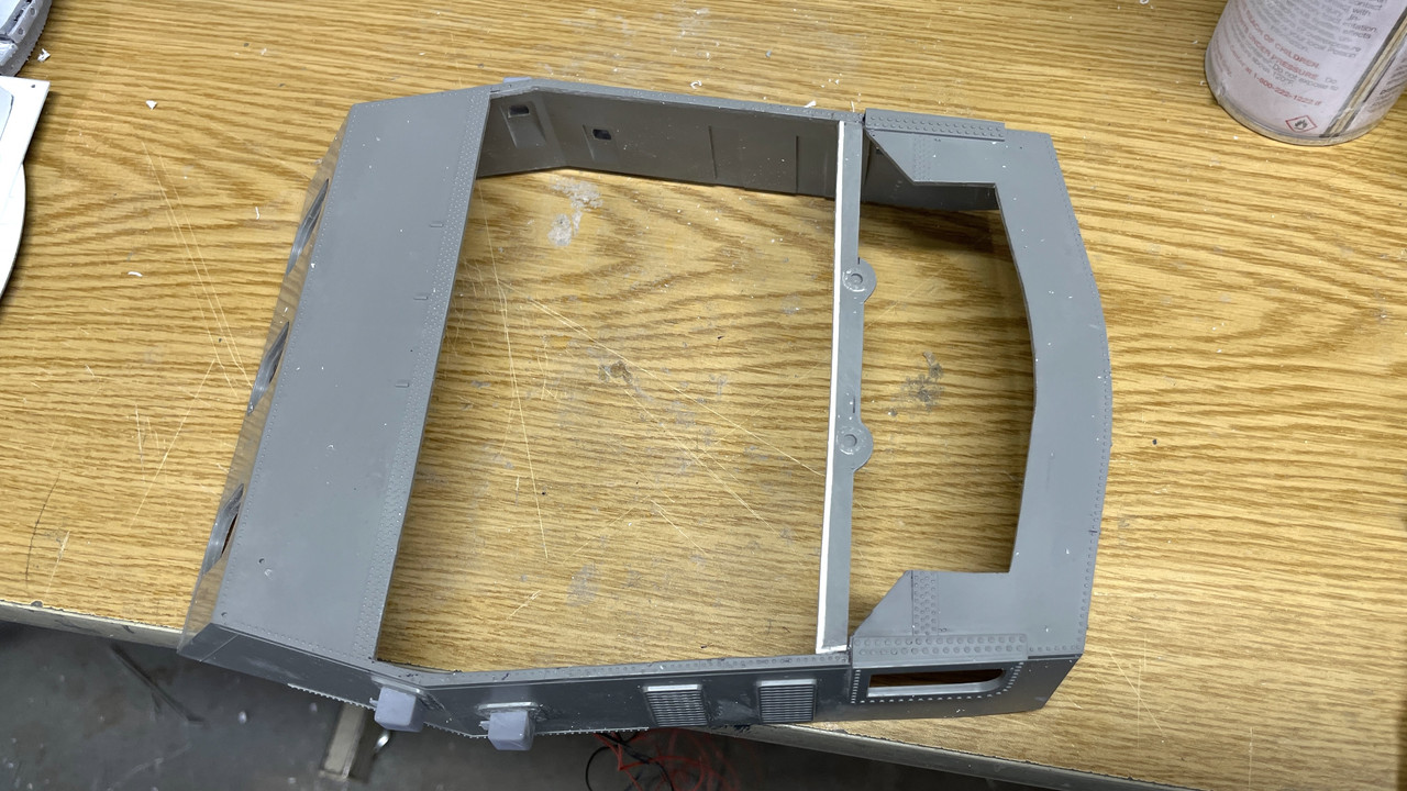 How to separate them. I thought of using a razor saw and quickly dispelled that idea. I had to cut not just the skin, but the inner skins on the doubled portions and all the way through the annual decks. I ended up using a rather large abrasive cutoff wheel intended for cutting steel. When you abrasively try to cut styrene you essentially melt your way through it, but through it I got. The cut was ragged and not particularly straight, but it was within the margin of error and was fixable.