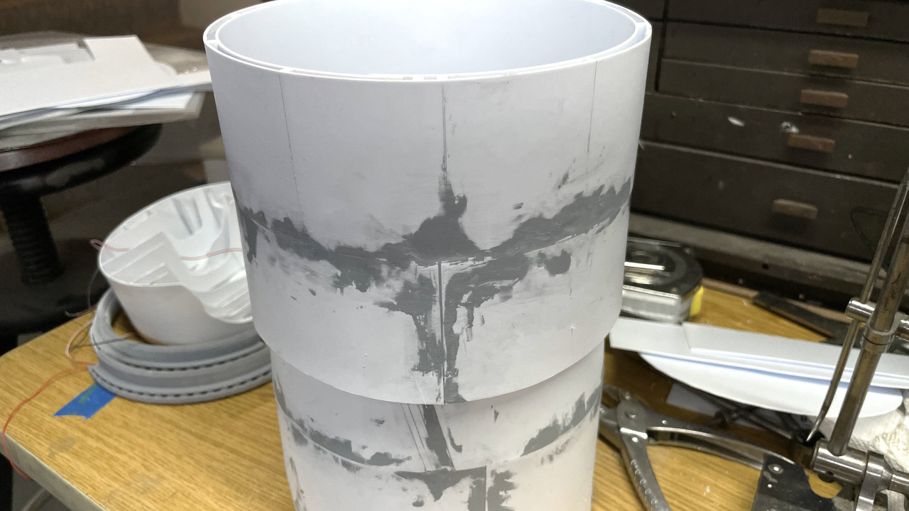 I cut out the tapered portion from the newly acquired styrene sheet using the glued-on-pattern method I used before. I glued the joint plate on one side, but did not glue the cone together. I waited to do this until the cone was almost entirely attached to the straight section, thereby taking up the slack as I went along and adjusting as I went.