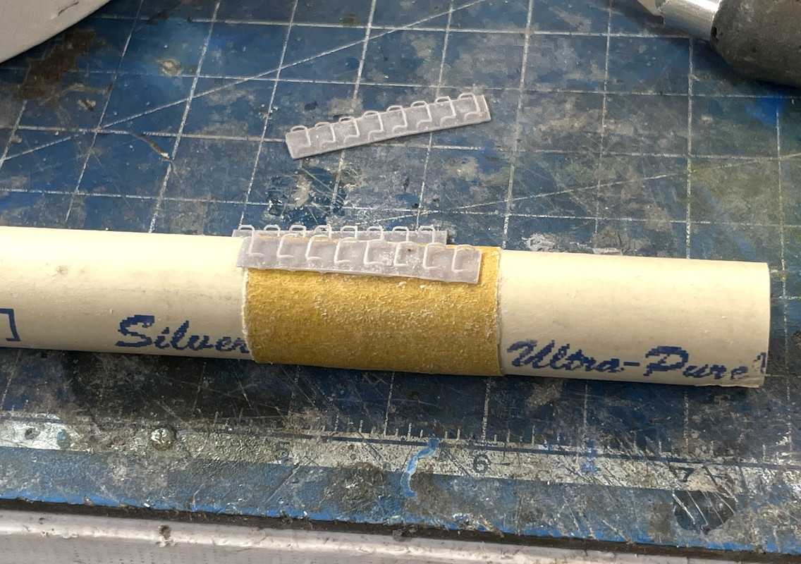 The ladder rung sets are cleaned up. I used a different end nipper with very sharp edges to carefully remove the supports attached to the rungs themselves and was rewarded with very little breakage. I got three perfect pieces out of the five. I used the Dremel with Flexi-shaft with a spherical diamond burr to clean off the majority of the support nubs on the back. I then attached a piece of self-adhesive fine grit sandpaper to the same piece of tubing that’s going to be the central column and finished sanded the back.