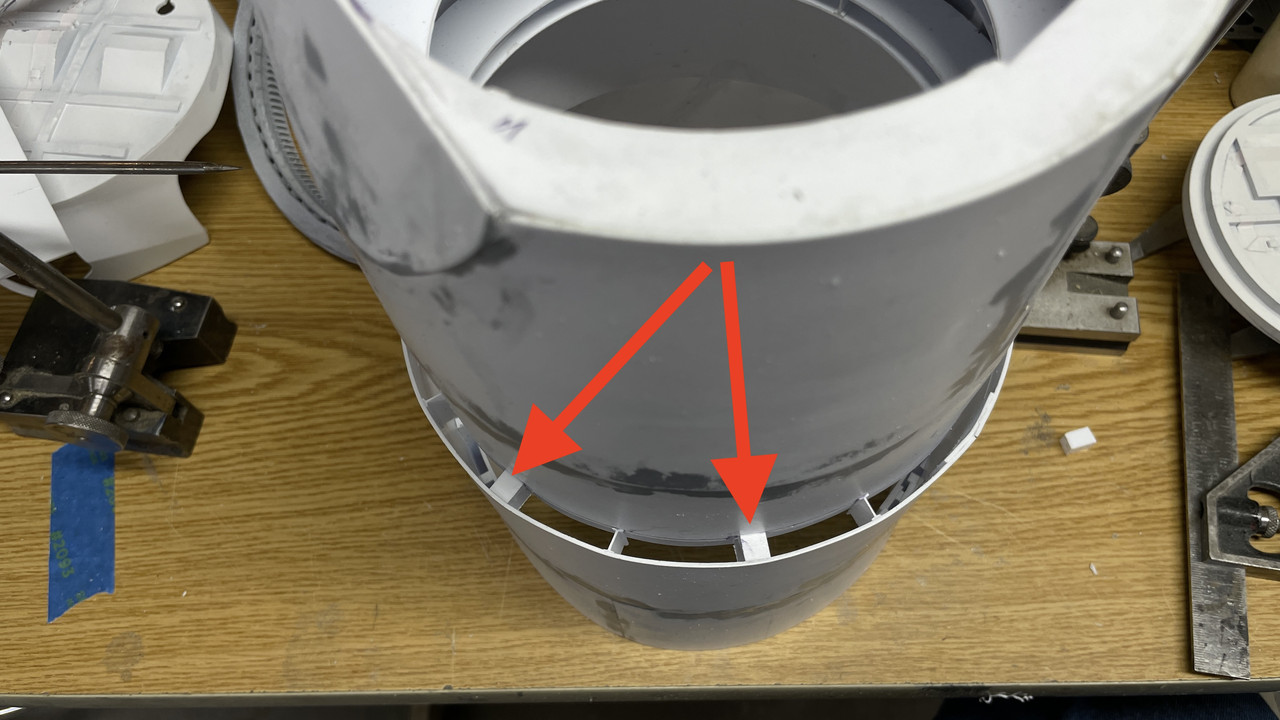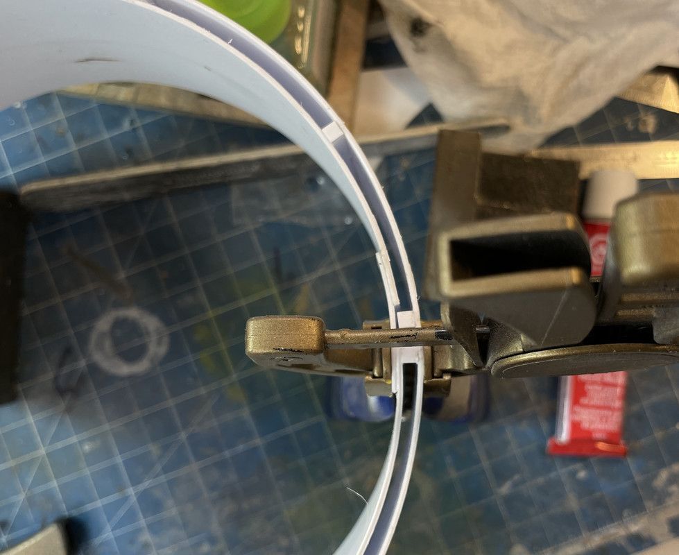 I needed to adjust the size of the upper projectile flat ring since the i.d. of the space where it’s going is slightly narrower than the lower projective flats ring and it was also impacted by the those junction pieces holding on the tapered section. I needed to get an i.d. measurement of this space. I even resorted to making a measuring device that I could transfer those inner diameters to set the calipers for circle cutting. My dividers didn’t open wide enough (just a skosh over 6") necessitating the creation of a makeshift measurement transfer device… two pieces of Plastruct I-beam and an aluminum clamp. This worked, but the measurement I kept getting was the same as the ring I already had. I ended up marking the ring where the junction peices were. I notched the ring leaving the lands to actually contact the cylinders walls.