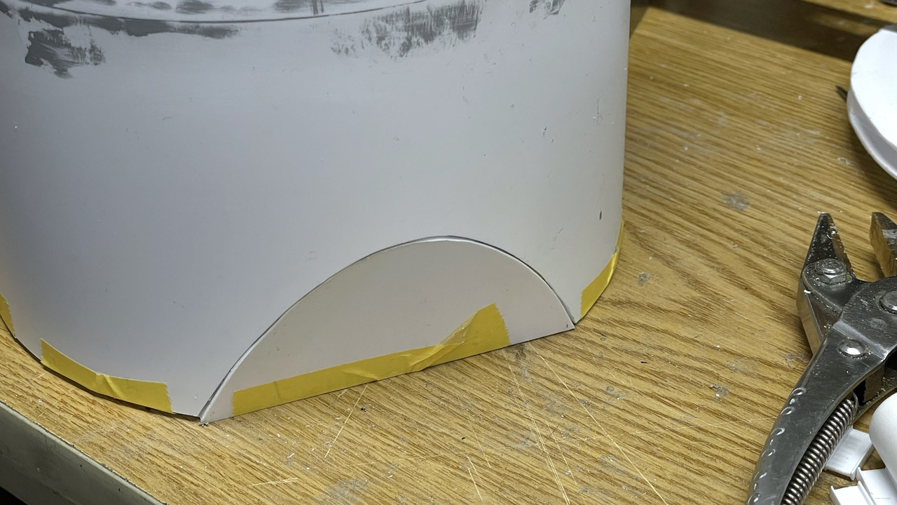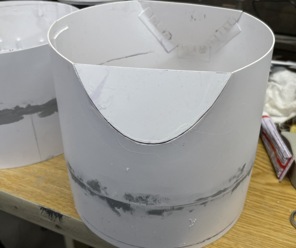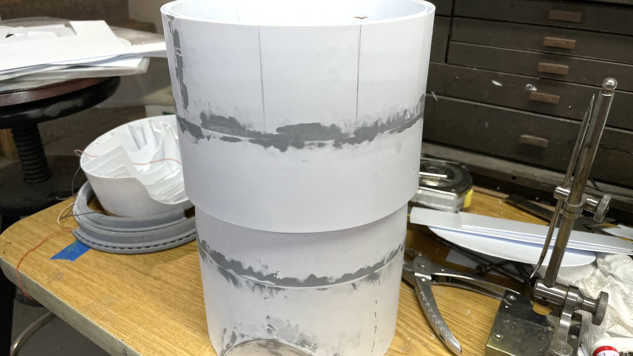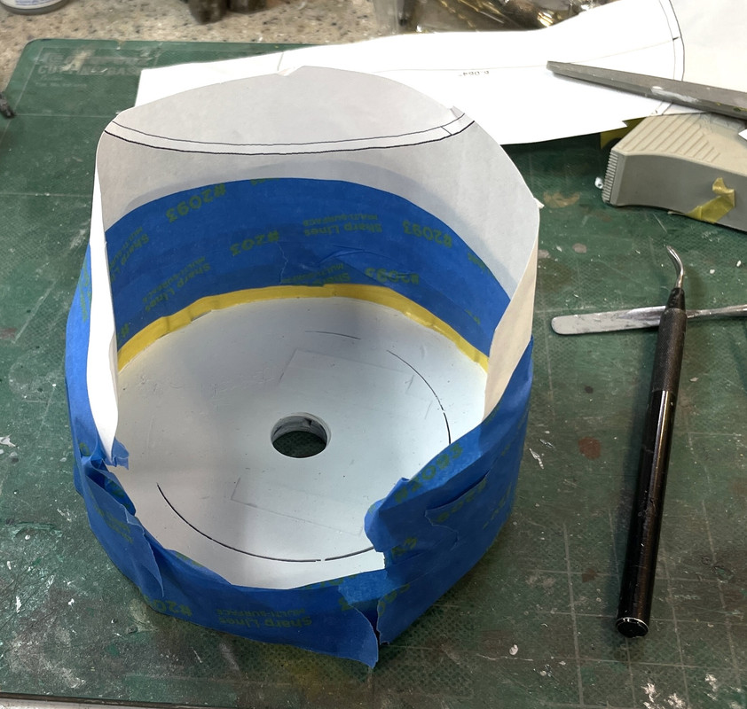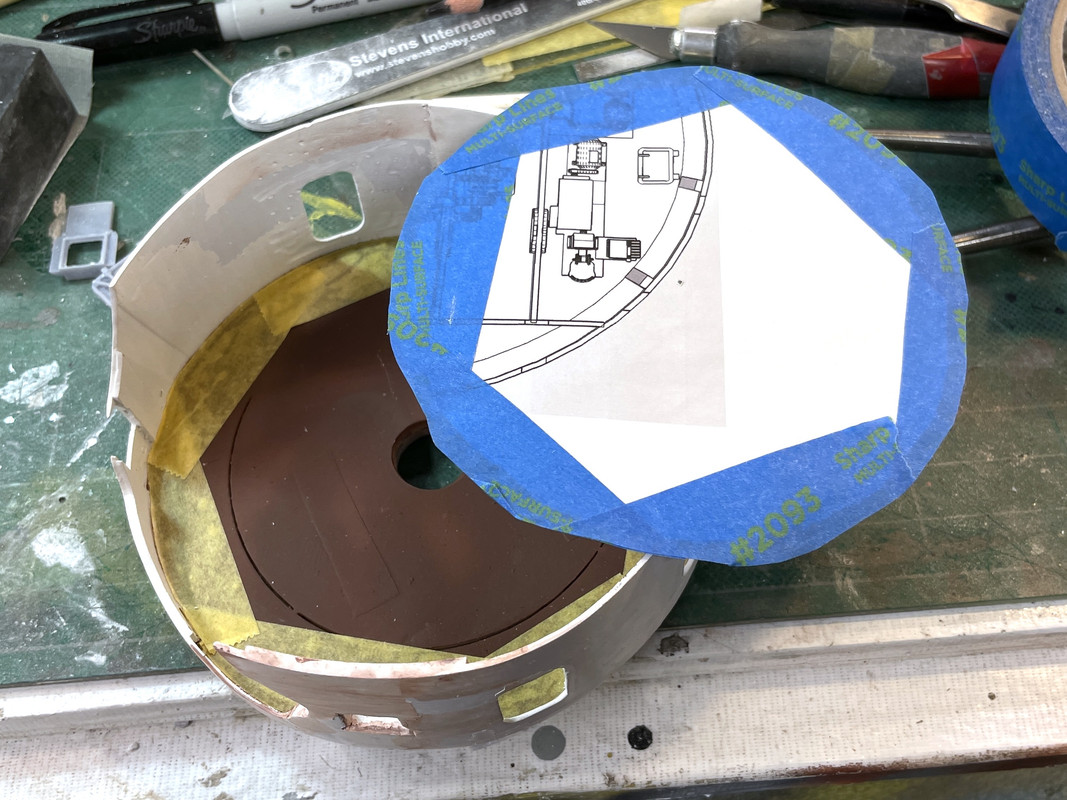 I also needed to get accurately cut truncate pieces. My first attempt at tracing the opening was way off becuase I was tracing the opening WITHOUT the bottom ring to stabilize the cylinder. As I pressed the cylinder down on the sheet stock to trace the opening it distorted and the cut piece didn’t fit. It re-did it, but this time with the ring installed and taped in place. I got two good tracings. I then did some final fitting and taped it in the opening to see how it worked.