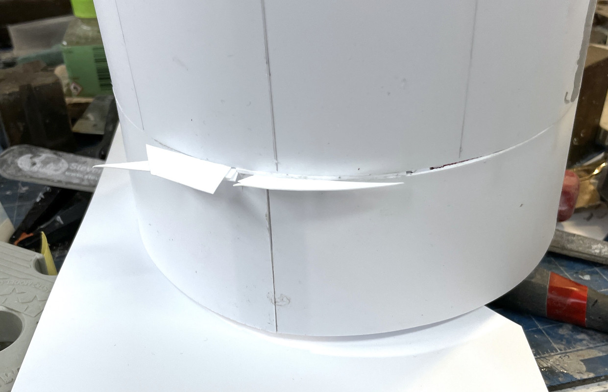 As with the other pattern-taken-from-SU-Unwrp and Flatten parts that I cut, there was a length discrepency here as well. In this case the flat part was short. To close this gap I’m filling it with some thing strips to better conform to a curve that would be difficult with such a narrow single piece. I can do wonders with filler and it will be fine. Besides, this is at the back of the model and will be covered by the upper barbette shell so it will be out of sight.