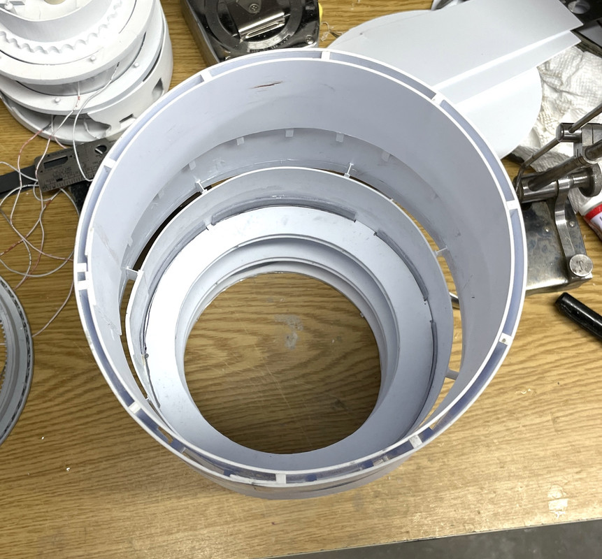 All the filling is now done. I test fit the rings to make sure I could assemble them with the truncated parts now glued in. I was able to put the lower ring in by angling it, and getting in the upper two circular annular decks from the top. They all fit nicely.